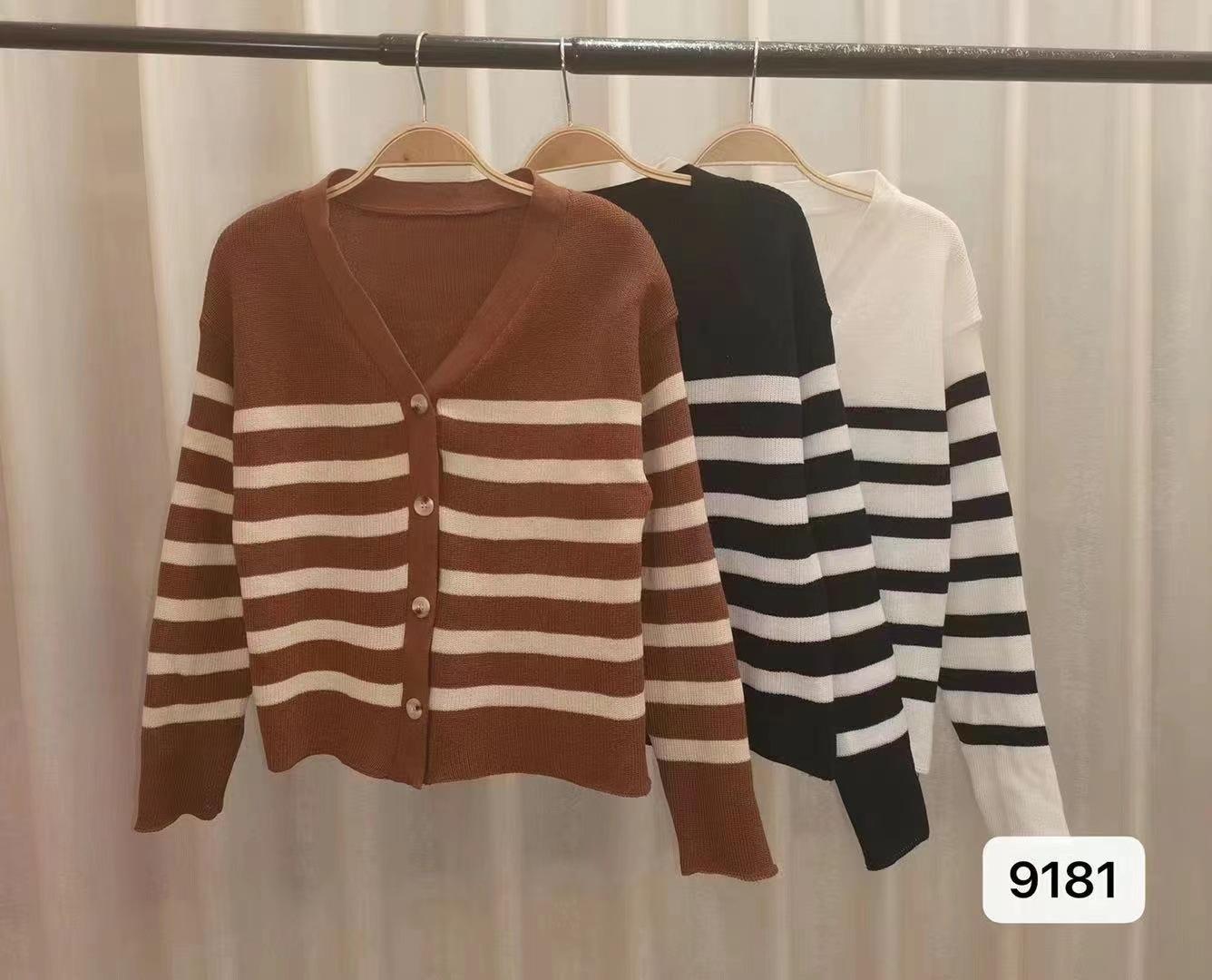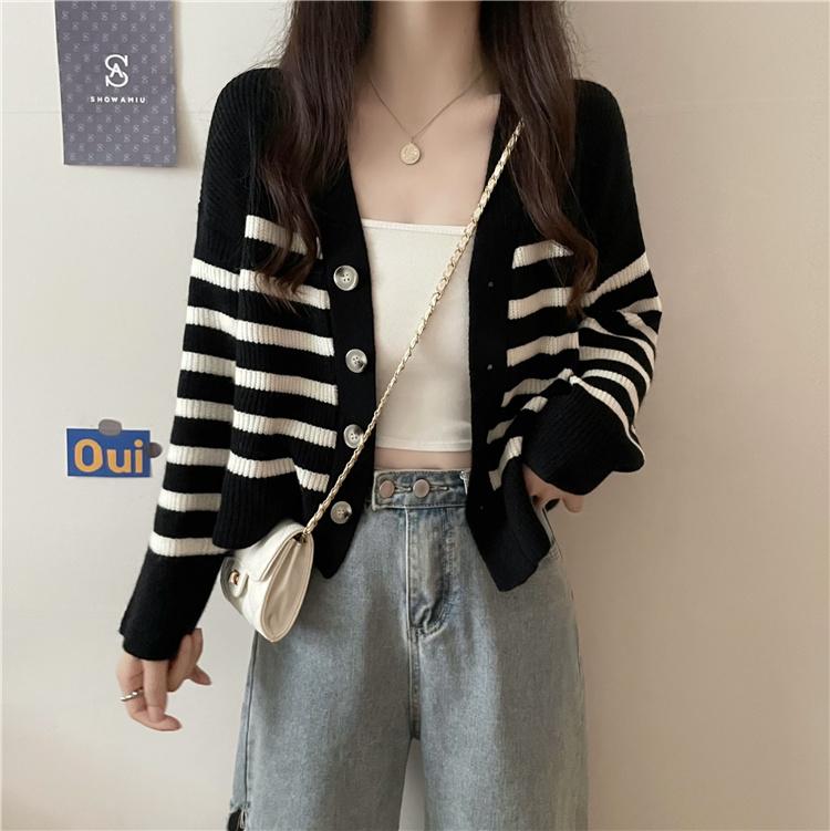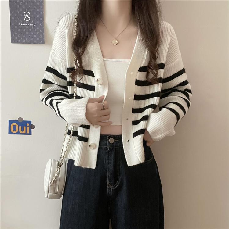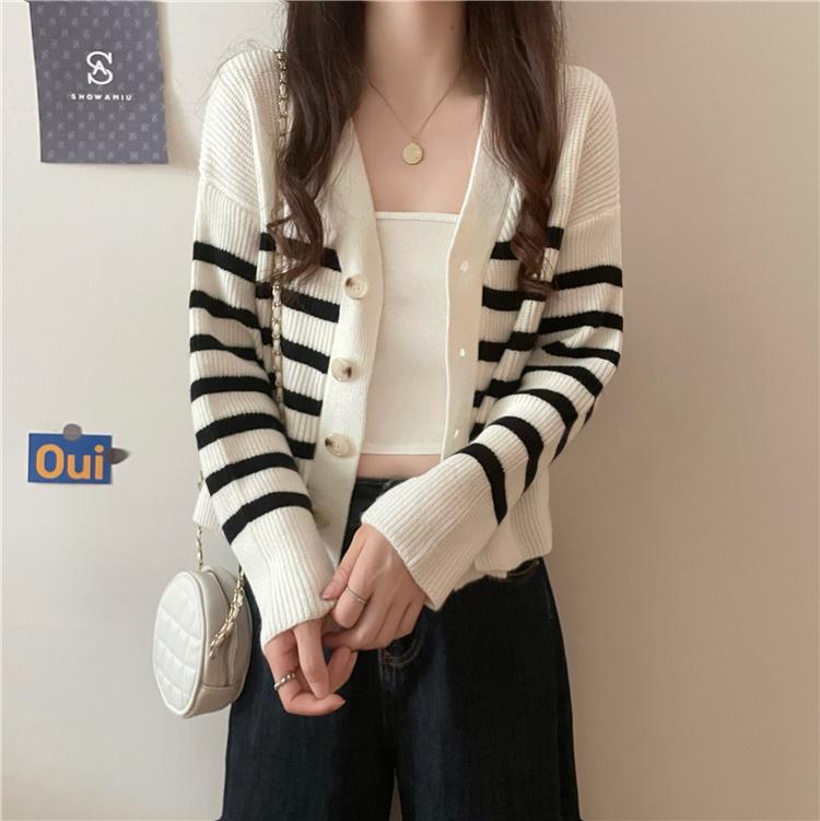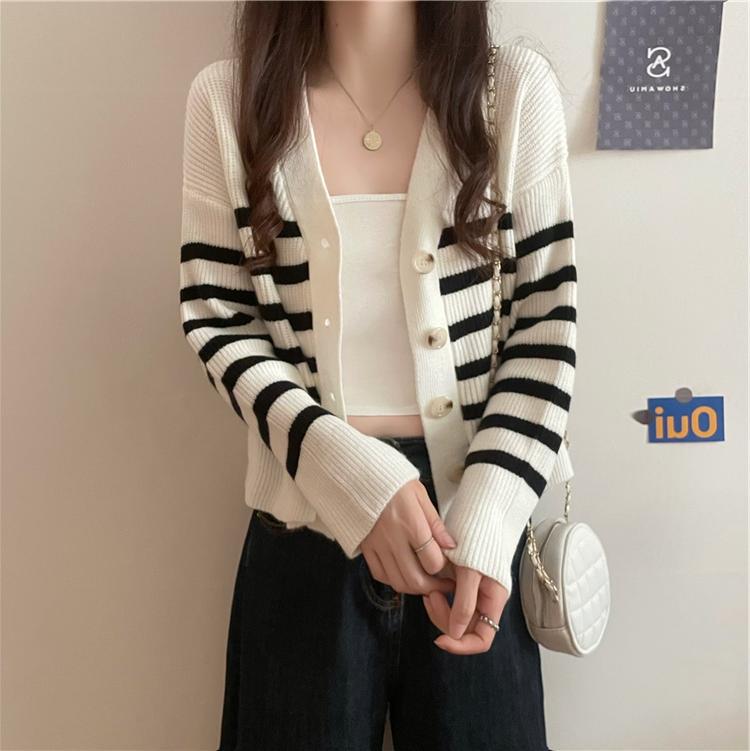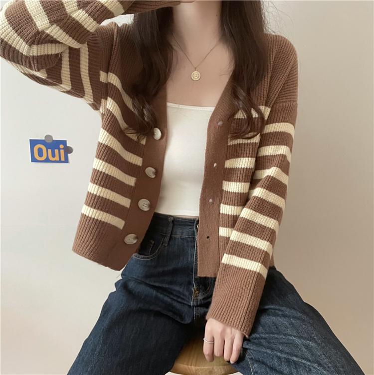 Cardigan Tricotado Listrado Feminino Outono e Inverno 2026 Novo Solto Estilo Coreano Estilo Preguiçoso Jaqueta Suéter Manga Longa Decote V