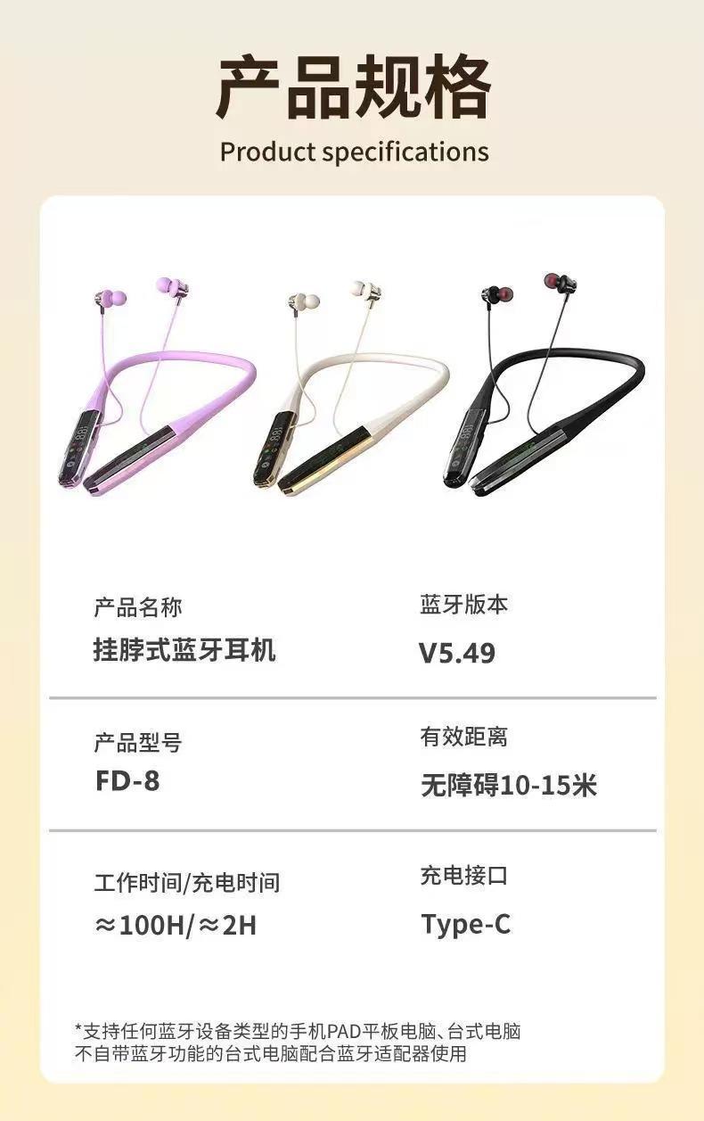 FD-8 Pendurado no Pescoço Transfronteiriço Novo Alta Qualidade de Som Bluetooth 5.4 Confortável de Usar Longa Resistência Display Digital Modelo Privado Universal