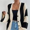 Jaqueta feminina de malha de manga comprida estilo Chanel, estilo novo, fina, gola redonda, cor contrastante, justa, curta, para uso externo
