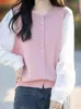 Suéter falso de duas peças estilo coreano de outono para mulheres, versátil, cor contrastante, manga comprida, suéter macio e encerado, cardigã