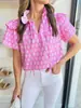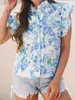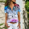 Camisa de chiffon com estampa de tinta feminina, nova chegada de verão, estilo Hong Kong, elegante, leve, luxuosa, combinando, com decote em V, flor, manga curta