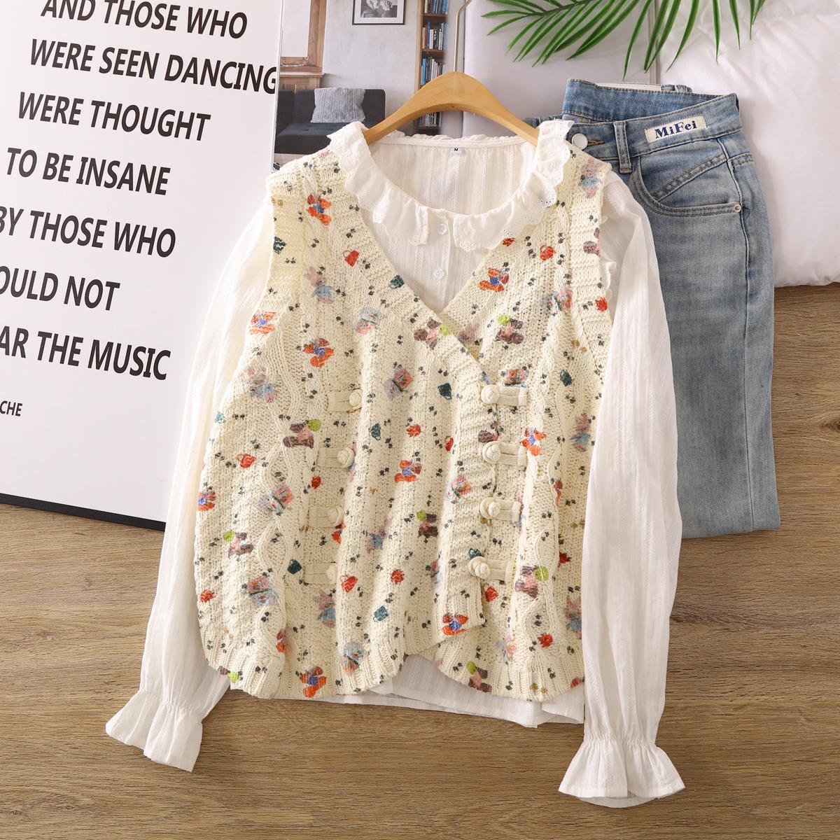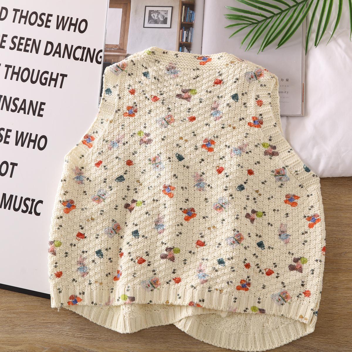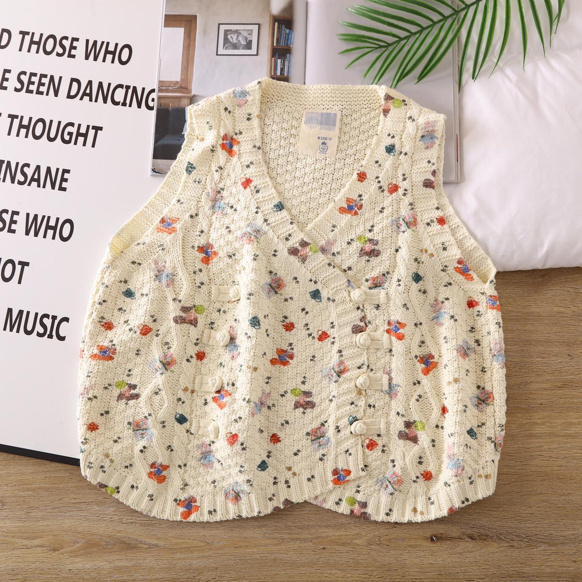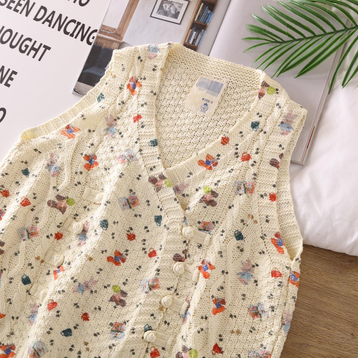 Colete retrô artístico com estampa pastoral fresca de outono de 2024, decote em V, novo colete de malha de algodão para todos os gostos