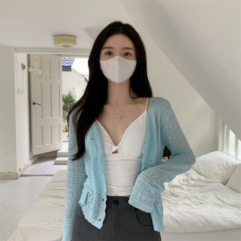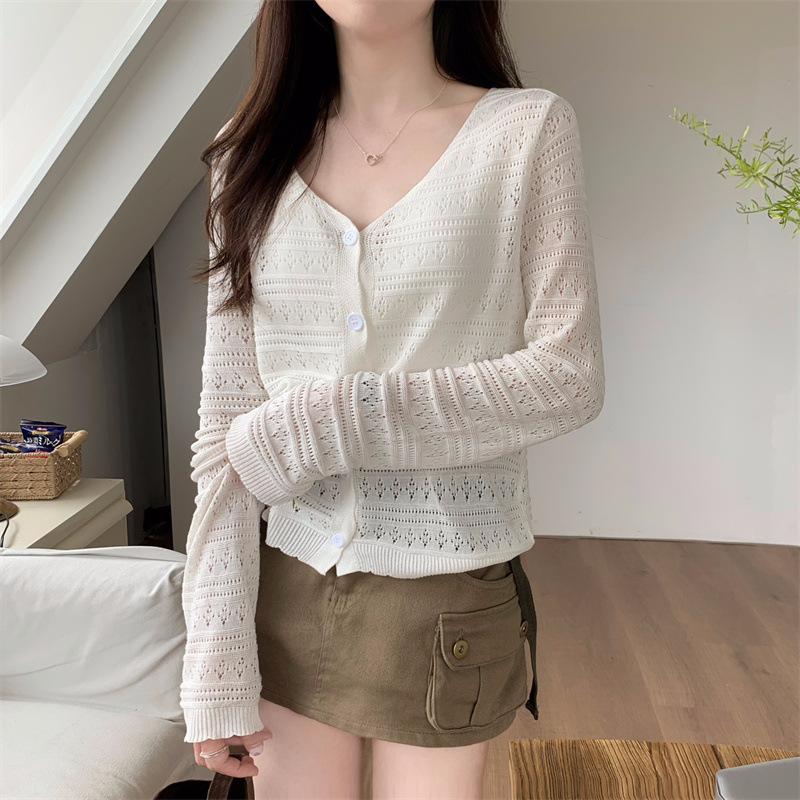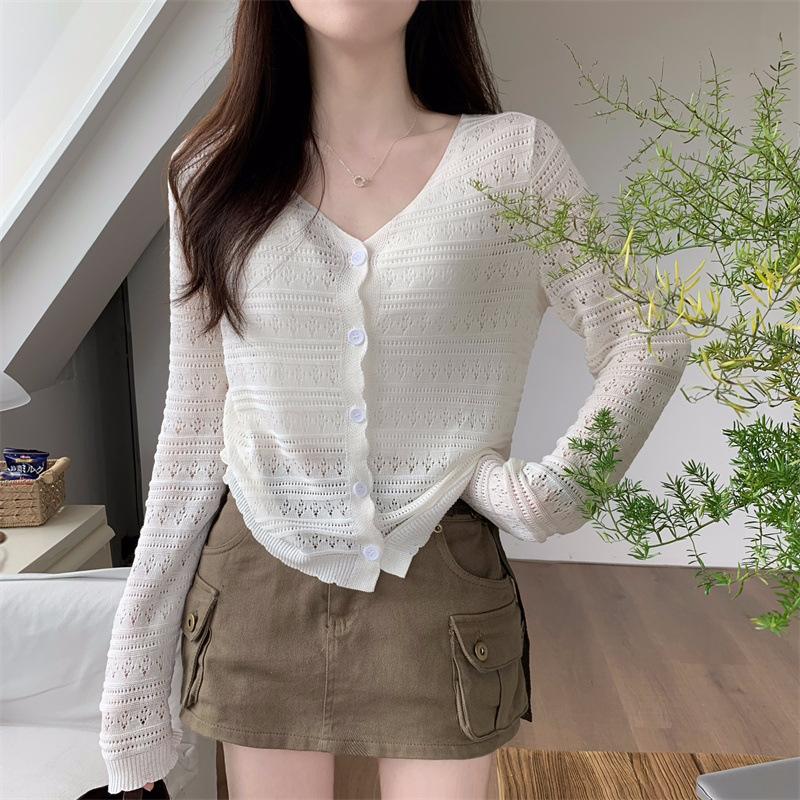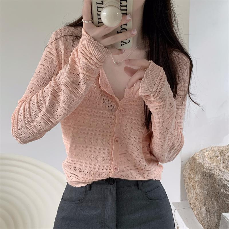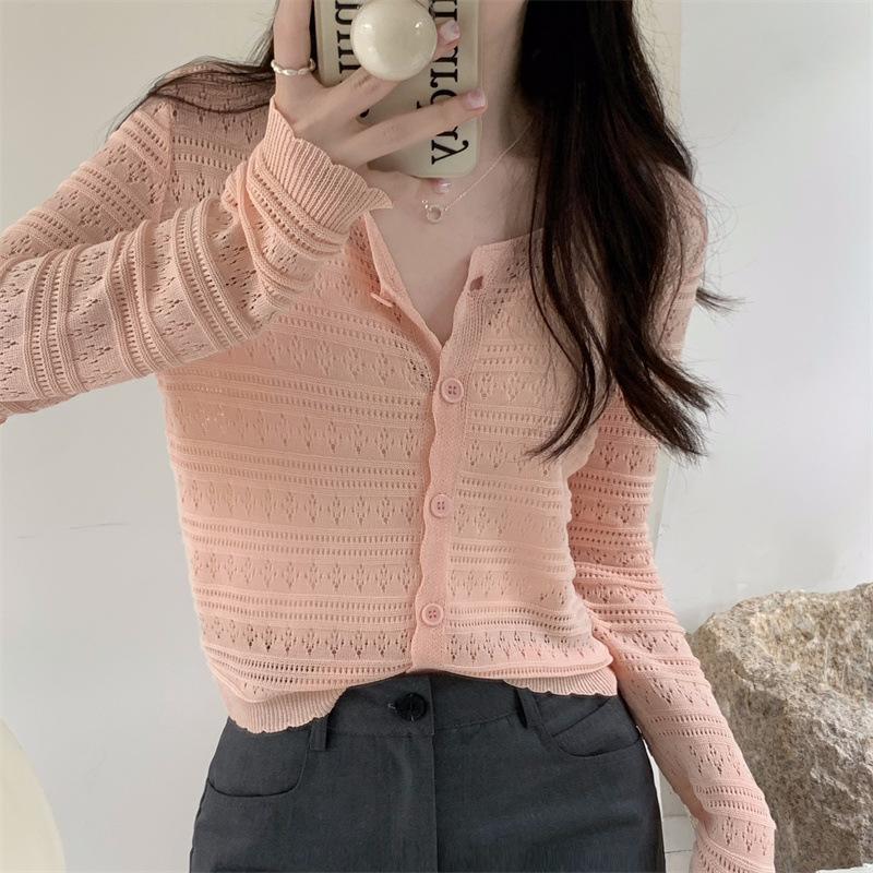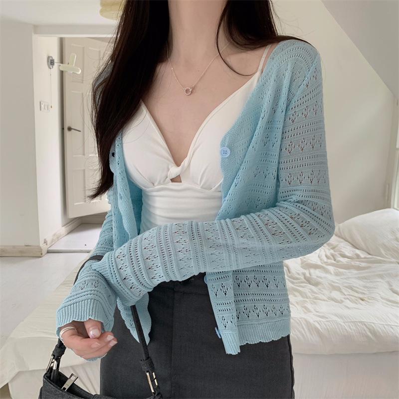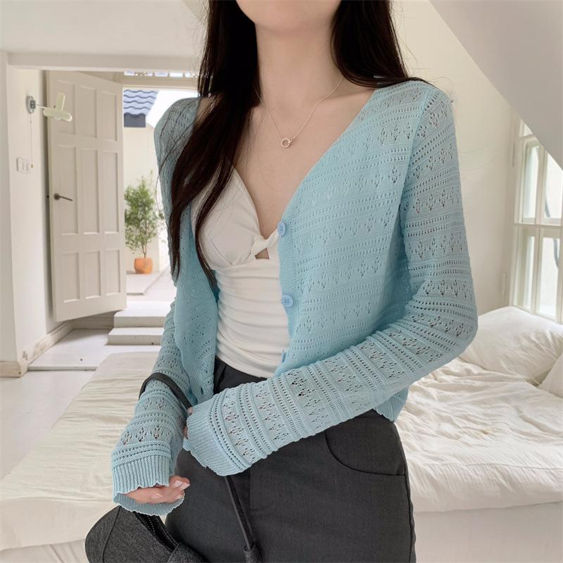 Cárdigan de Punto Calado para Mujer Abrigo Delgado de Verano Seda de Hielo Protector Solar Camisa para Aire Acondicionado Chal Exterior Manga Larga Top Corto