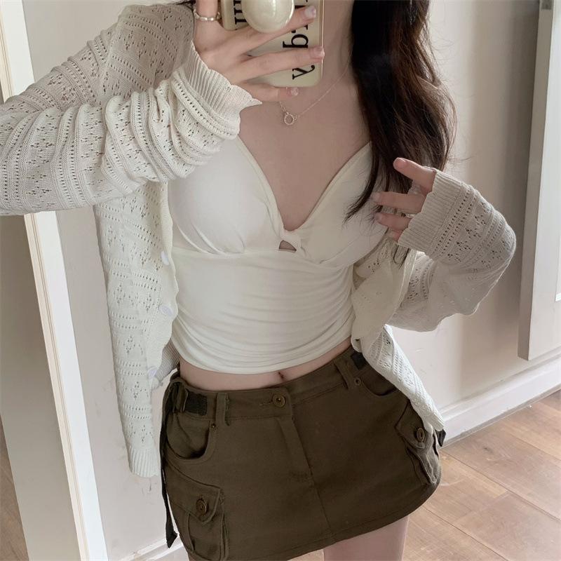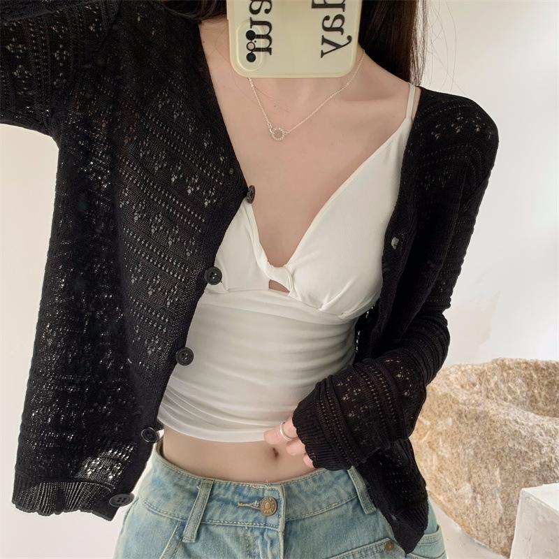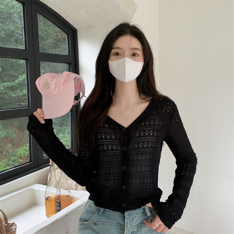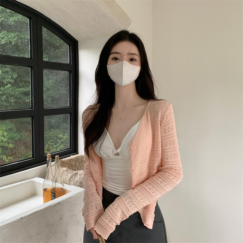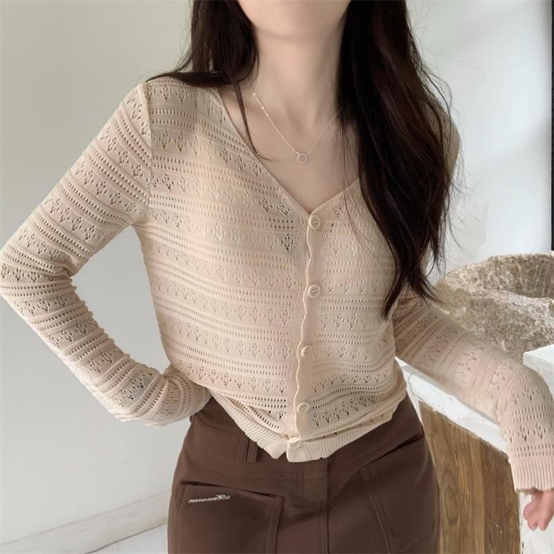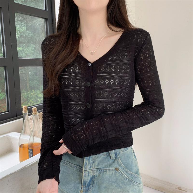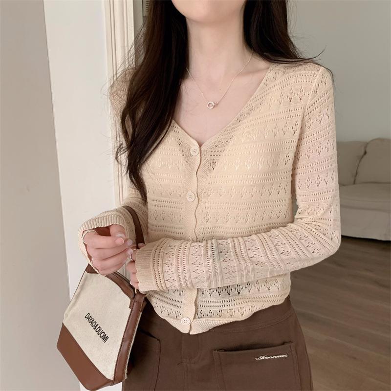 Cárdigan de Punto Calado para Mujer Abrigo Delgado de Verano Seda de Hielo Protector Solar Camisa para Aire Acondicionado Chal Exterior Manga Larga Top Corto