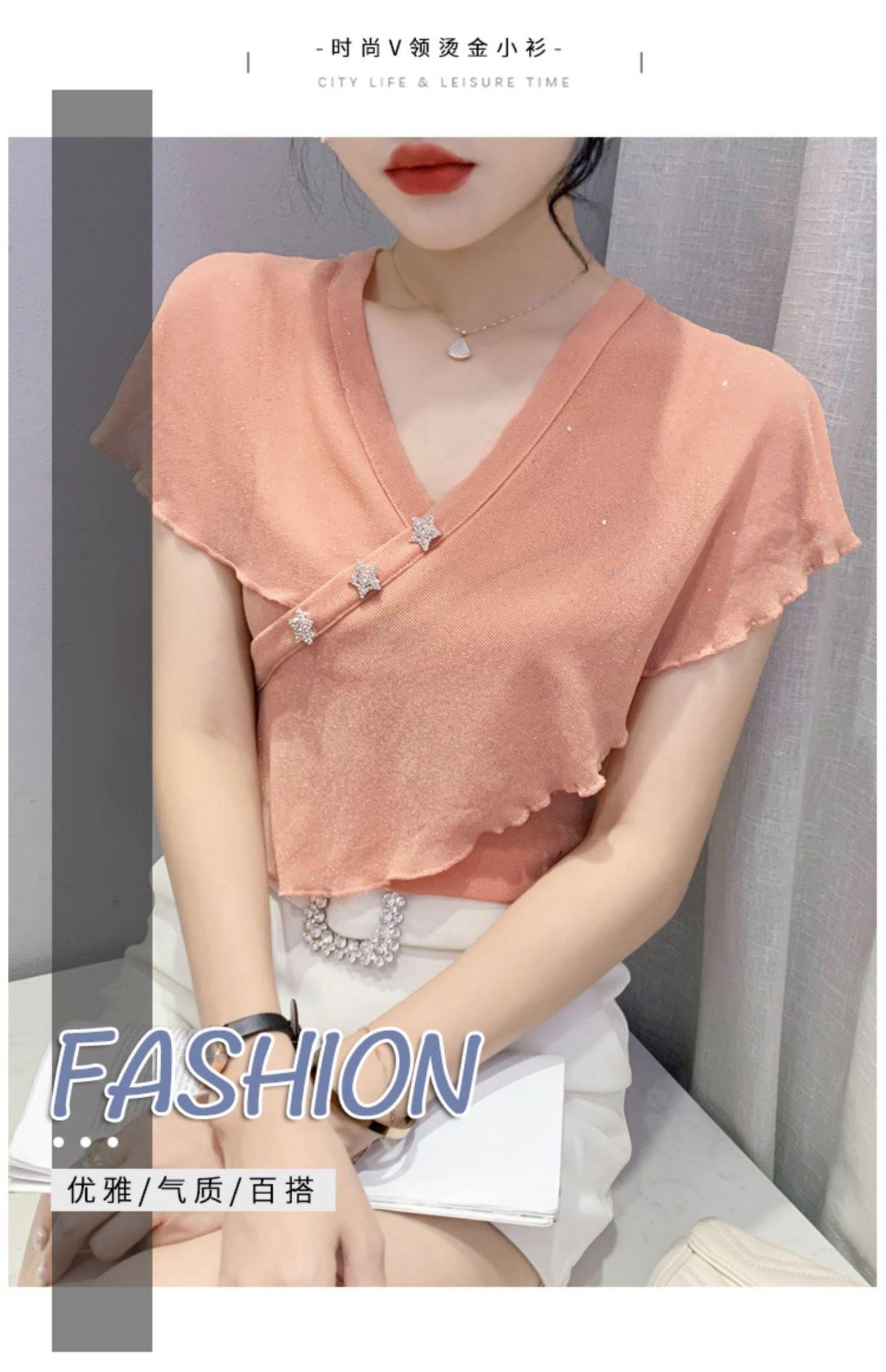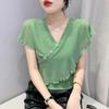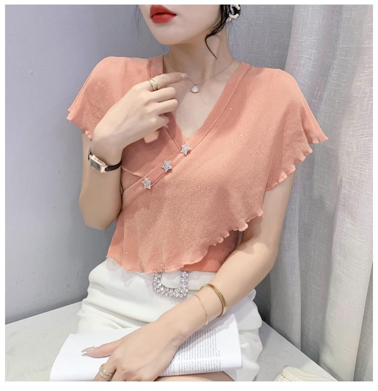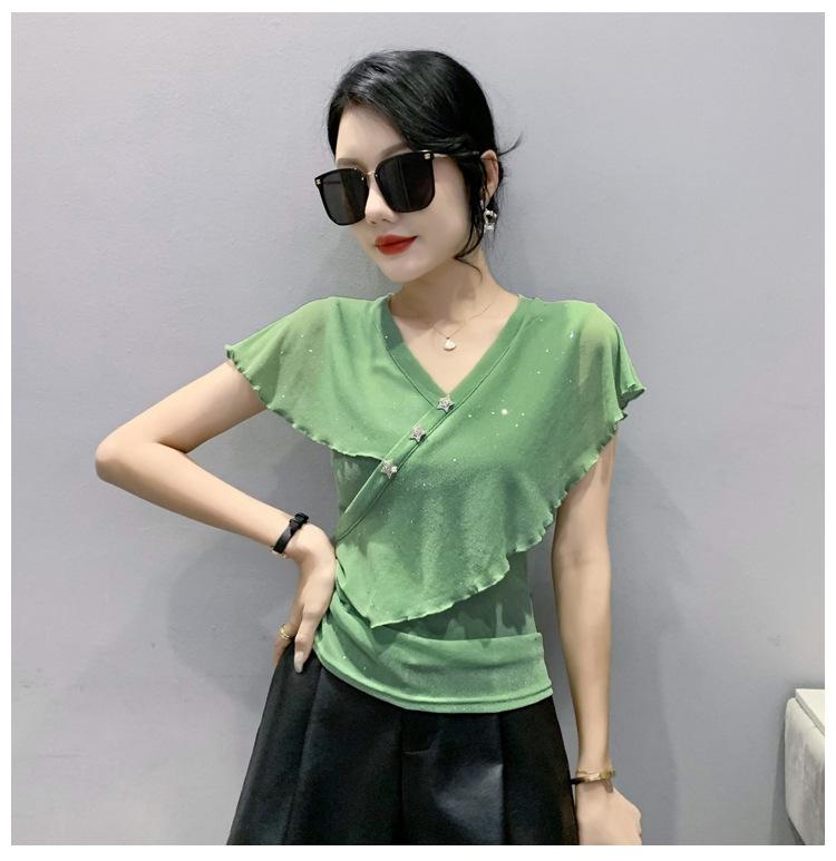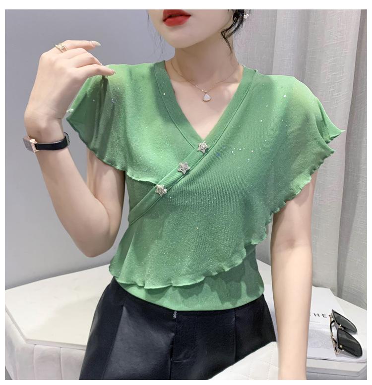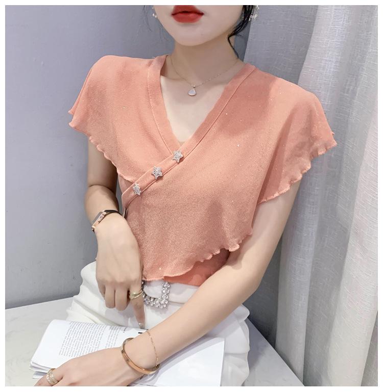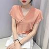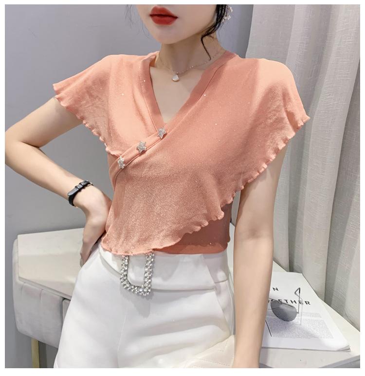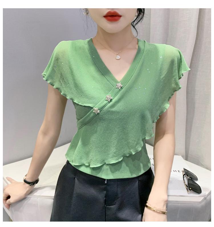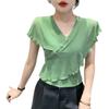 Camiseta elegante estilo coreano com decote em V, verão 2025, nova blusa estilo ocidental com babados, blusa pequena de malha elástica com ajuste fino