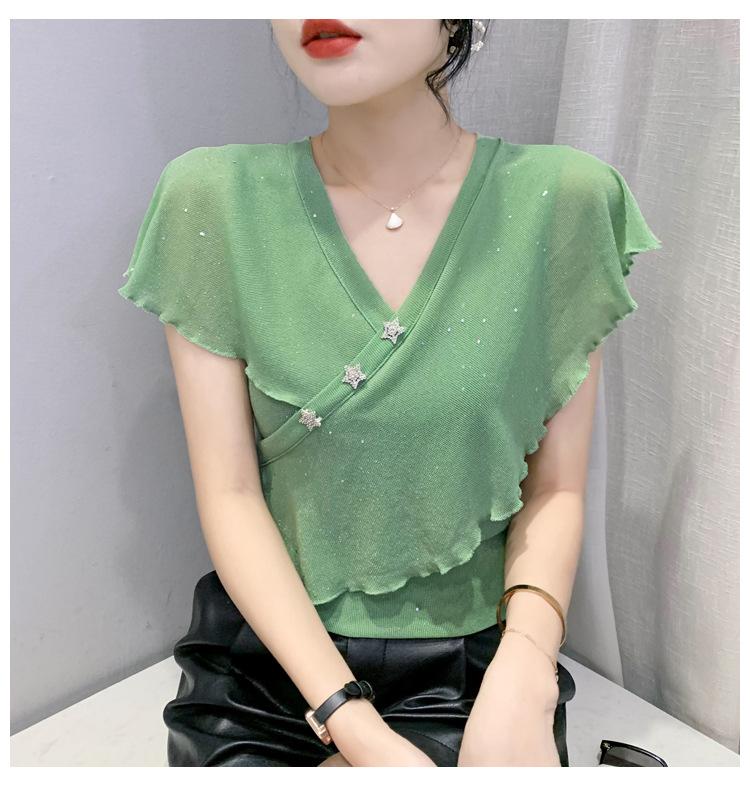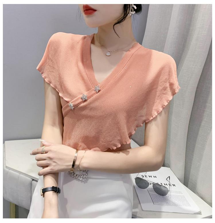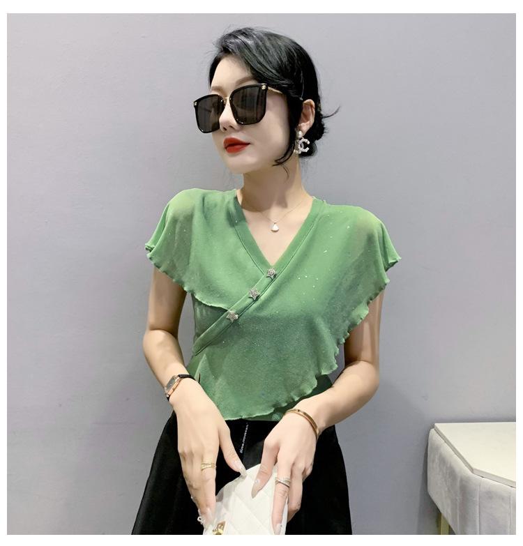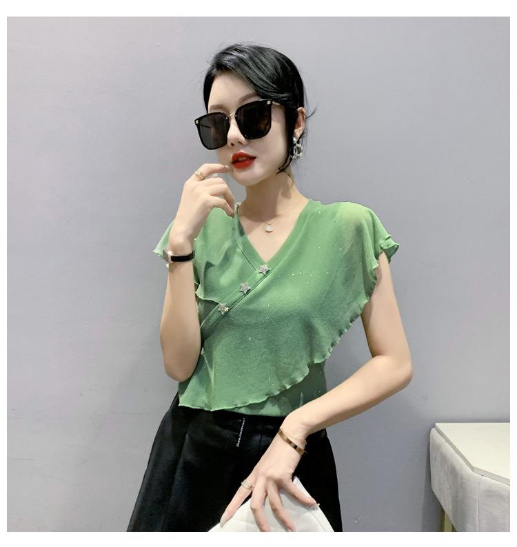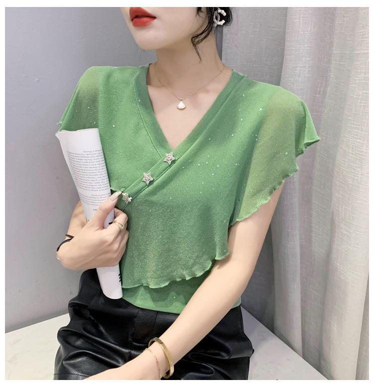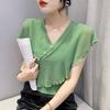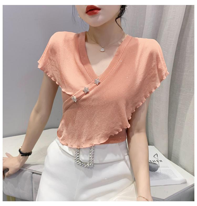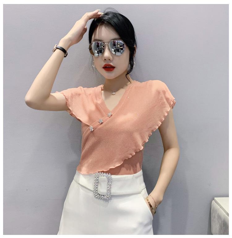 Camiseta elegante estilo coreano com decote em V, verão 2025, nova blusa estilo ocidental com babados, blusa pequena de malha elástica com ajuste fino
