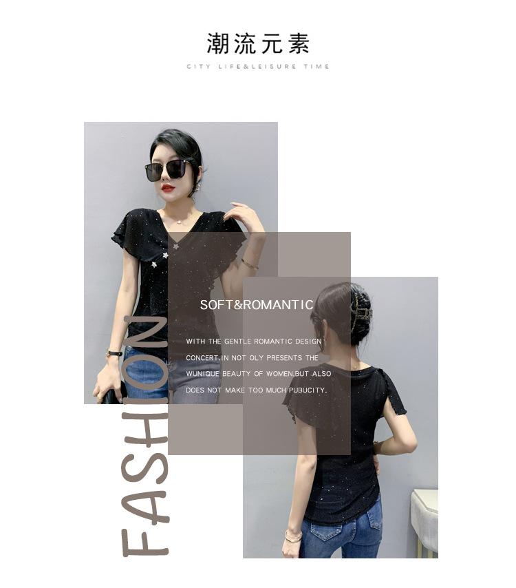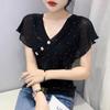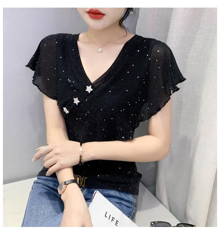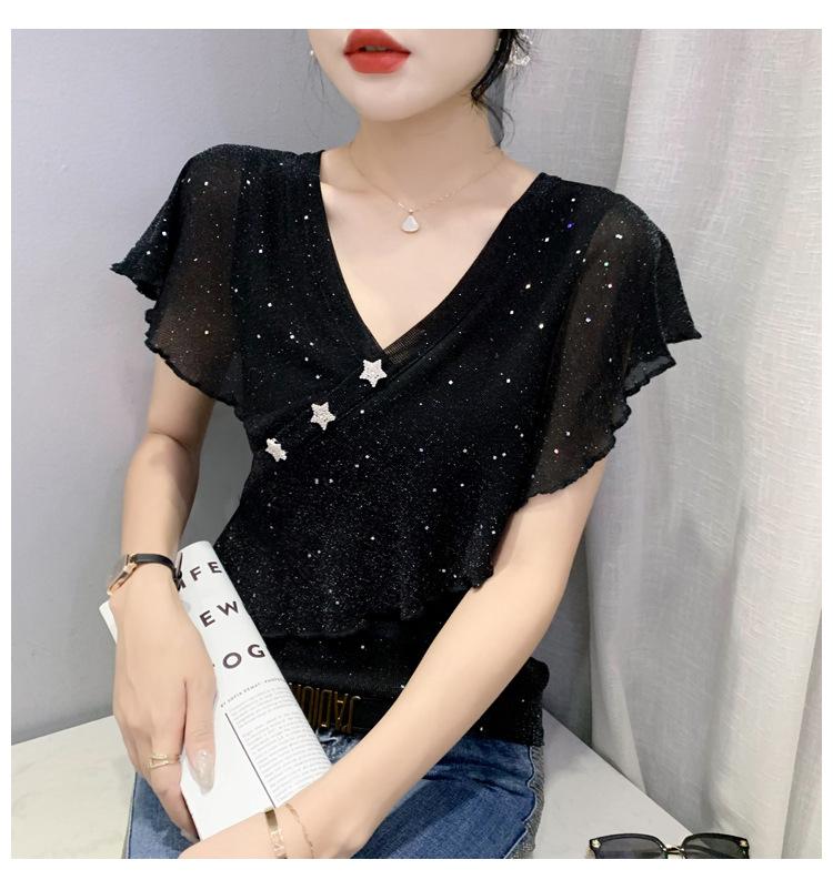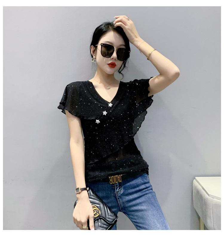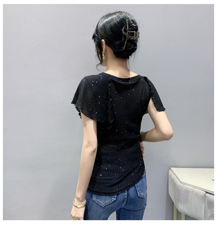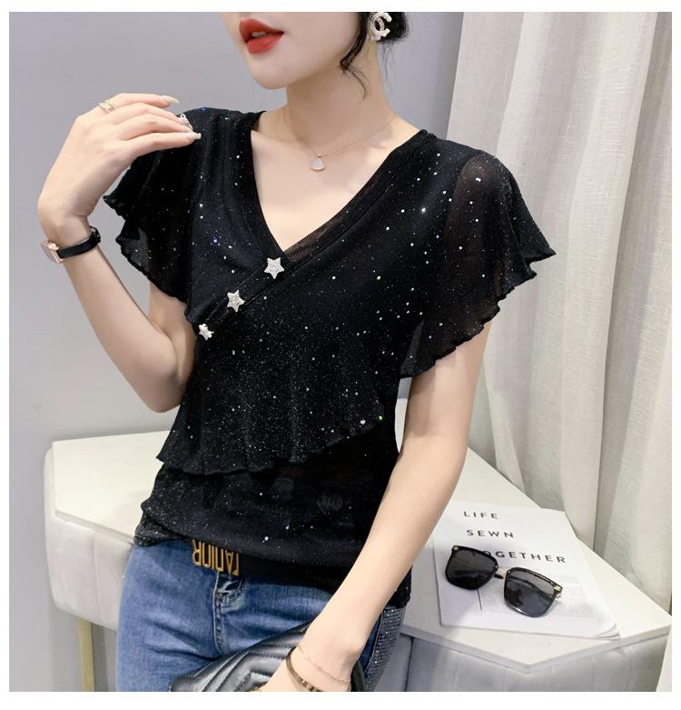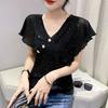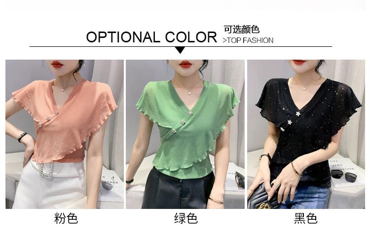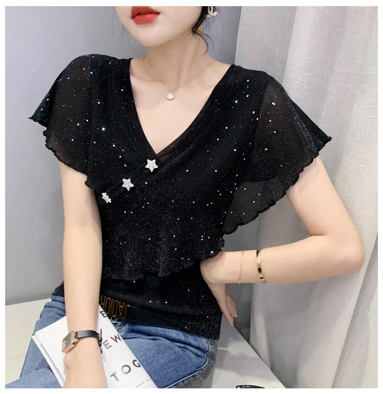 Camiseta elegante estilo coreano com decote em V, verão 2025, nova blusa estilo ocidental com babados, blusa pequena de malha elástica com ajuste fino