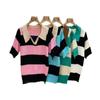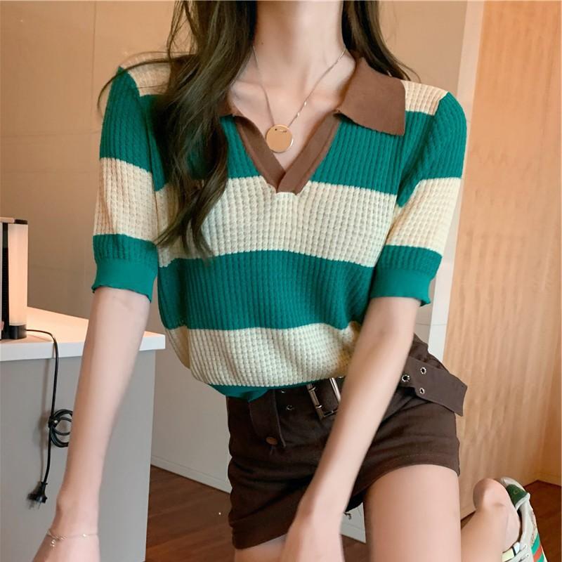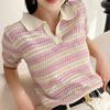 Suéter listrado com gola polo e manga curta, camiseta verão 2024, nova moda casual, solta e versátil
