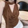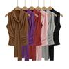 Colete Sem Mangas com Gola Balanço para Mulheres 2024 Verão Novo Estilo Europeu e Americano Slim Plissado Ajustado Top com Cadarço