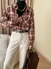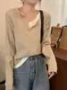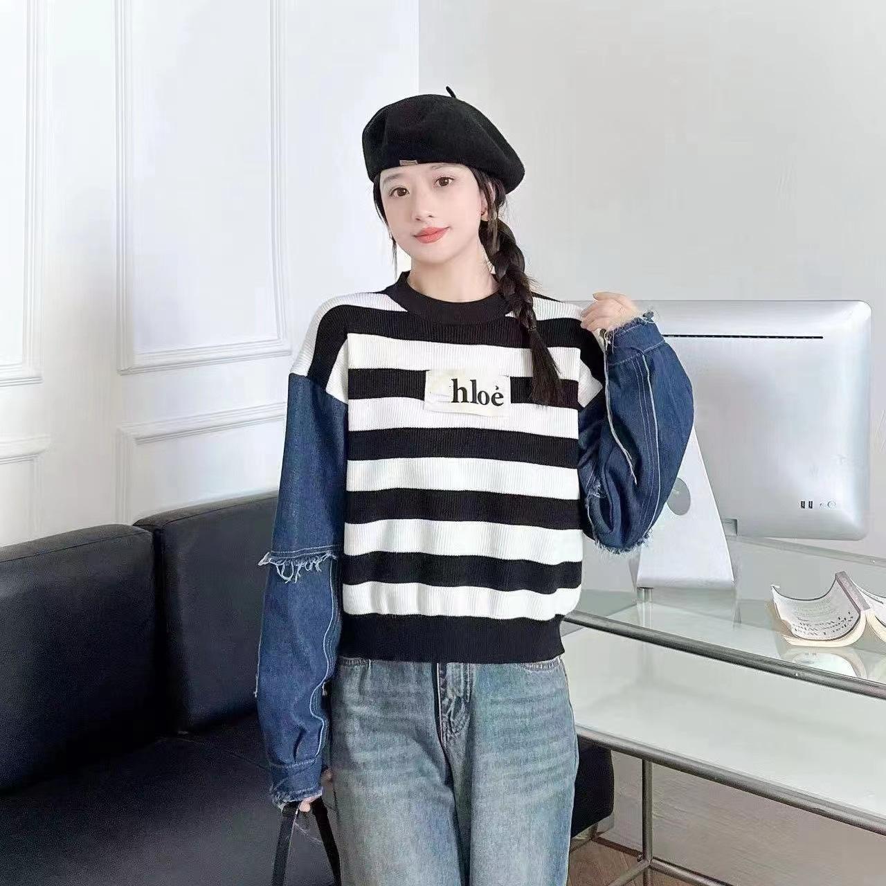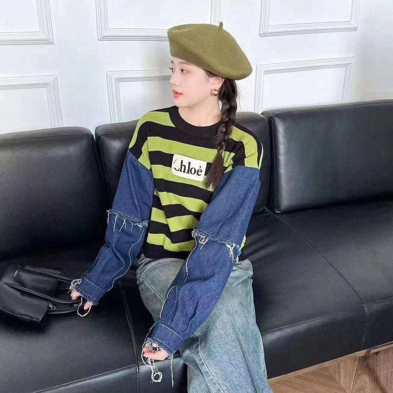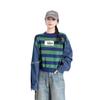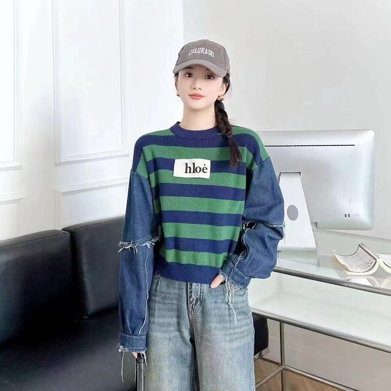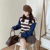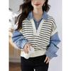 Outono e inverno Novo suéter listrado solto feminino senso de design espessado costura falsa de duas peças manga de camisa jeans top de malha