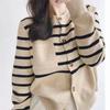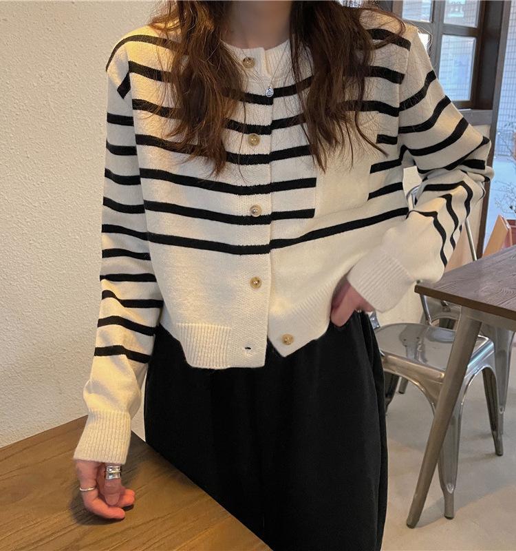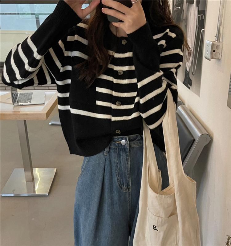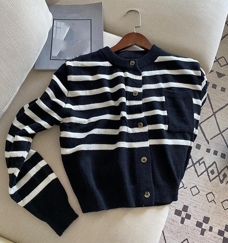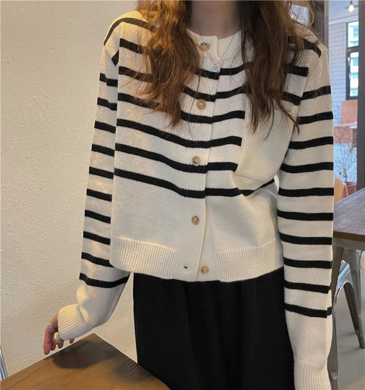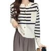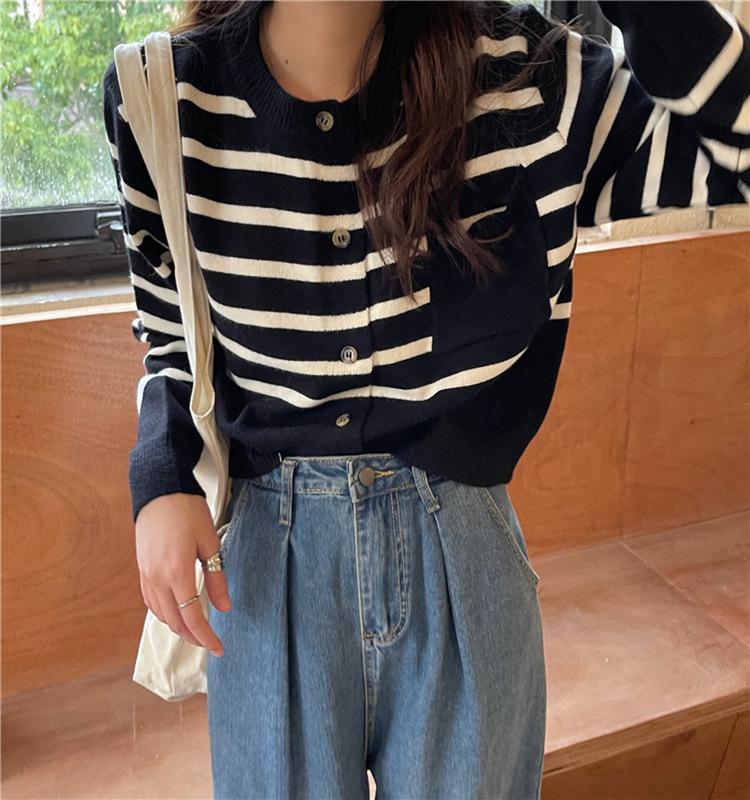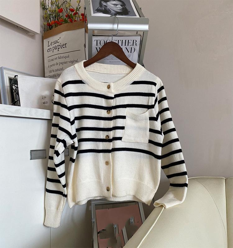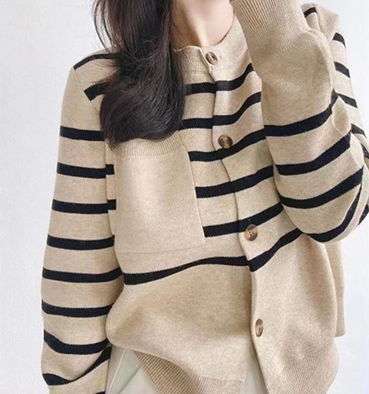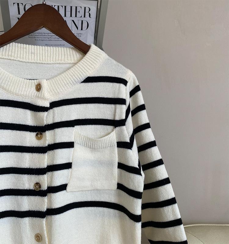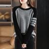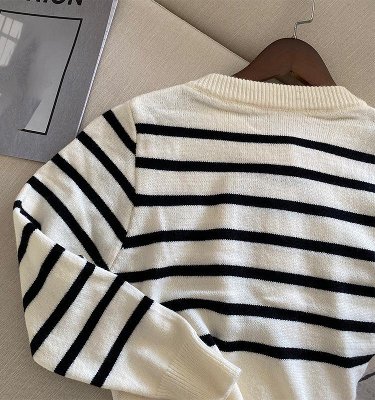 Início do outono de 2024 Nova moda All-match listrado manga comprida gola redonda suéter All-match elegante base suéter top para mulheres