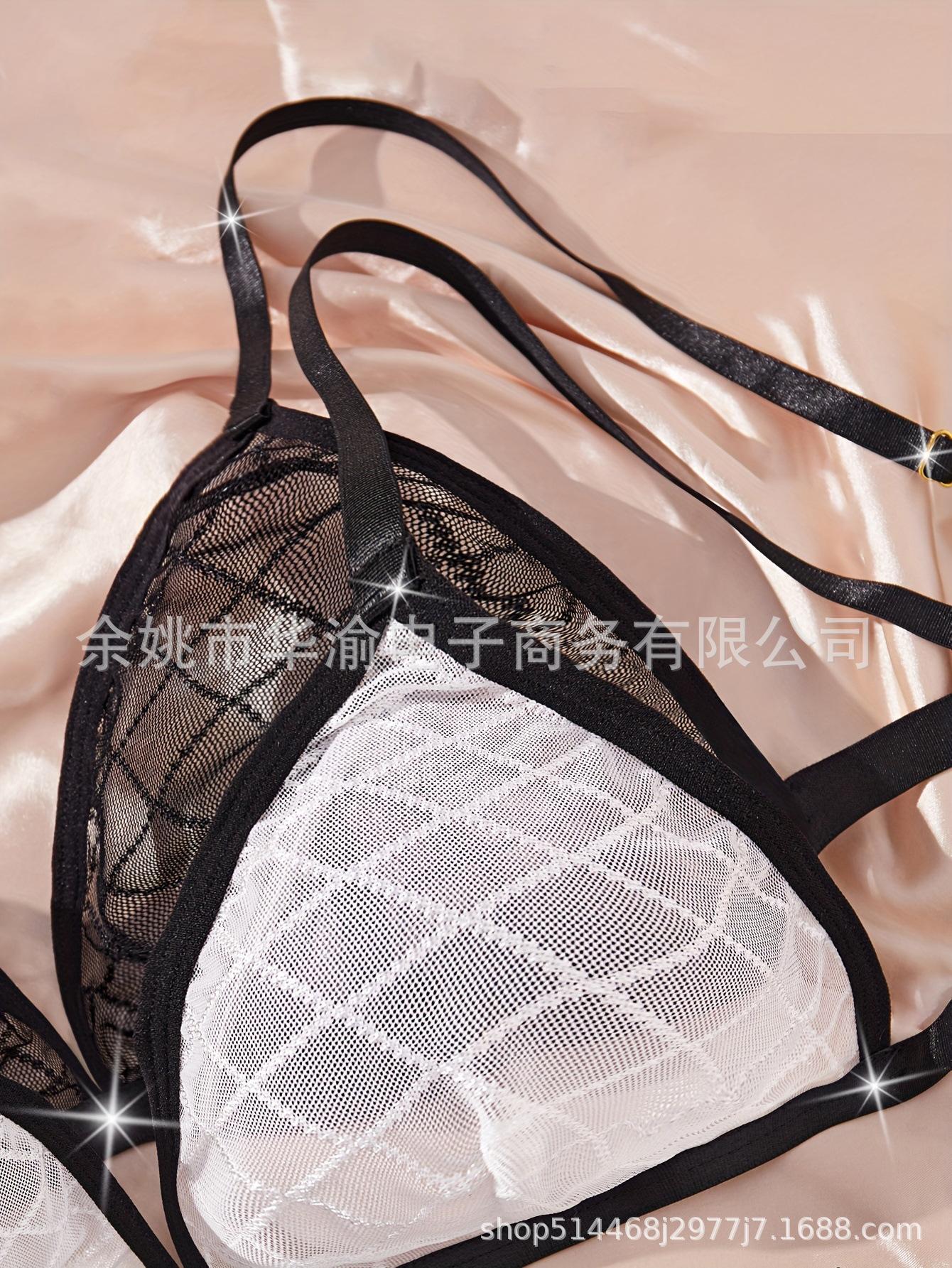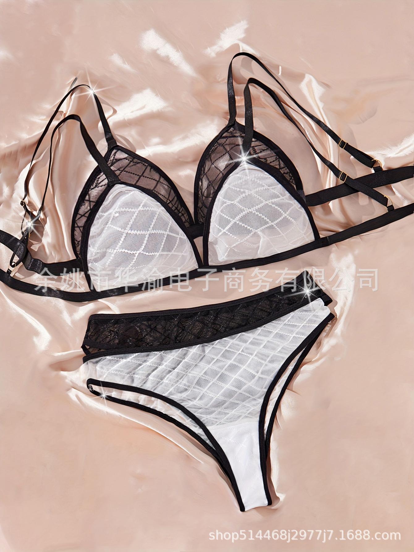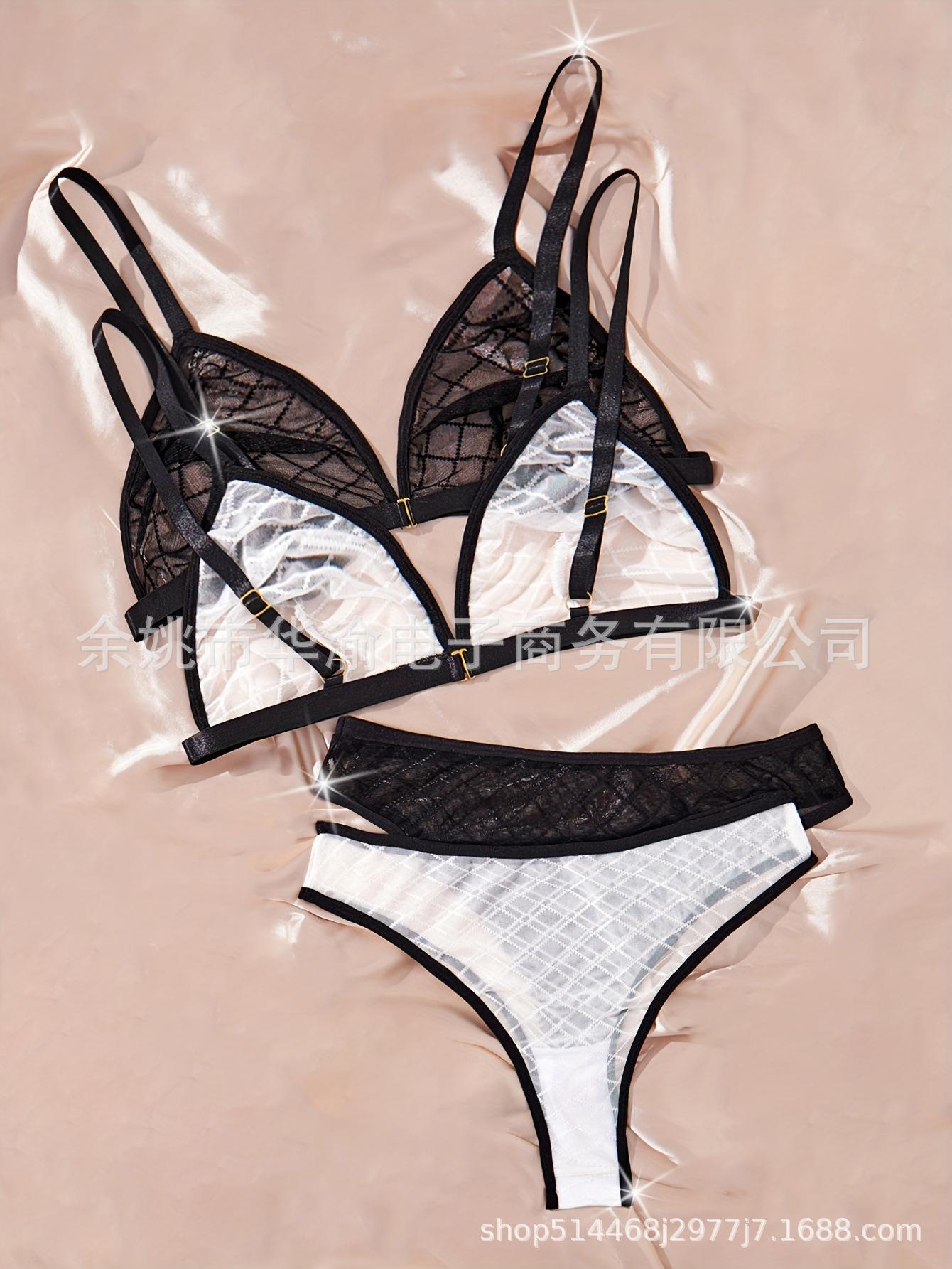 2024 novo estilo europeu e americano sexy perspectiva malha bicolor preto e branco cintura baixa tentação roupa íntima sexy conjunto de quatro peças