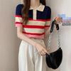 Verão Fino Lar Novo Estilo Tricô Redutor de Idade Top Feminino Retrô Listrado Solto Gola POLO Camiseta de Manga Curta para Mulheres