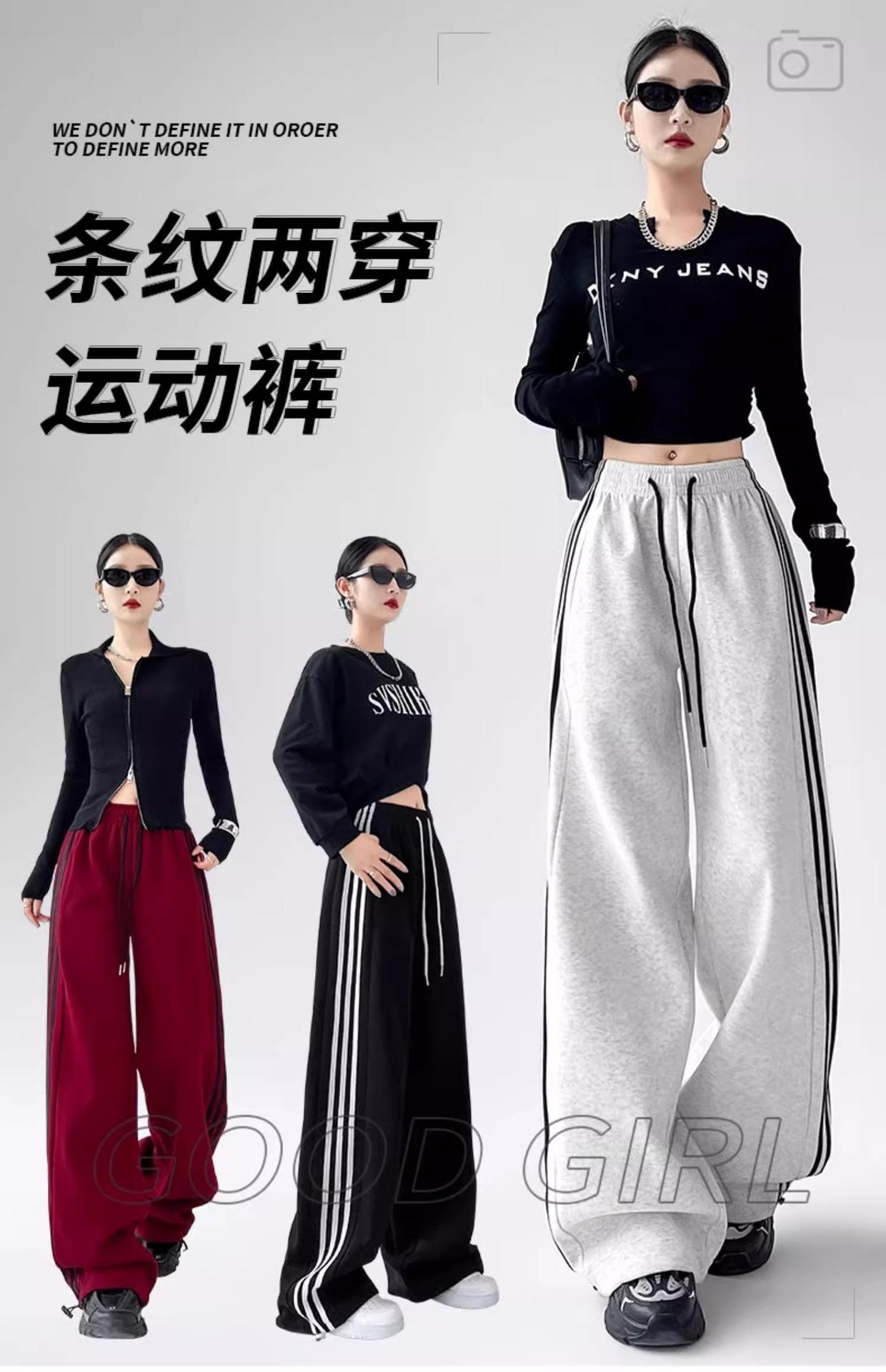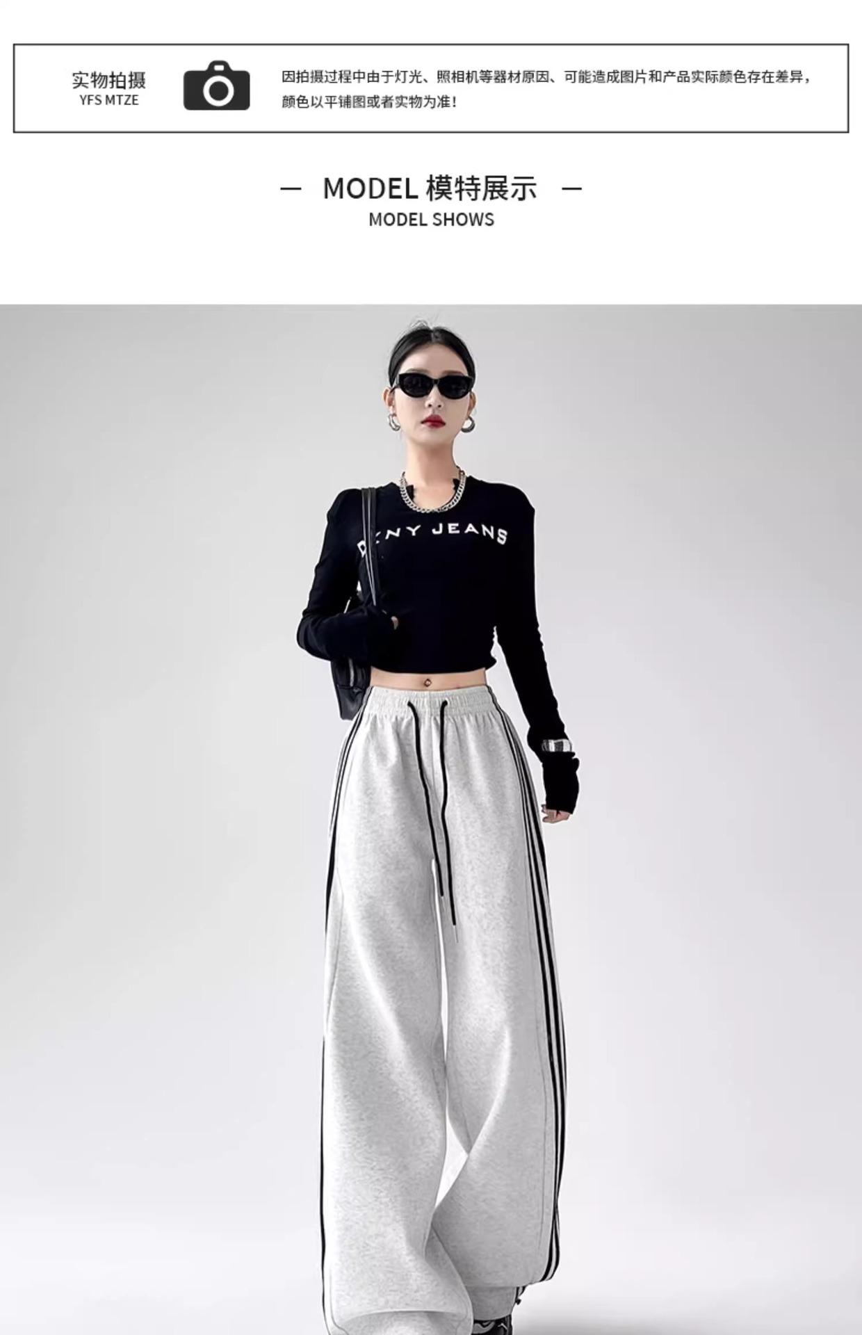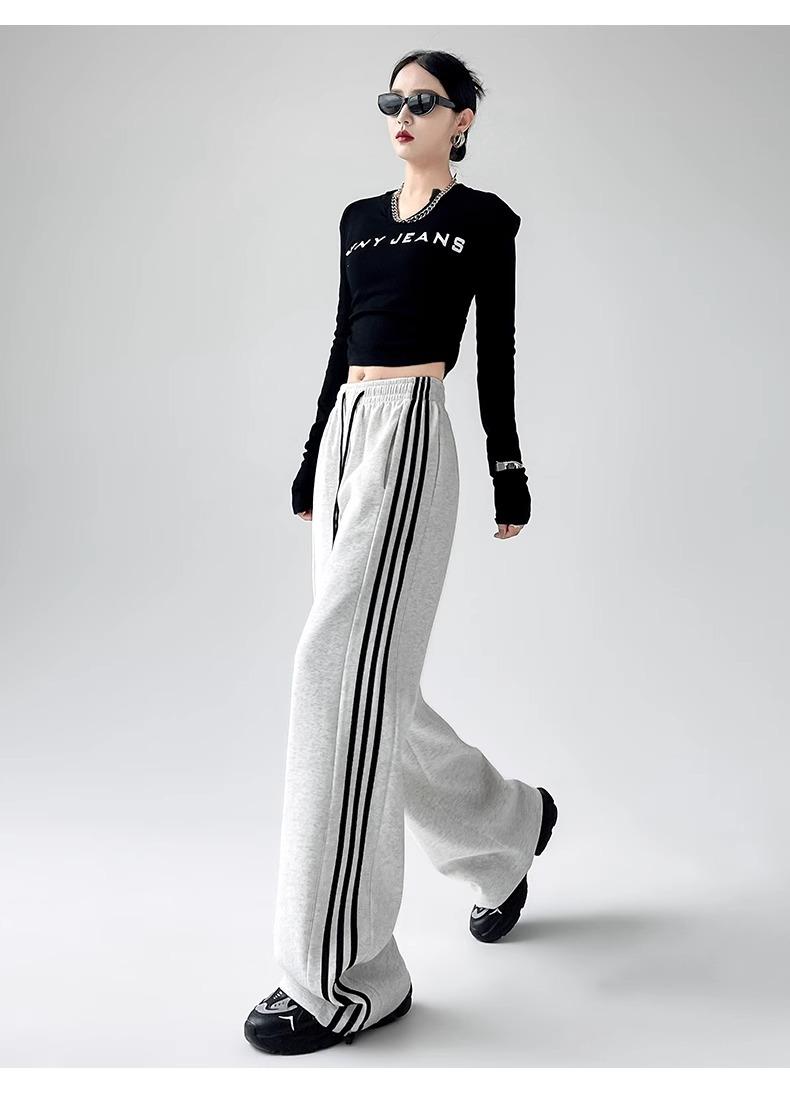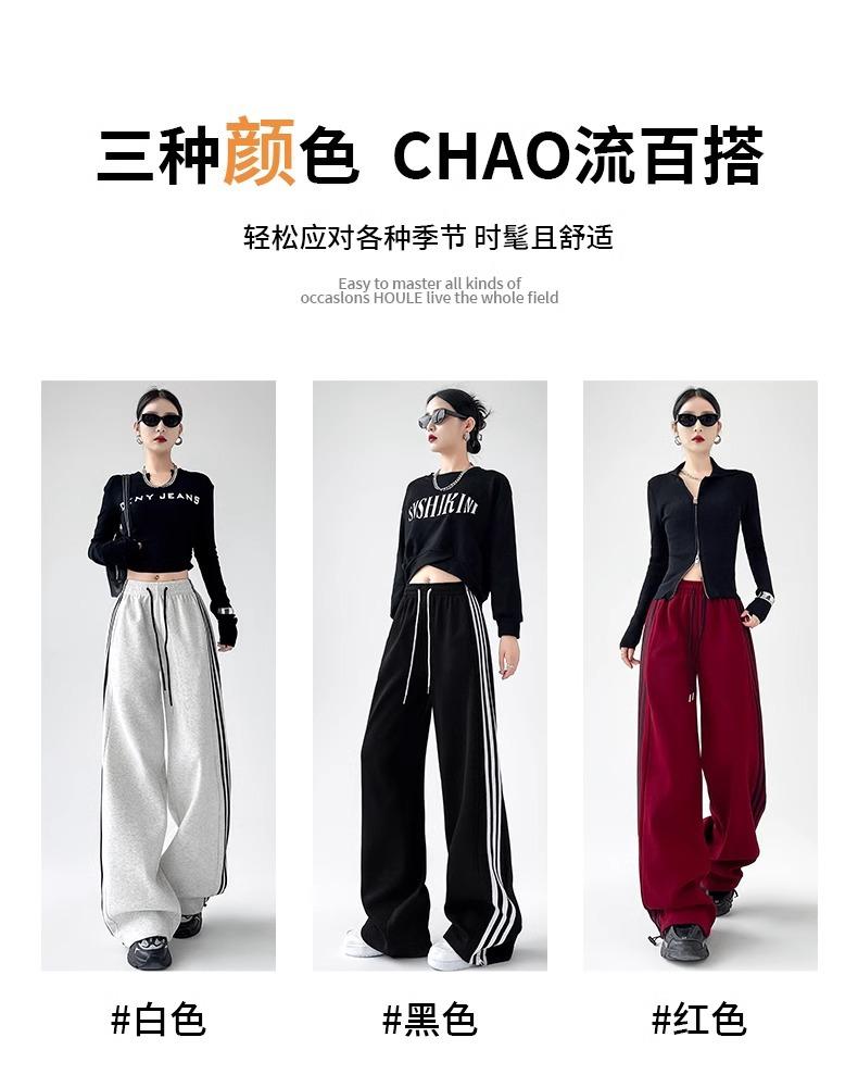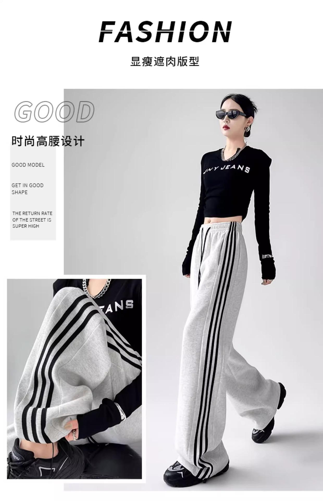 Calças de Moletom Femininas Estilo Americano Plus Size 2025 Novo Outono e Inverno Soltas Caimento Casual Joggers com Três Listras Calças de Perna Larga