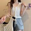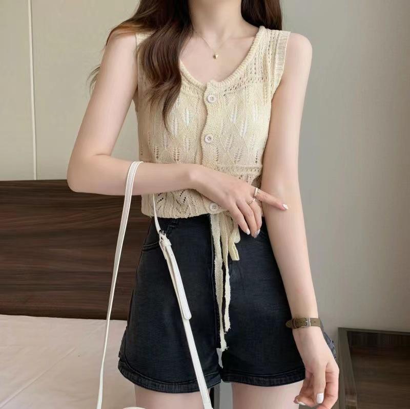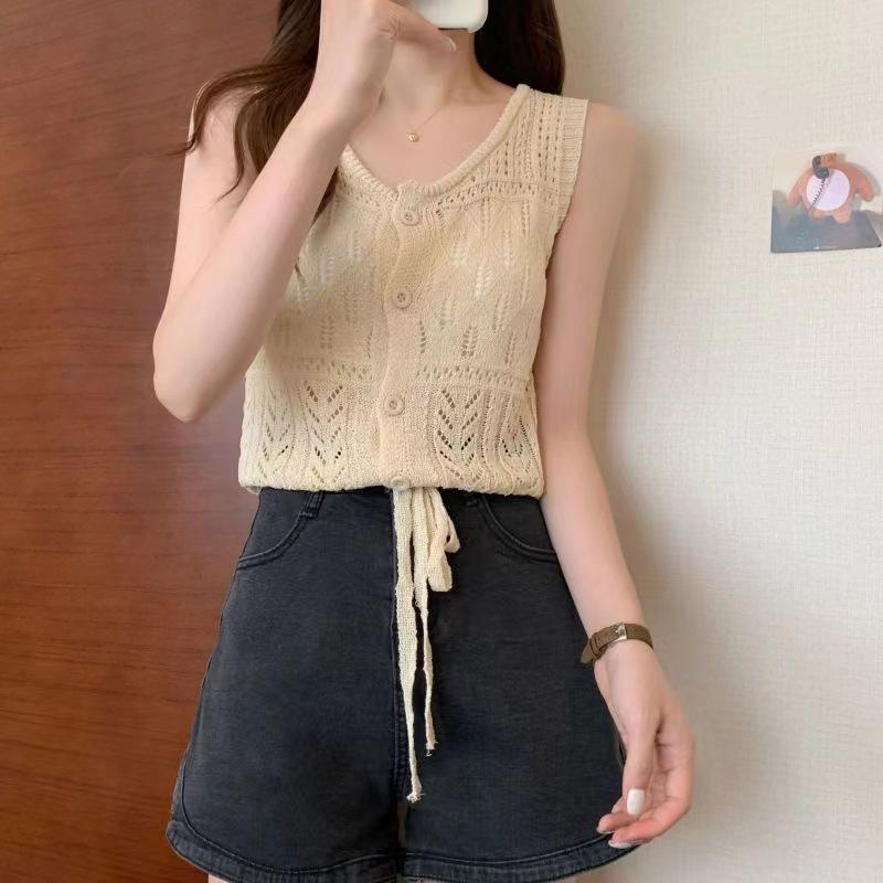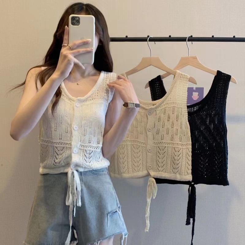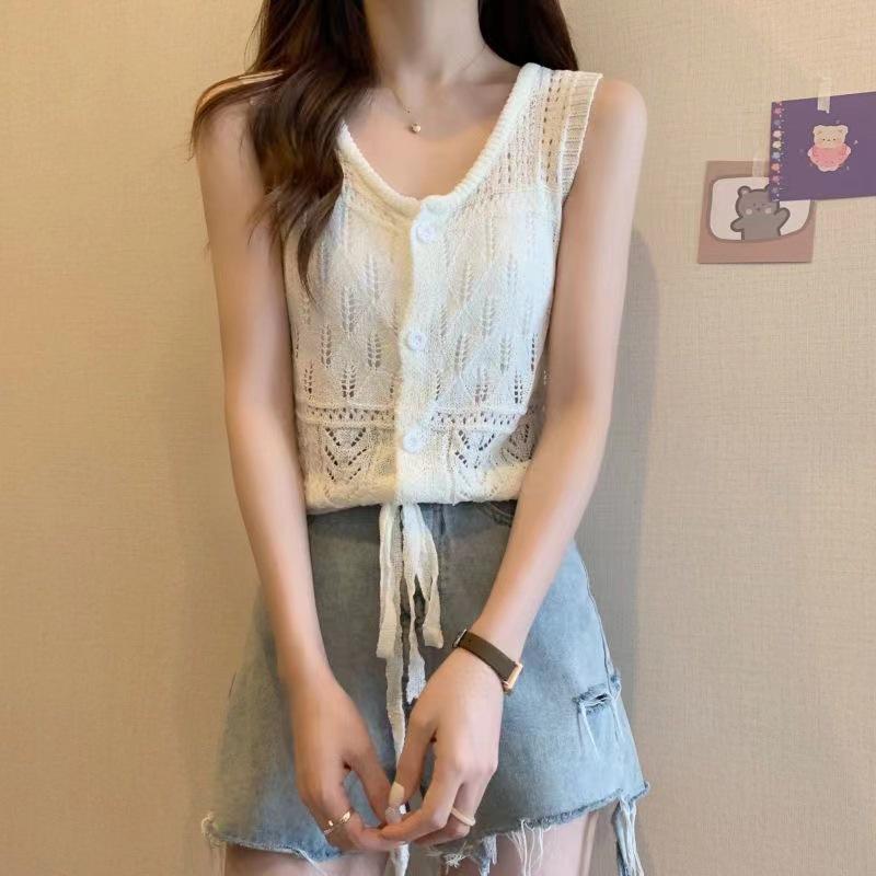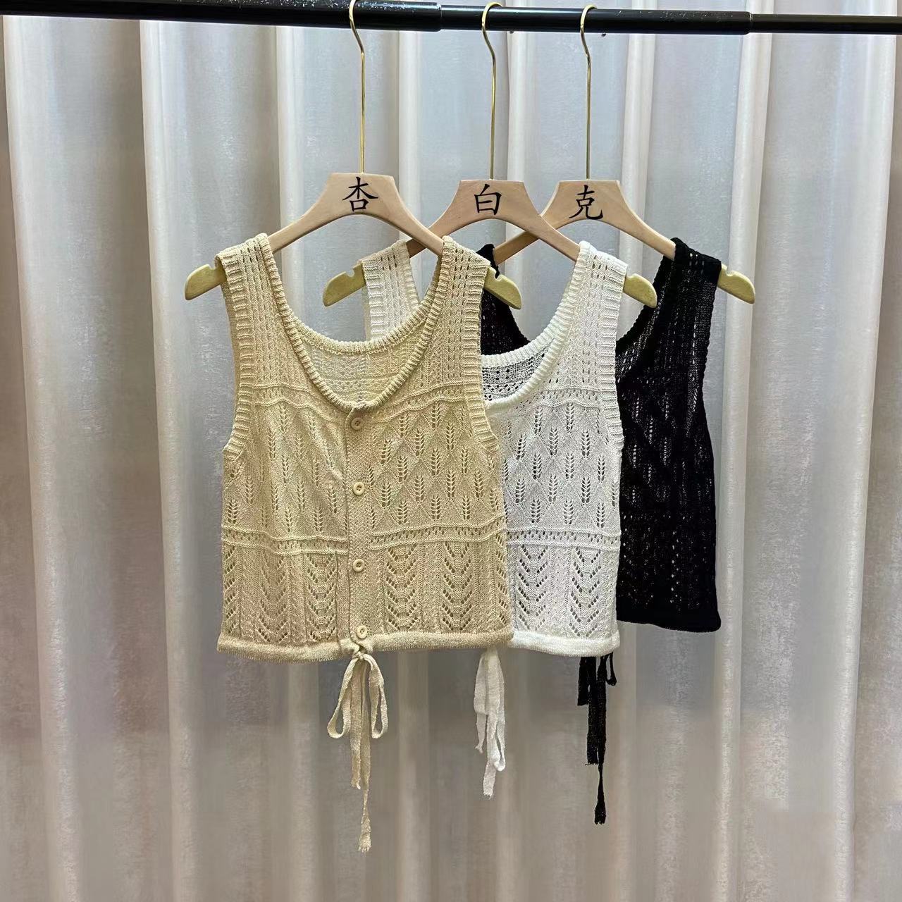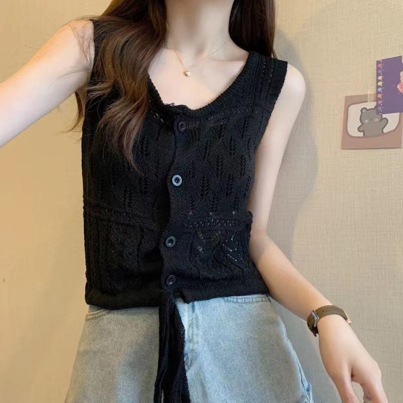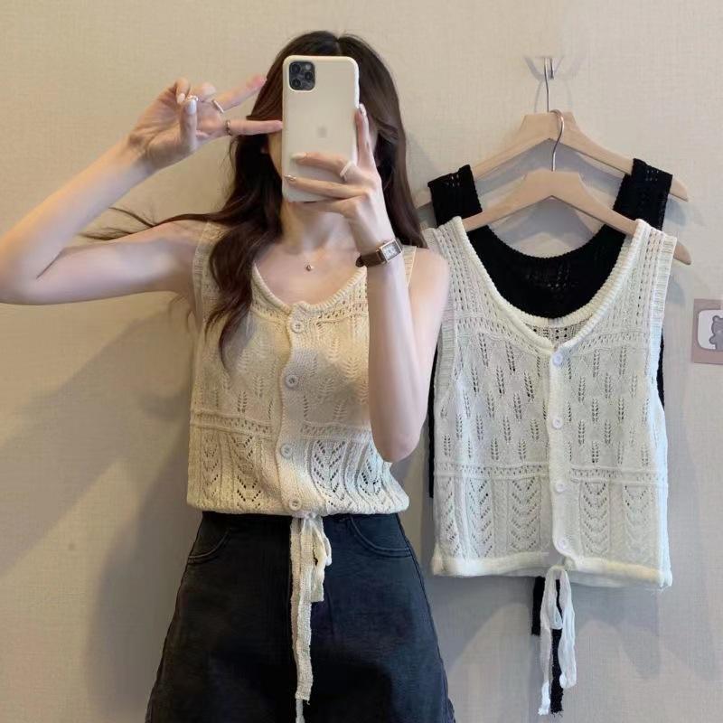 Design de malha Sense Niche Novo Top com alça Base Oca Colete Exterior de malha Sem mangas Verão Curto