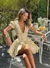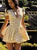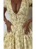 Estilo Francês Estilo Doce Verão Novo Sexy Decote V Profundo Cintura Fina Manga Curta Comprimento Médio Plissado Floral para vestido Mulheres