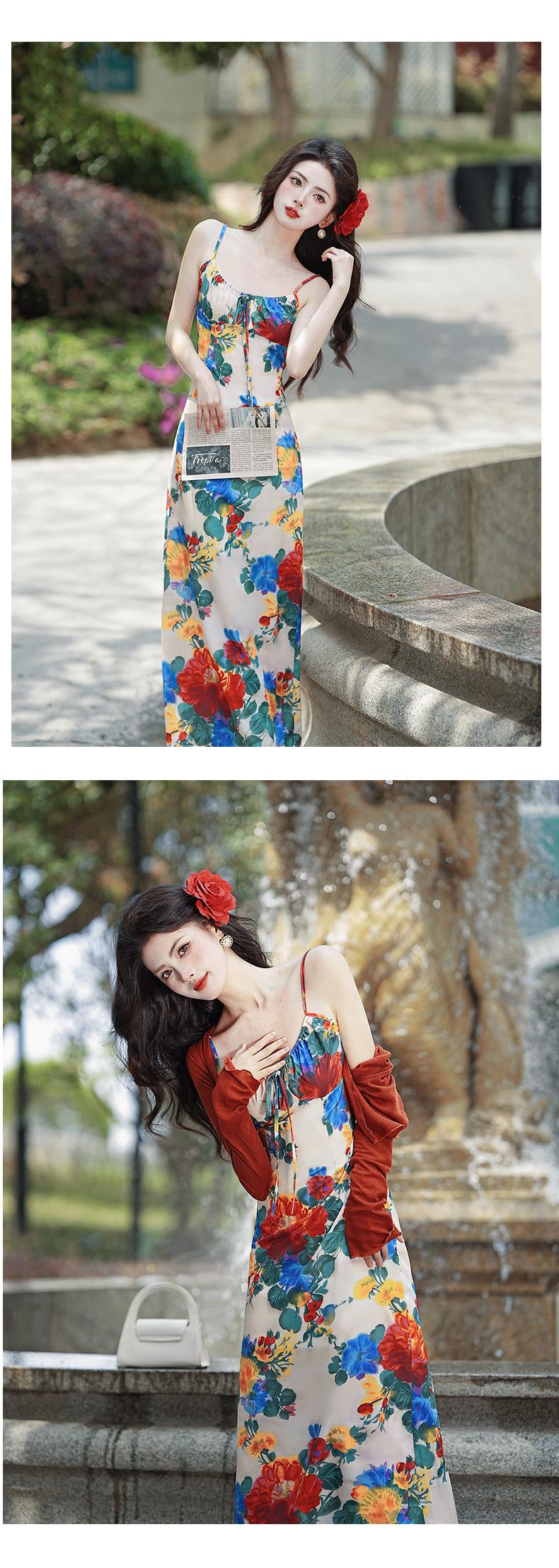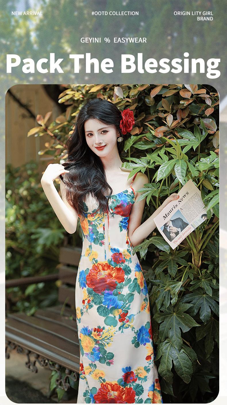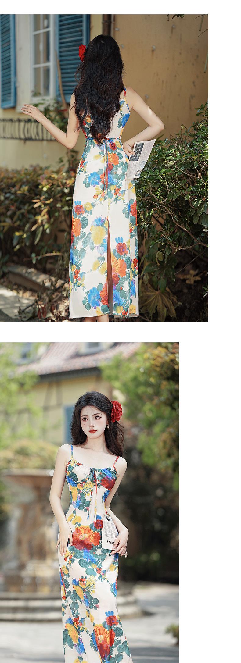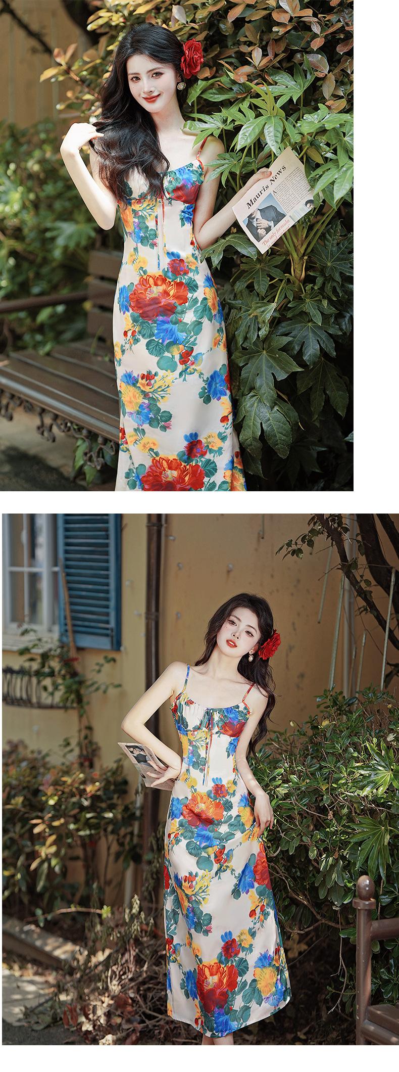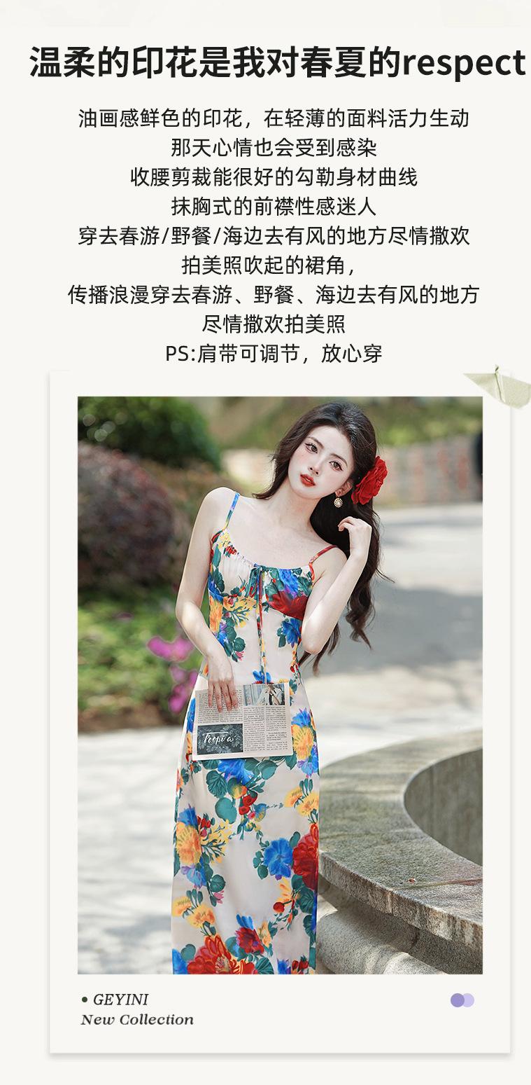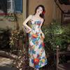 Vestido Vintage Pintura a Óleo Floral de Amarrar Alça Vestido Longo Elegante de Nicho de Verão Feminino Cintura Ajustada Vestido A-line