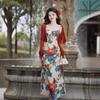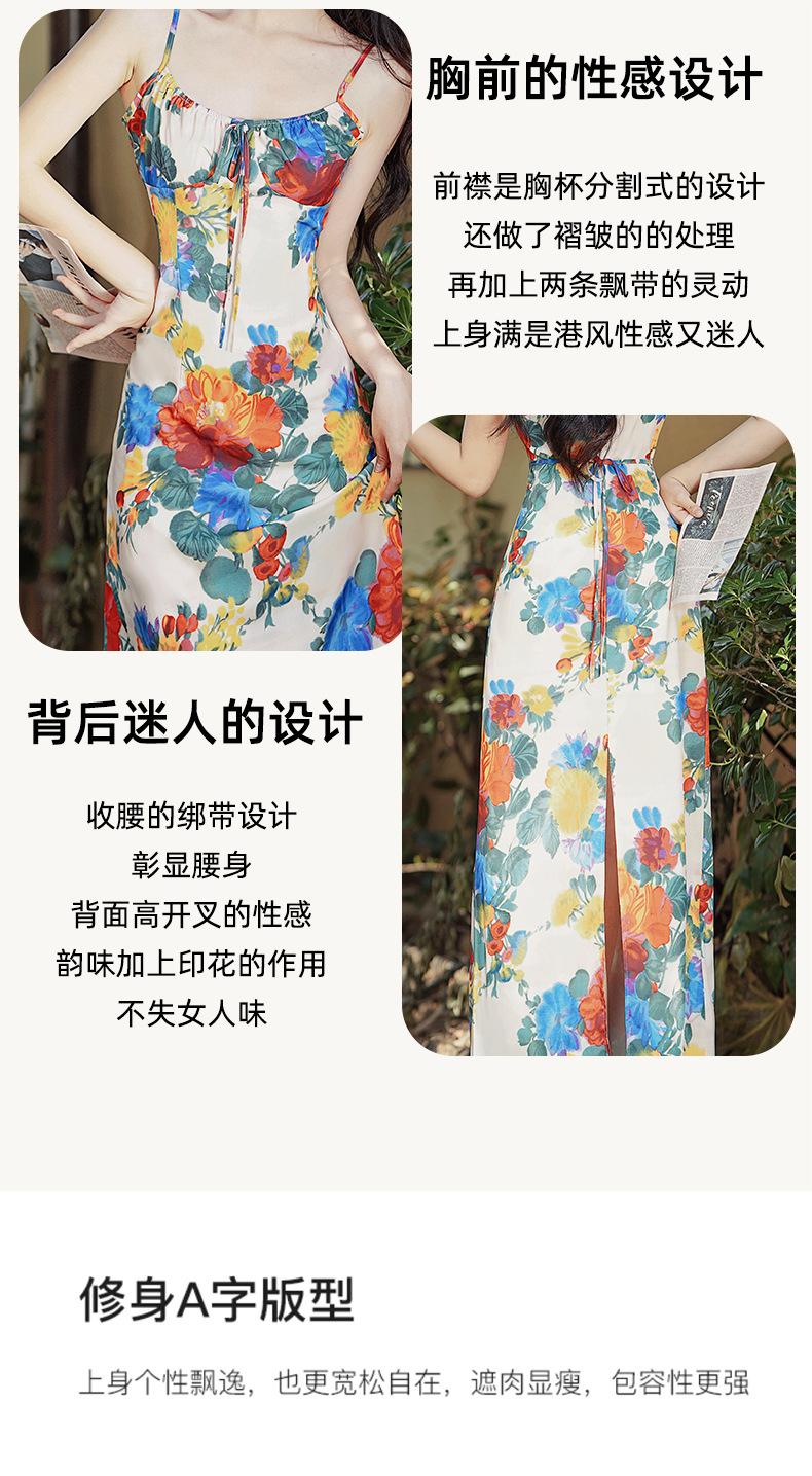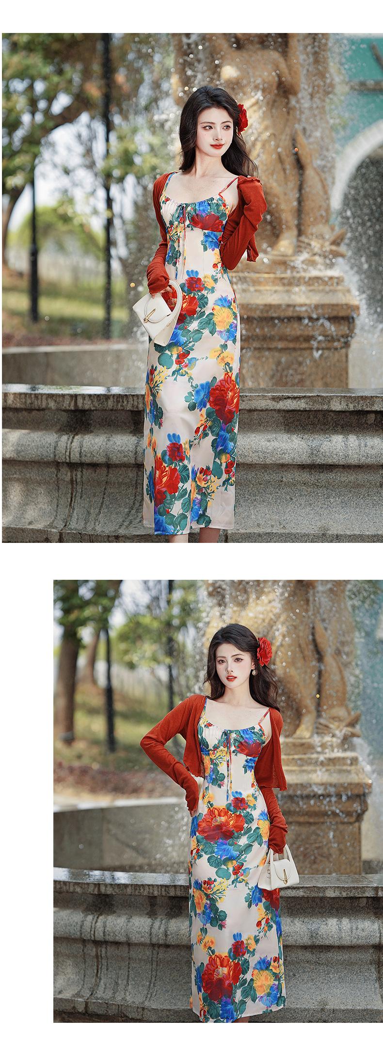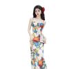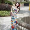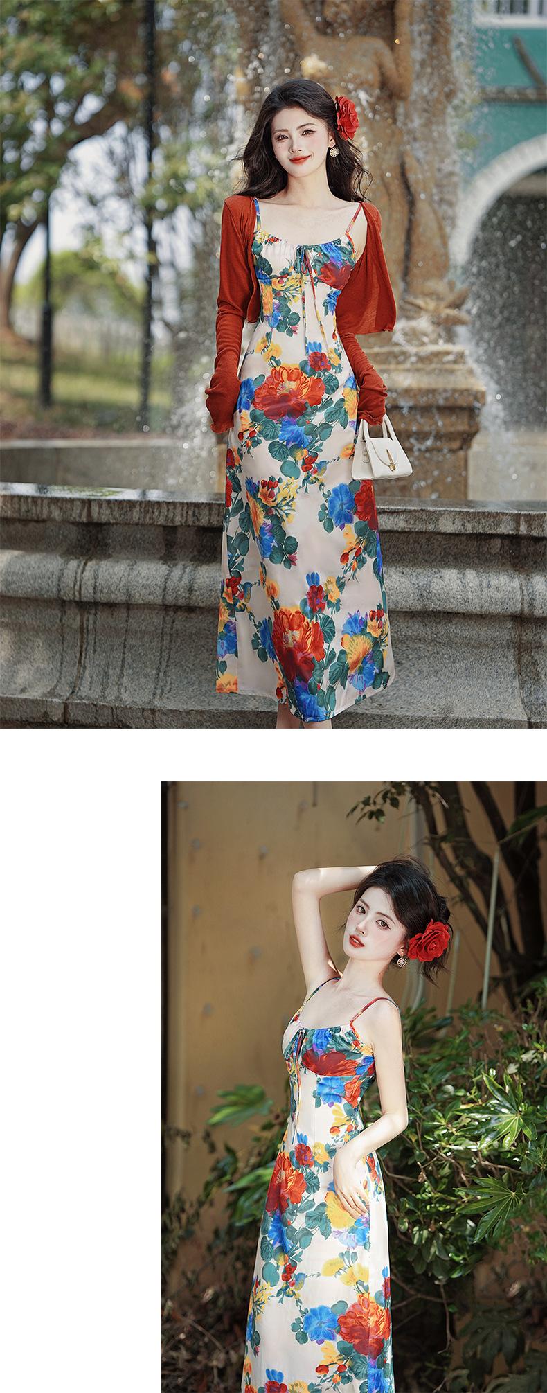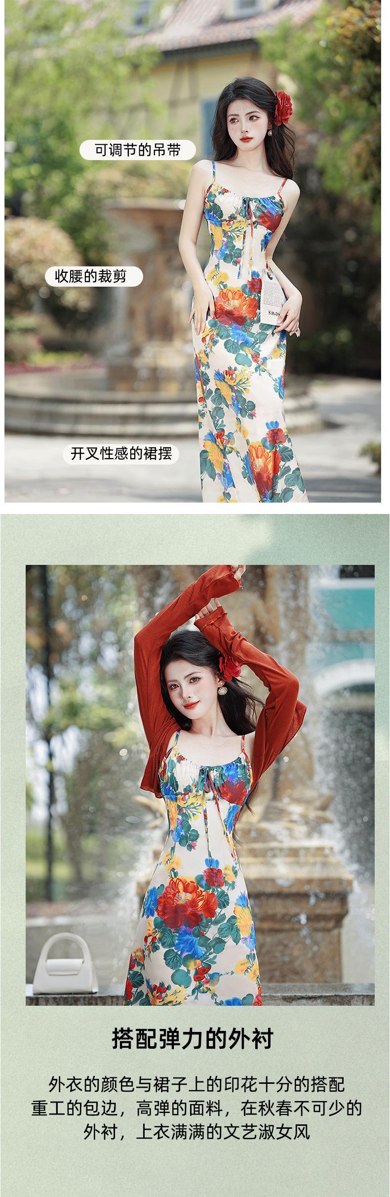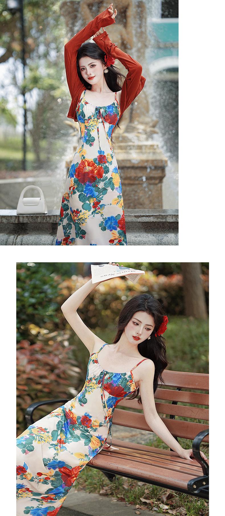 Vestido Vintage Pintura a Óleo Floral de Amarrar Alça Vestido Longo Elegante de Nicho de Verão Feminino Cintura Ajustada Vestido A-line