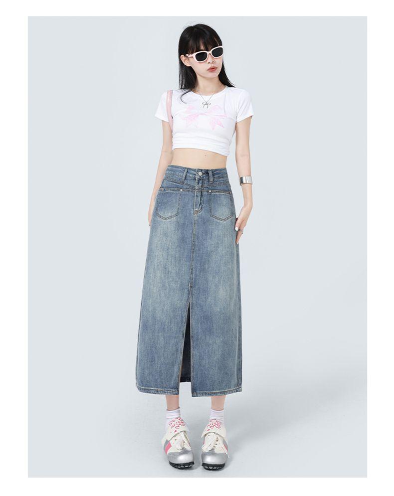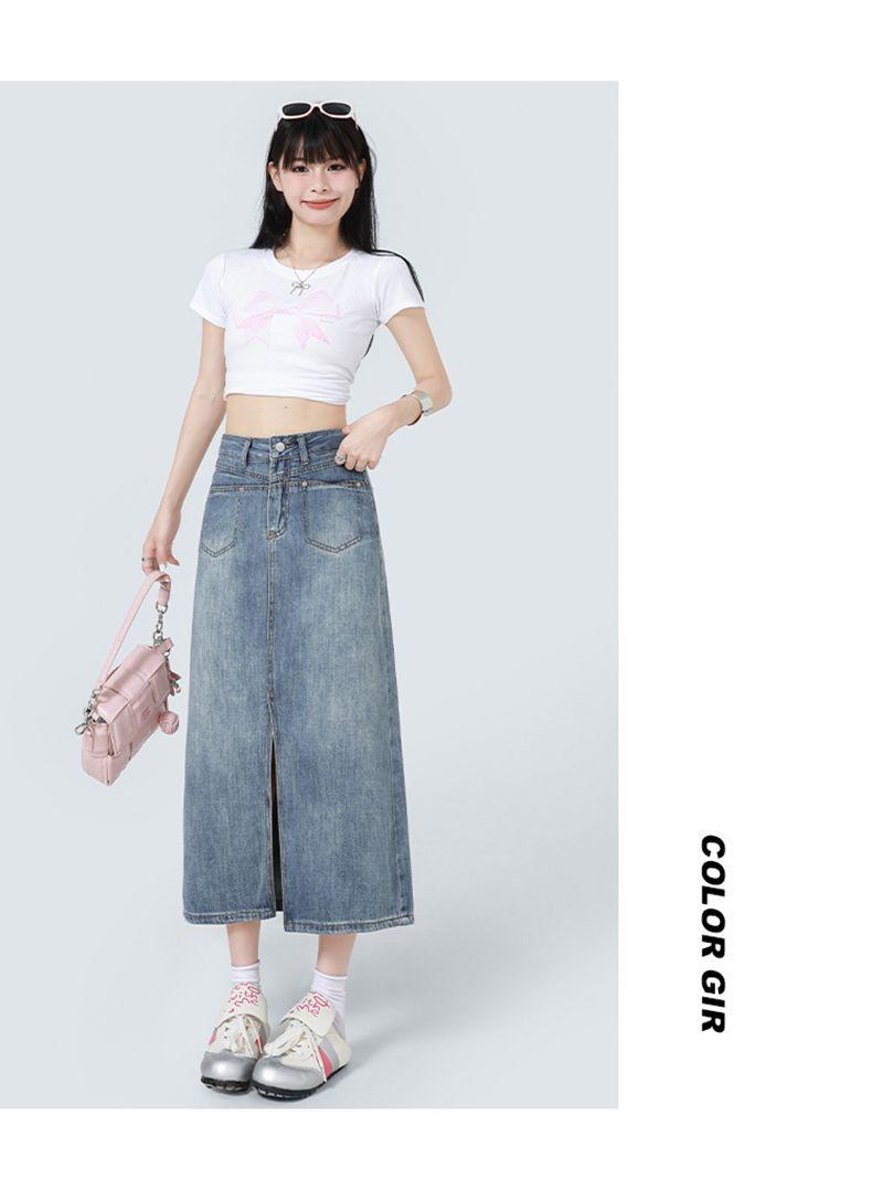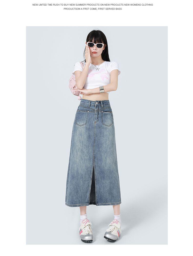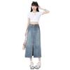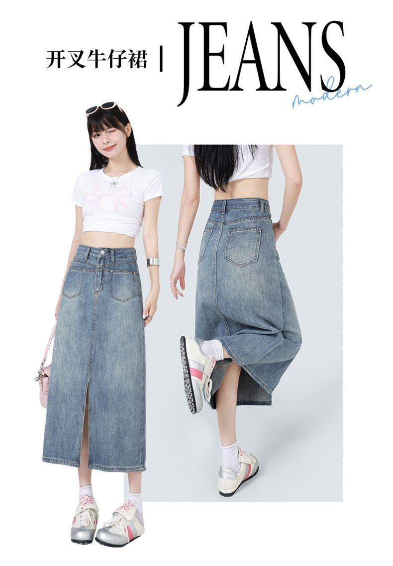 Saia jeans feminina de cintura alta com fenda, nova saia de verão 2025, comprimento médio, formato A, saia pequena para quadril