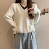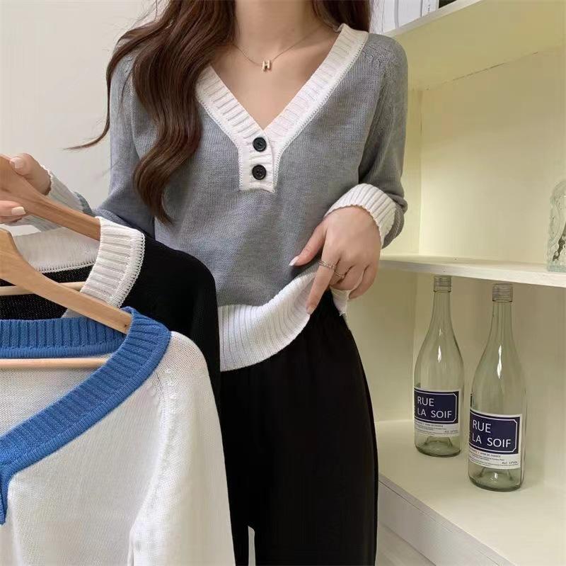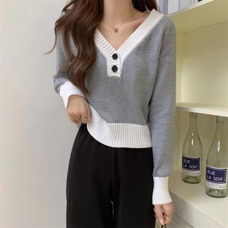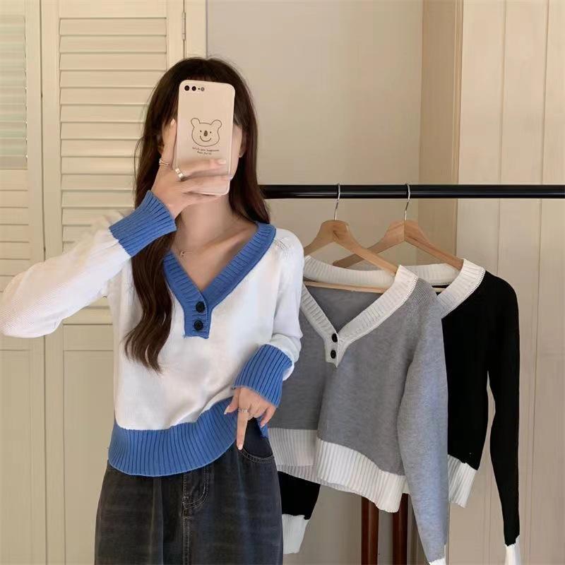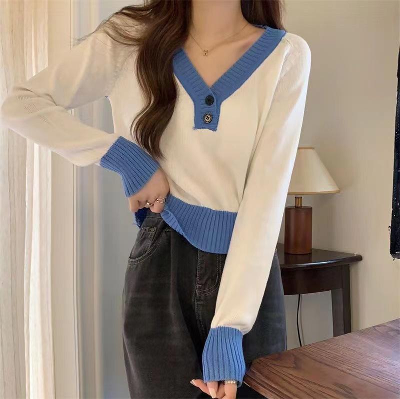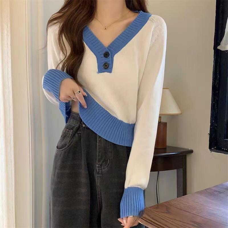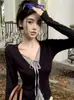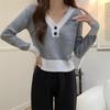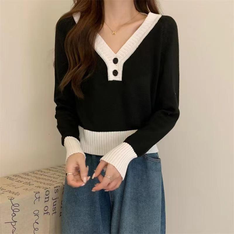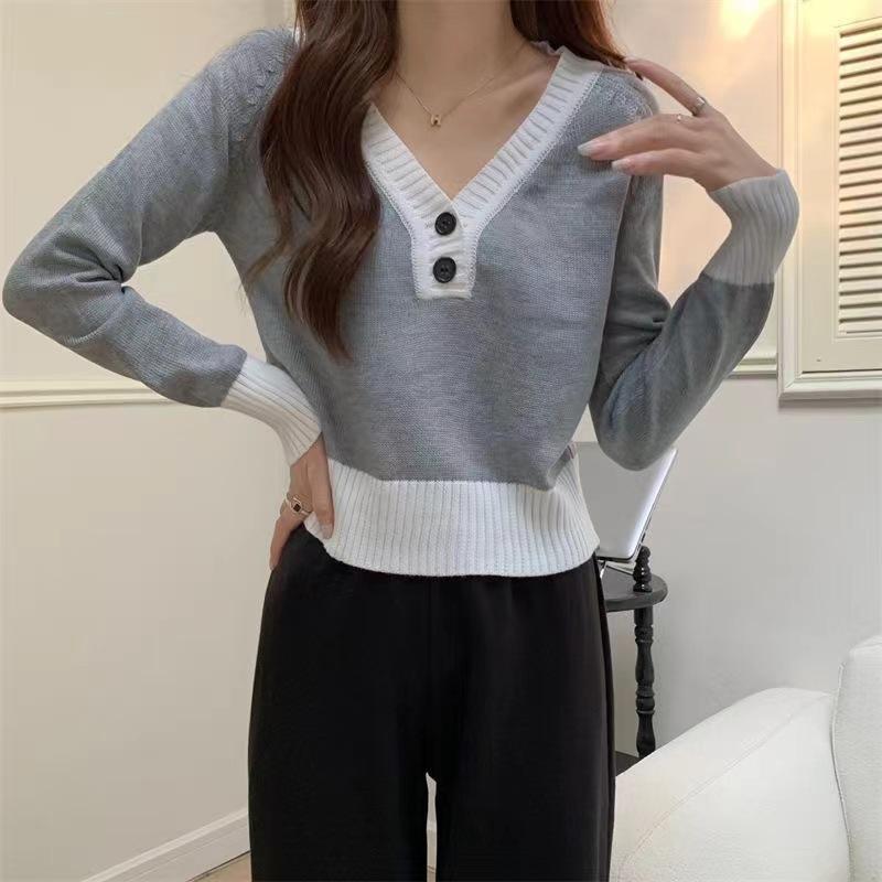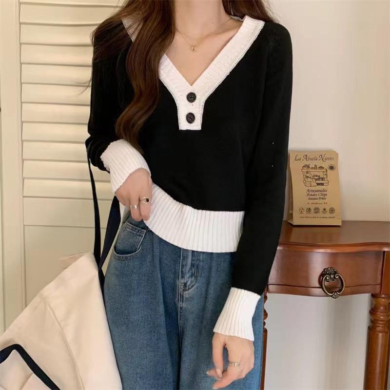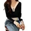 Blusa feminina de malha falsa de duas peças Spice Girl, nova coleção de outono, design de nicho, curta, decote em V, elegante, slim, manga comprida