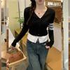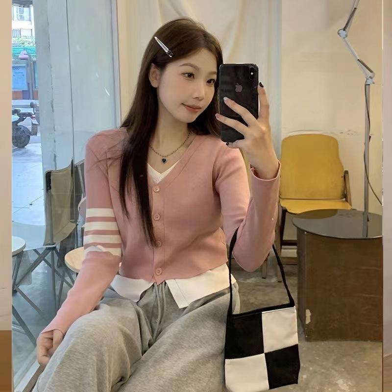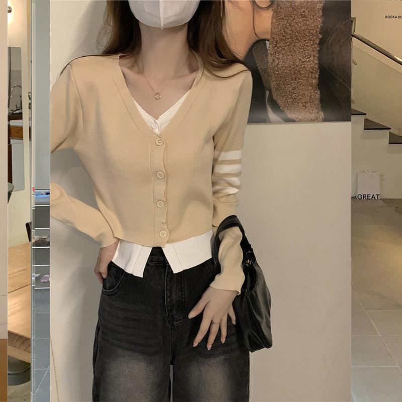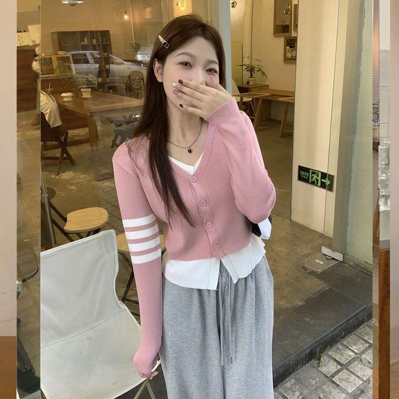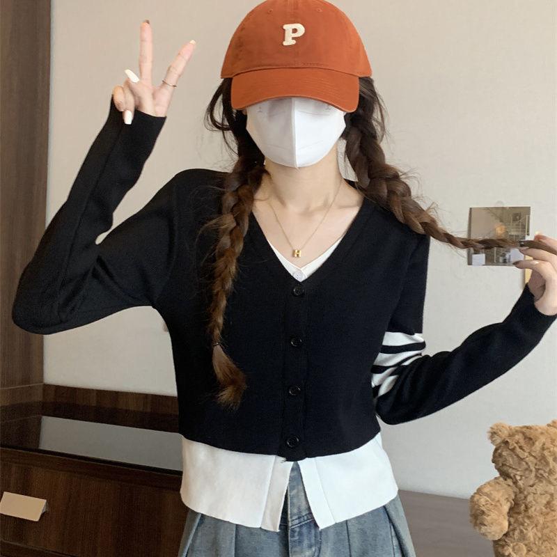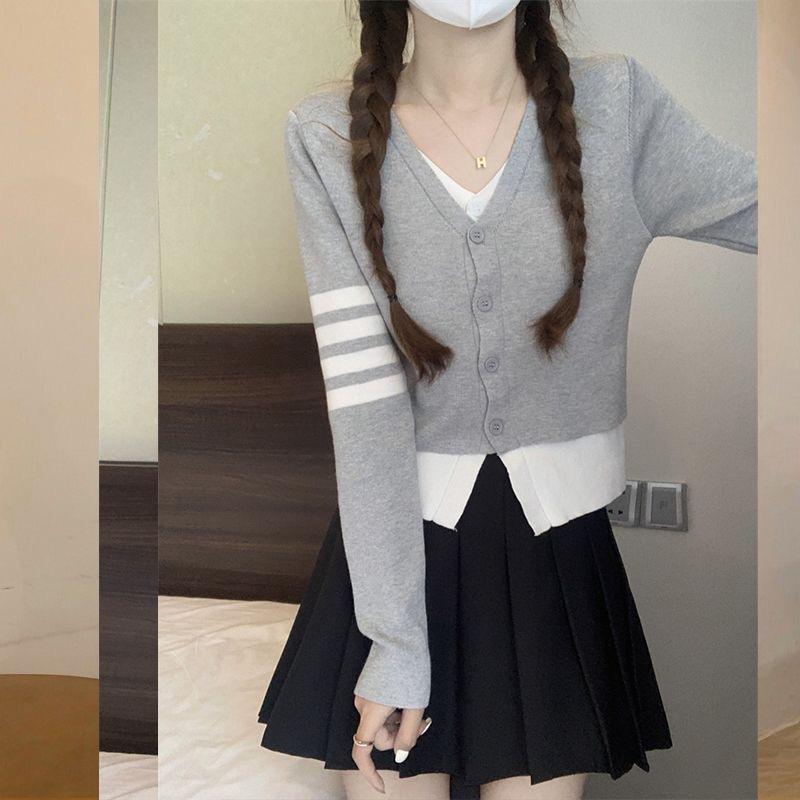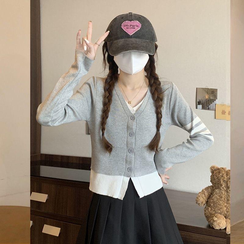 Cardigan falso de duas peças com costura, estilo universitário, cor contrastante, suéter pequeno, design de outono feminino, casaco de malha