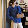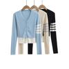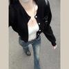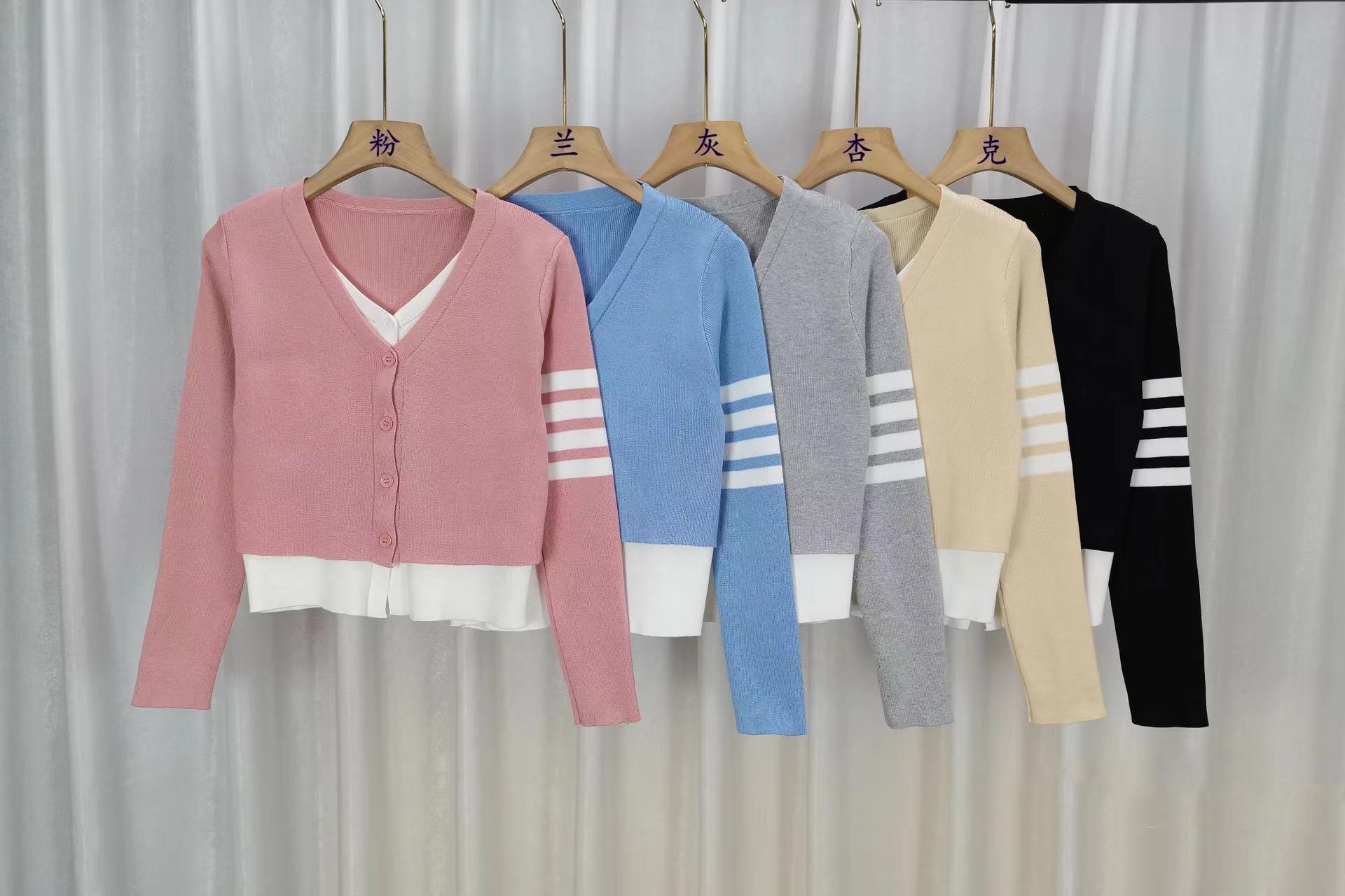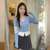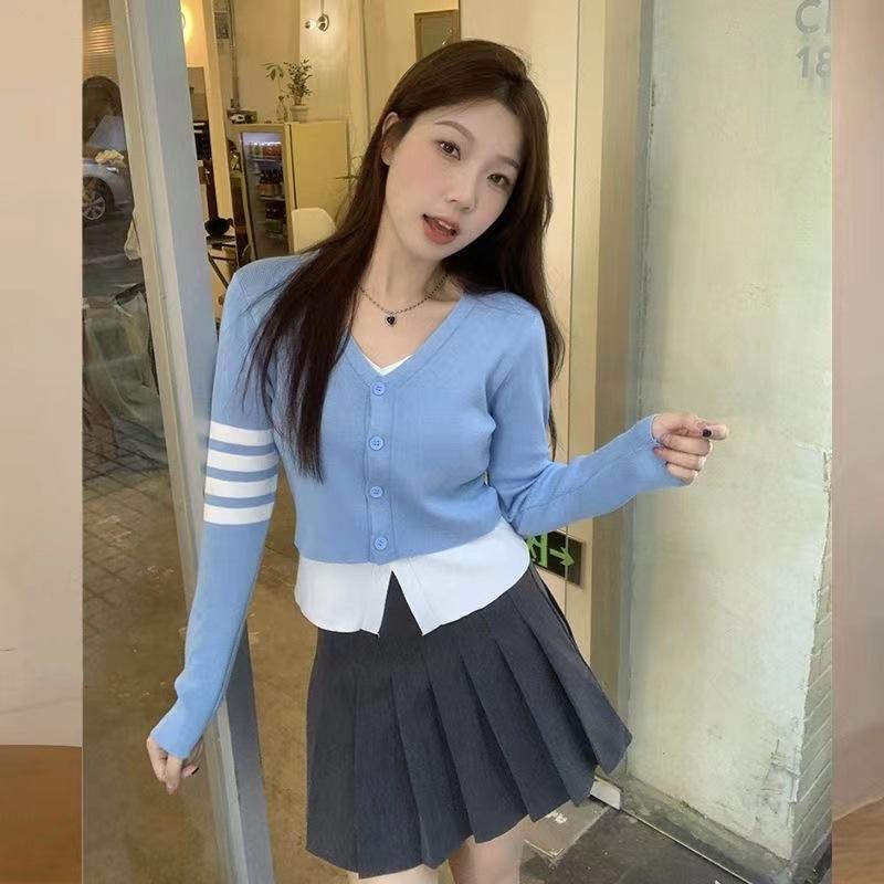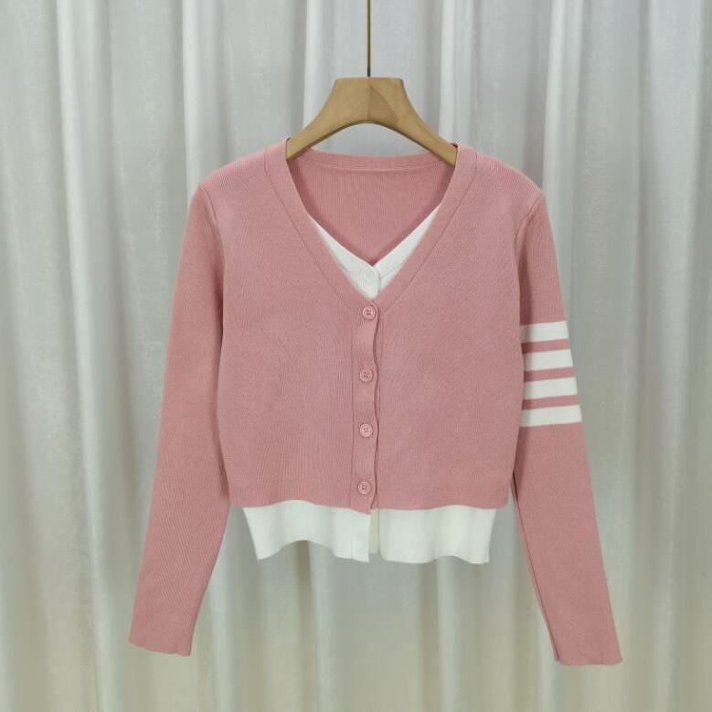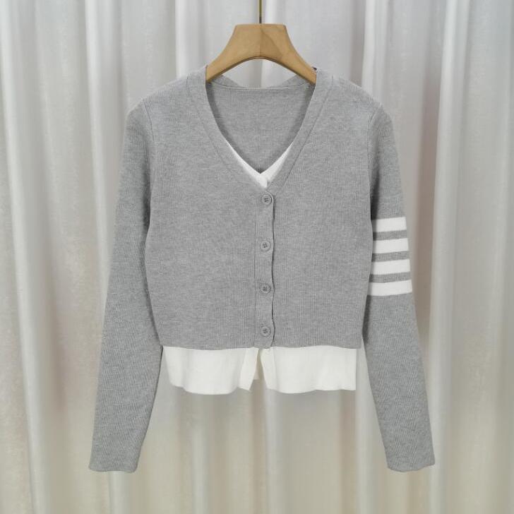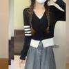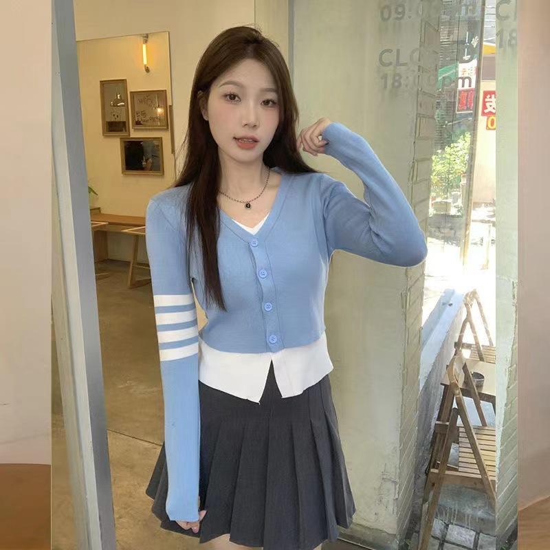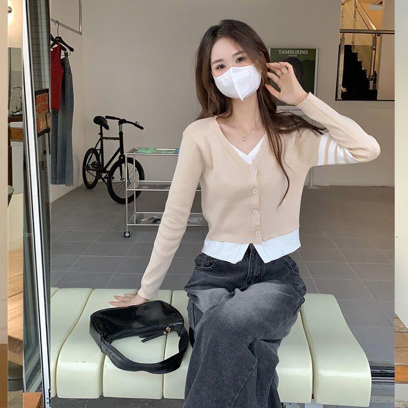 Cardigan falso de duas peças com costura, estilo universitário, cor contrastante, suéter pequeno, design de outono feminino, casaco de malha