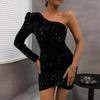 Vestido Europeu e Americano 2022 Feminino Cor Sólida Um Ombro Ajustado Sexy Envelope Quadril Manga Sino Vestido Irregular