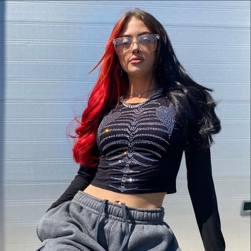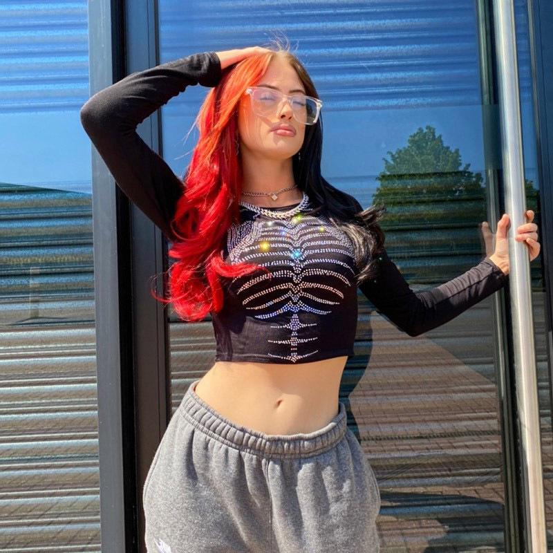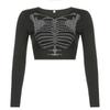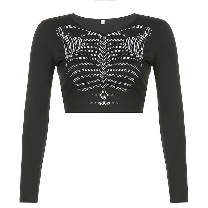 Camiseta Feminina de Manga Longa com Estampa de Esqueleto Ins Escuro com Strass, Top Interno Curto Sexy para Garota Quente, Camiseta Básica de Gola Redonda