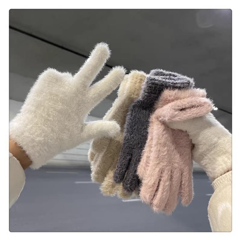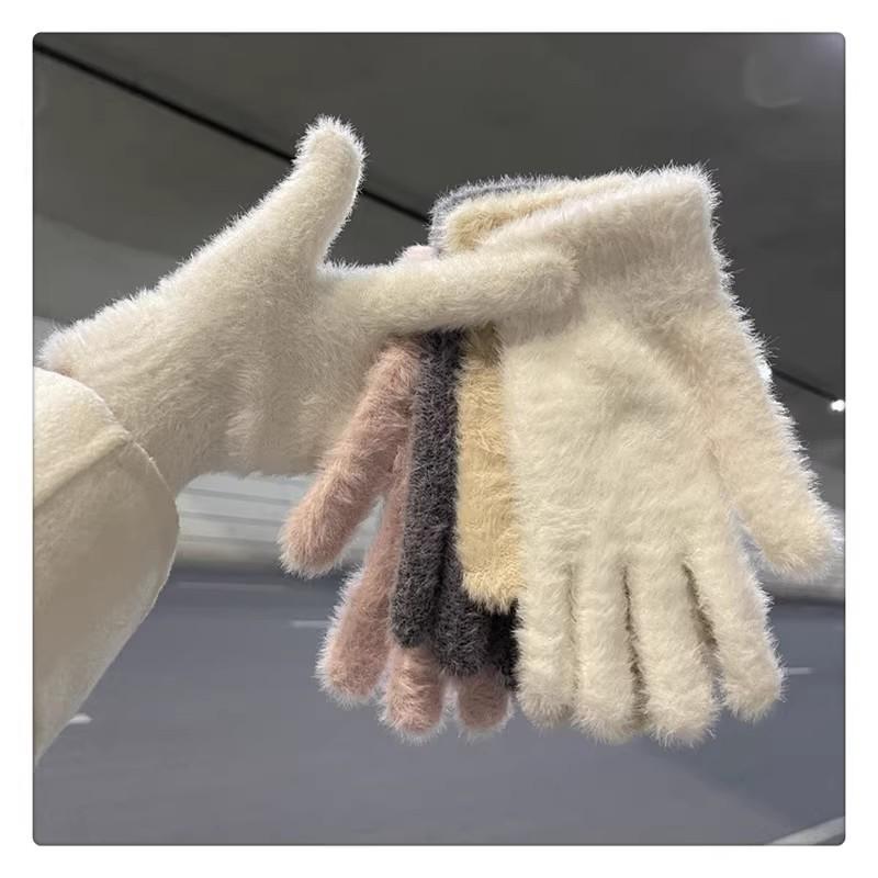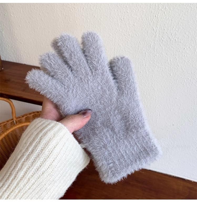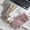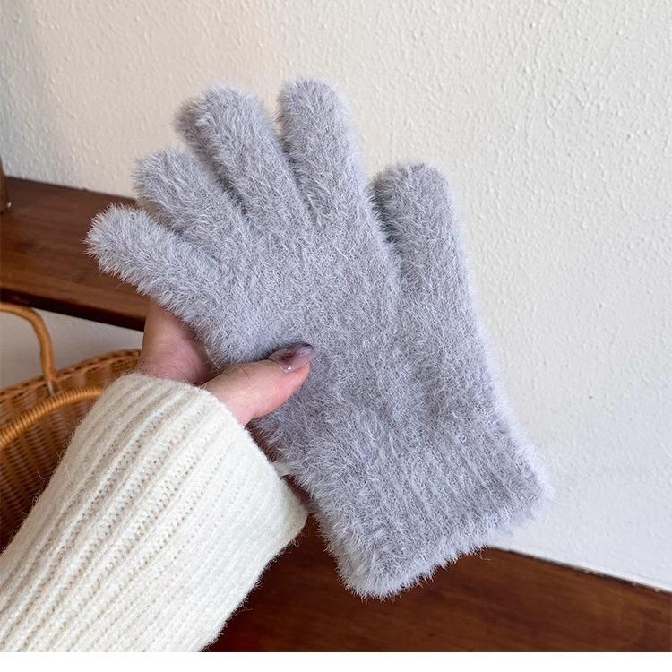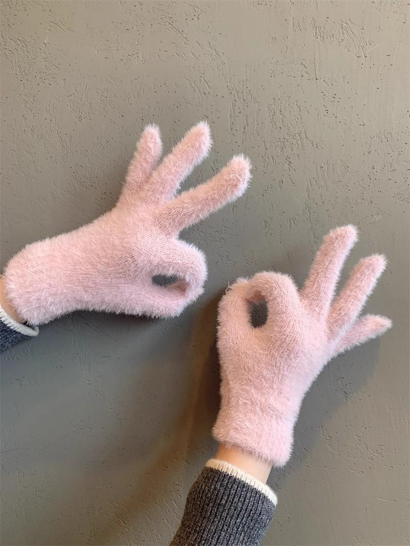 Luvas Quentes de Inverno Femininas de Pelúcia de Imitação de Pelo de Coelho com Forro Coreano Fofas de Dedo à Prova de Frio Cor Sólida Tricotadas