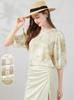[19 Mumi 100% Seda de Amoreira] Verão Estilo Chinês Look Emagrecedor Estampada Top de Manga Curta Camiseta Curta de Seda