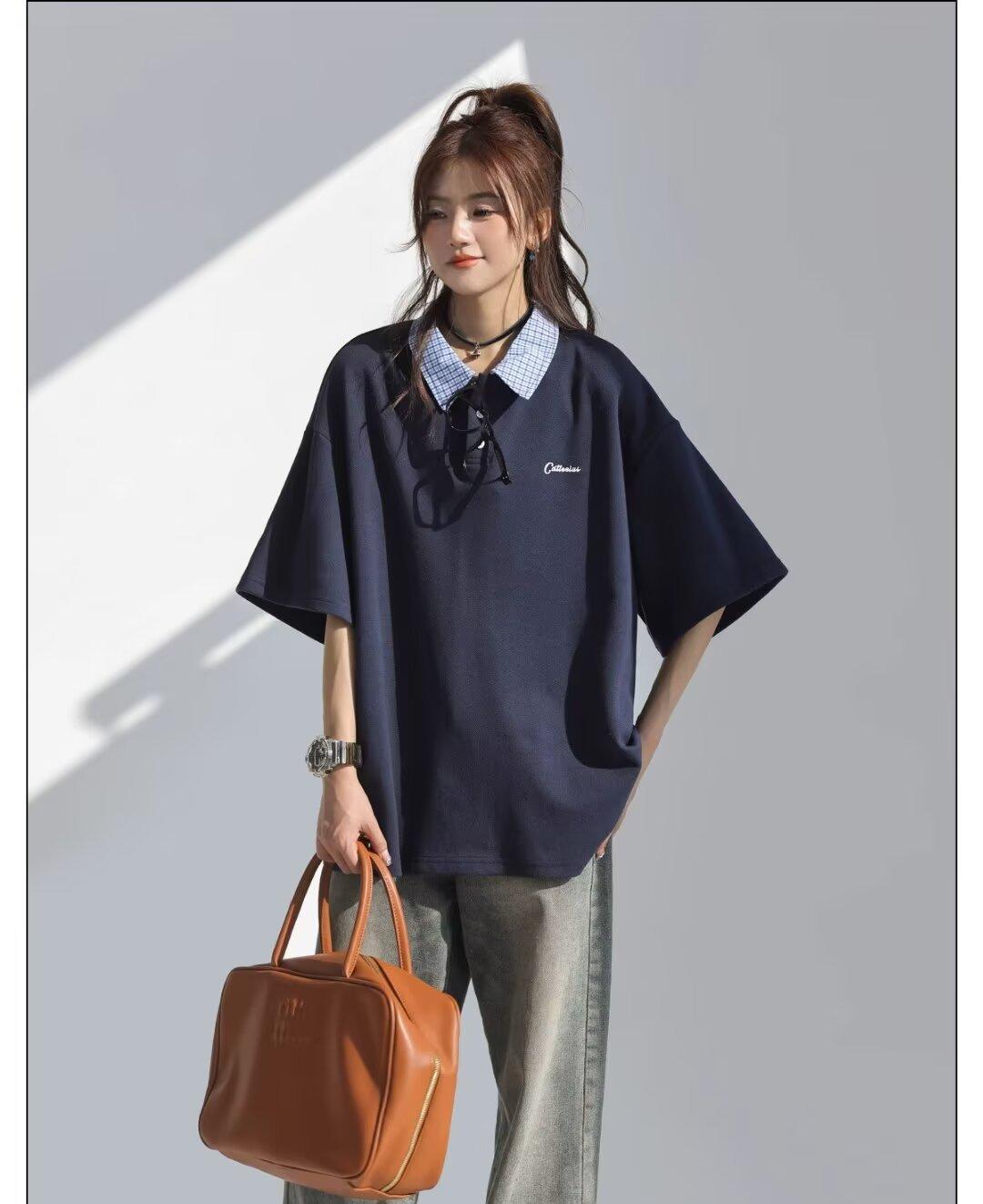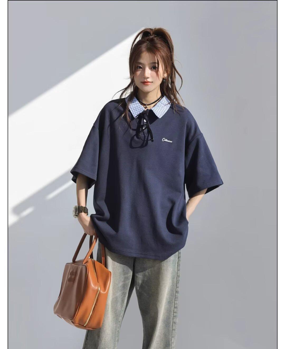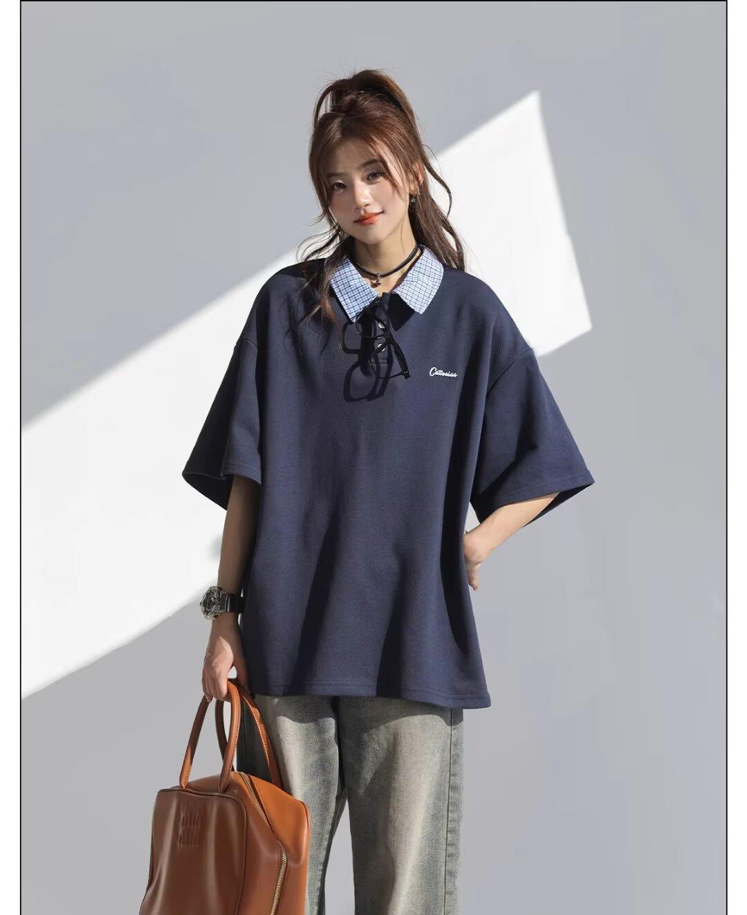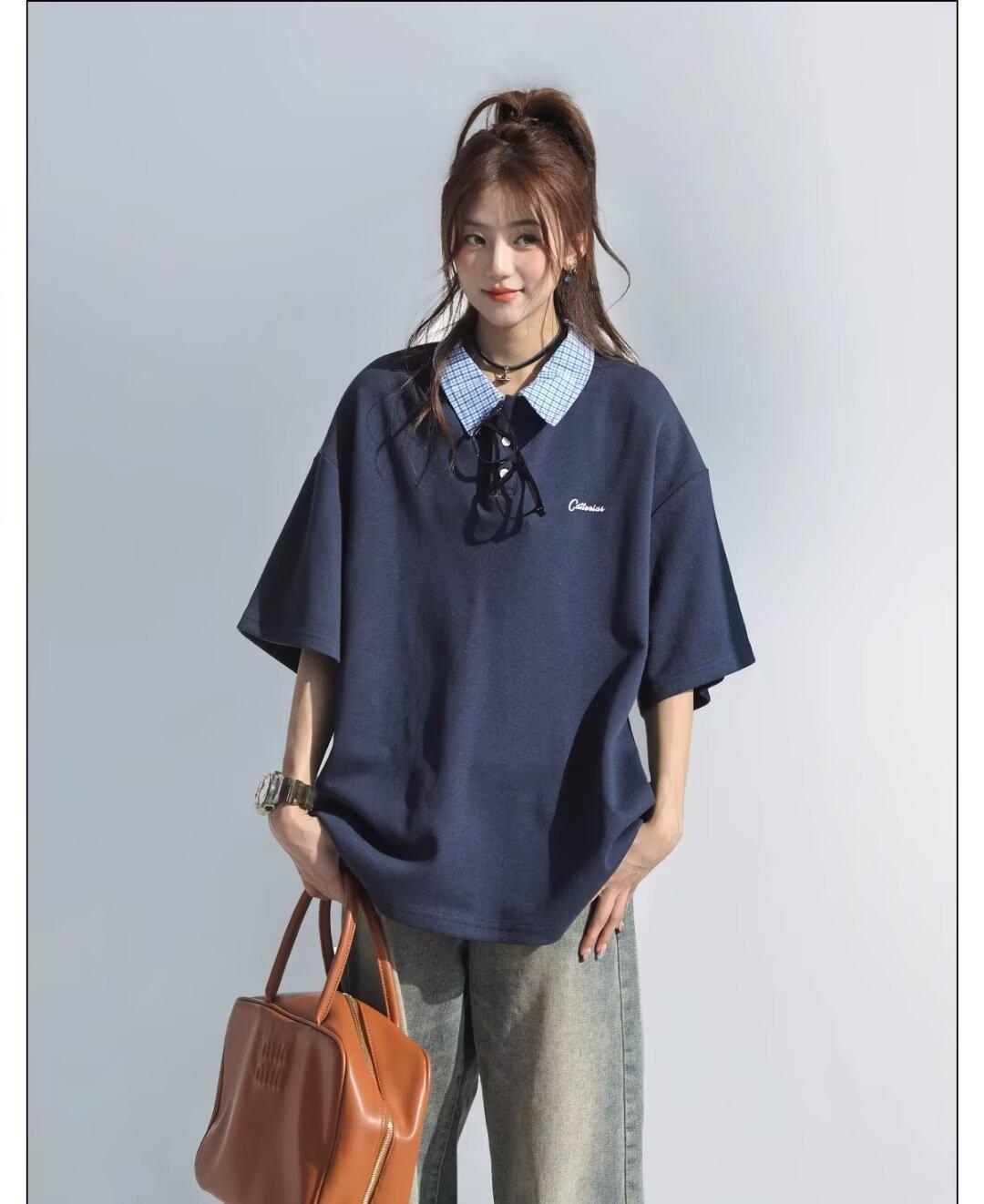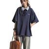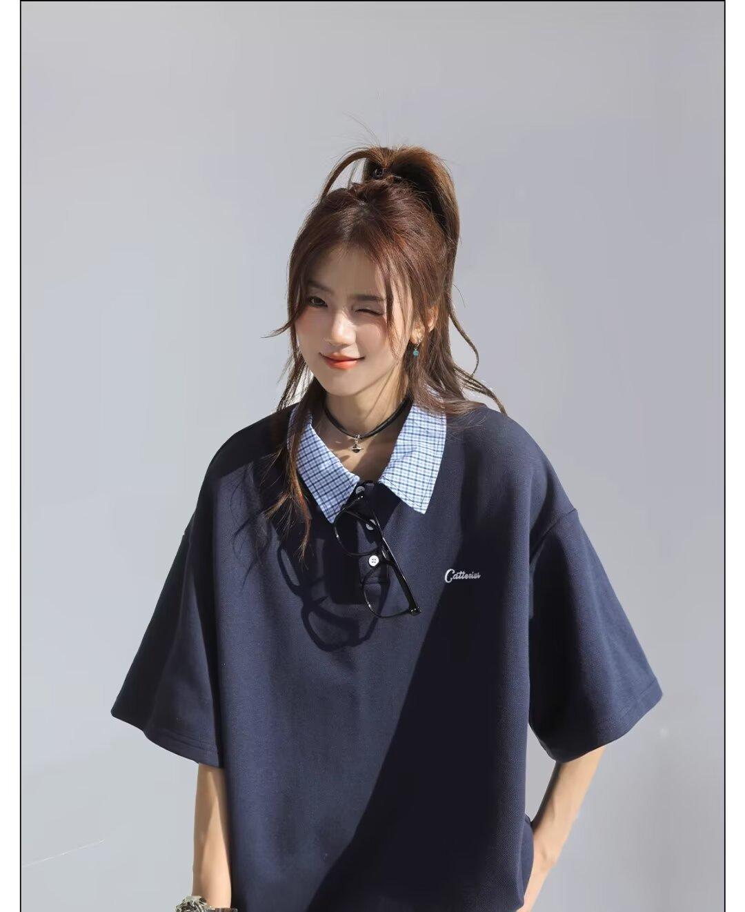 Camisa POLO de Manga Curta Falsa de Duas Peças Estilo Coreano para Menina Bordada Azul Marinho Top Atmosfera Roupa Limpa Camiseta Marca da Moda