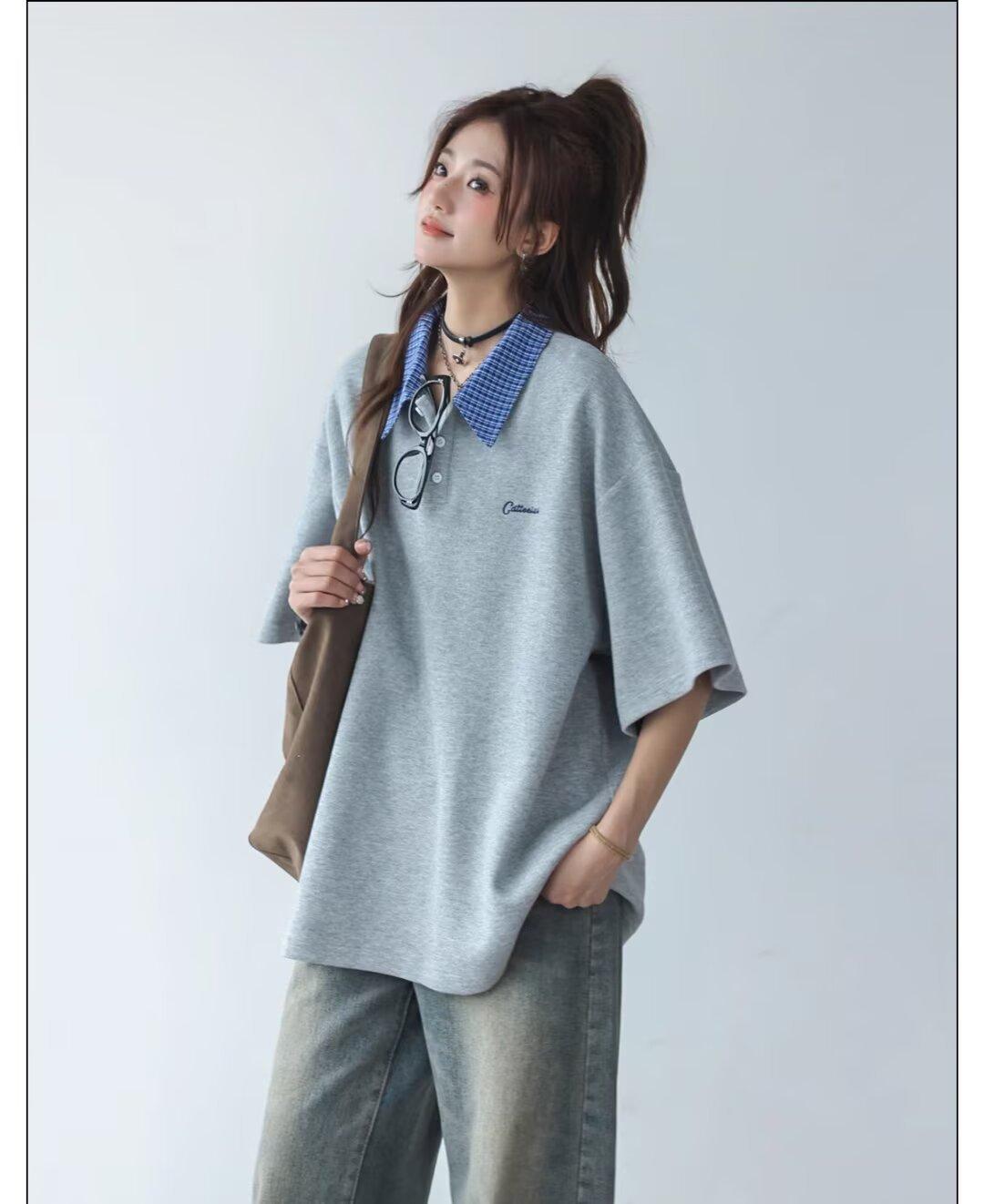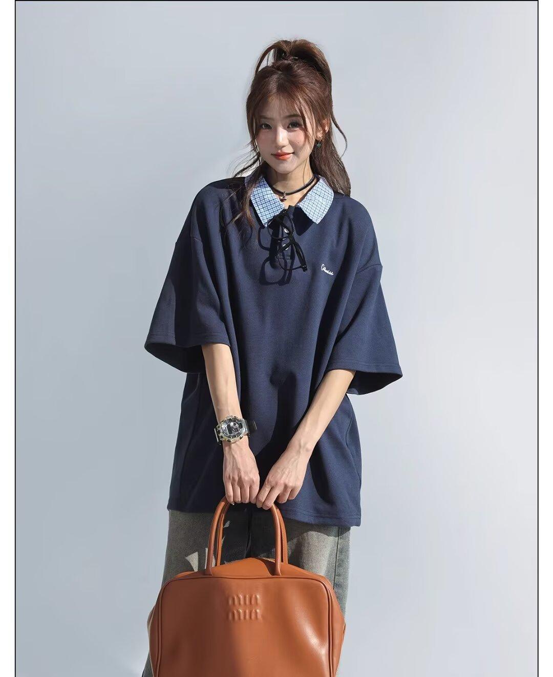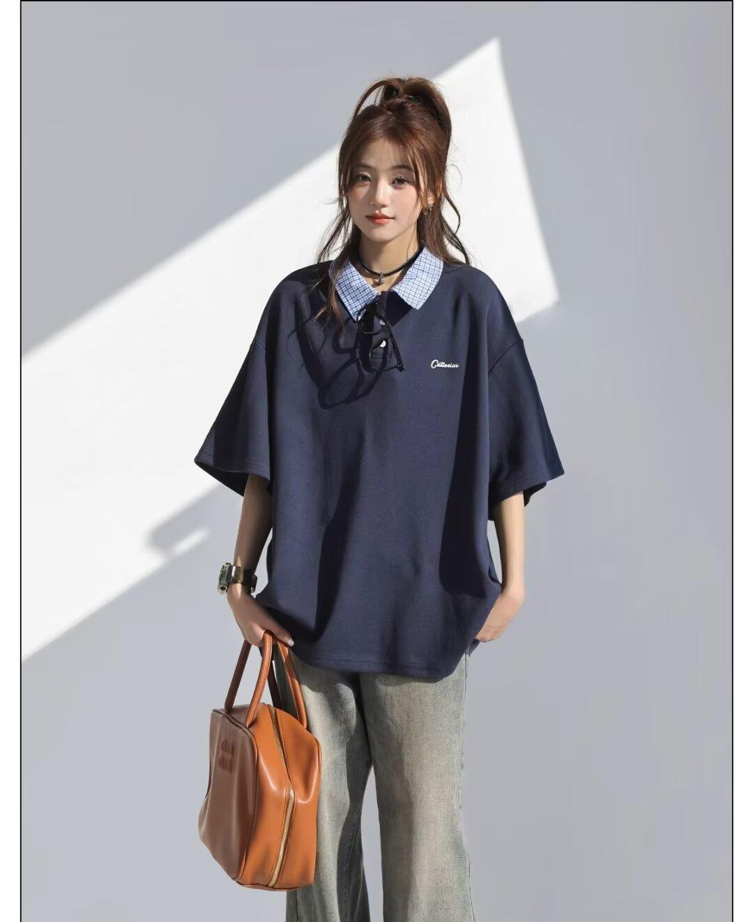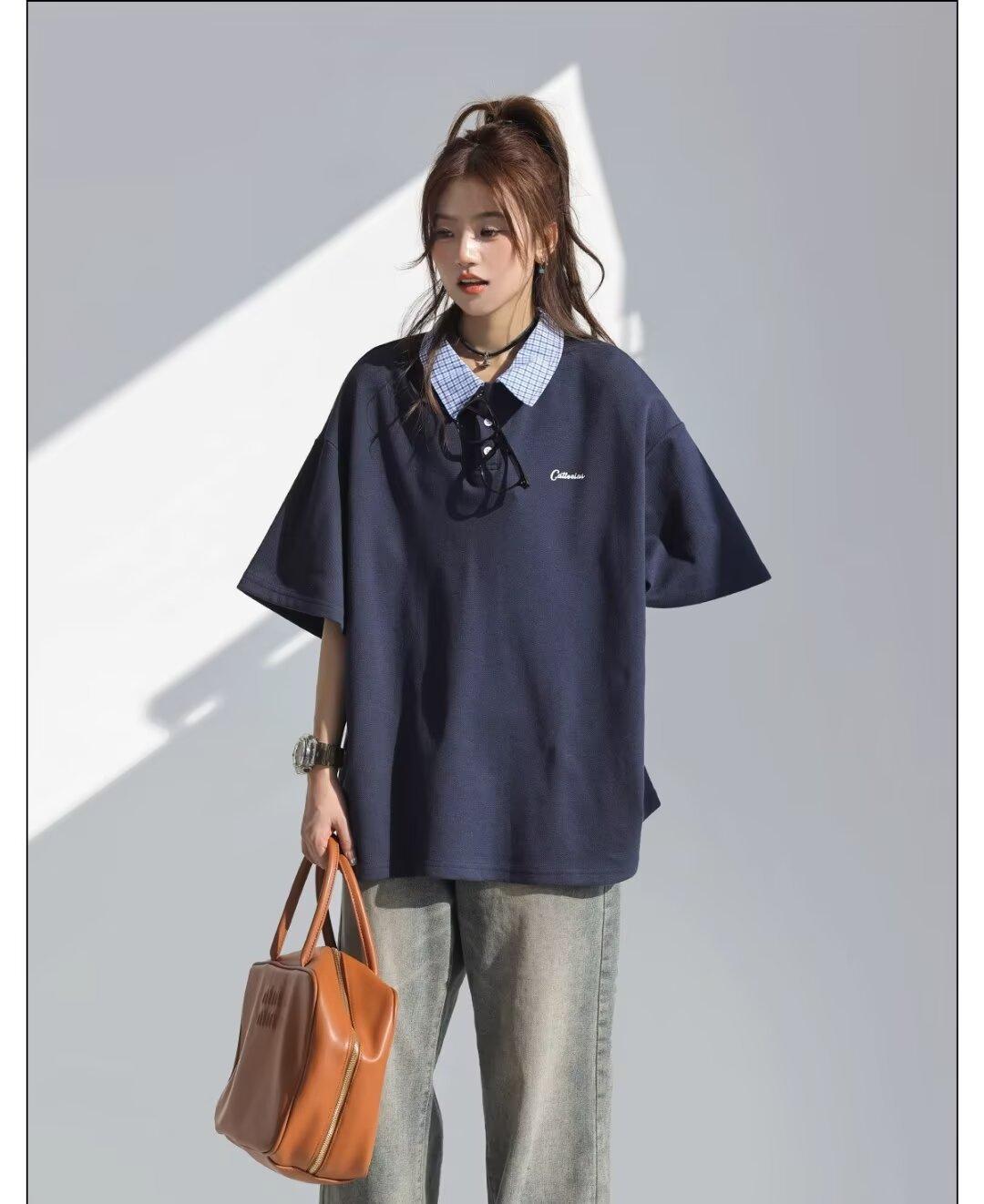 Camisa POLO de Manga Curta Falsa de Duas Peças Estilo Coreano para Menina Bordada Azul Marinho Top Atmosfera Roupa Limpa Camiseta Marca da Moda
