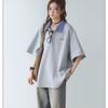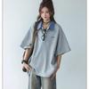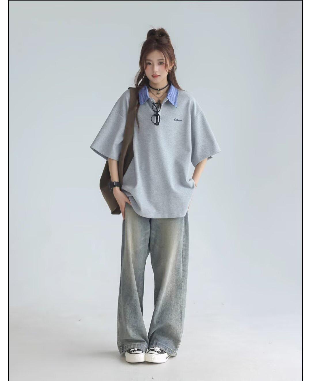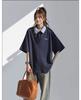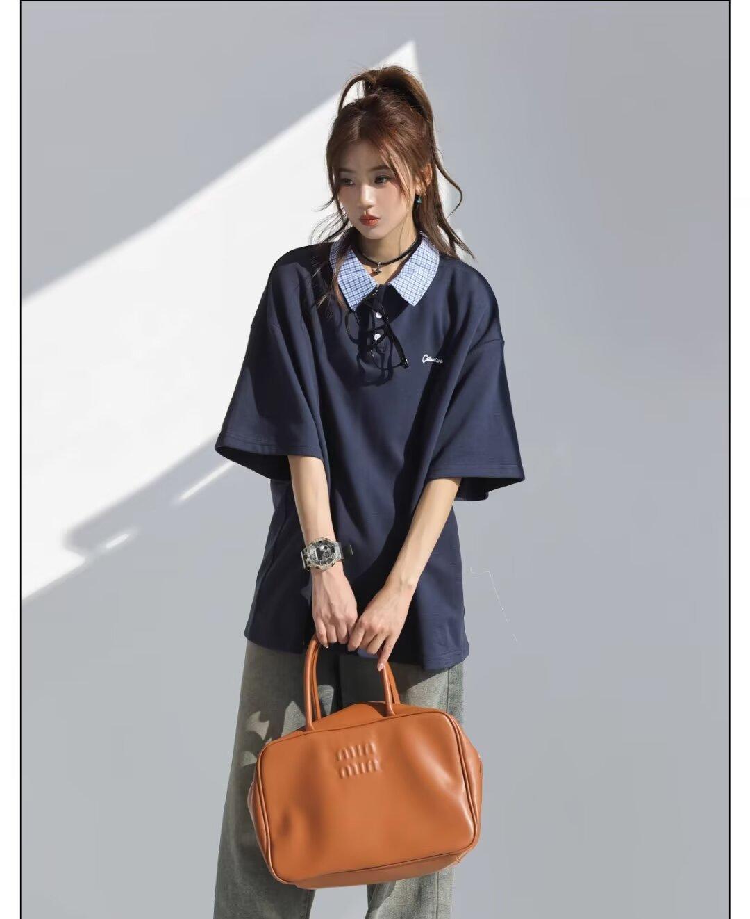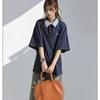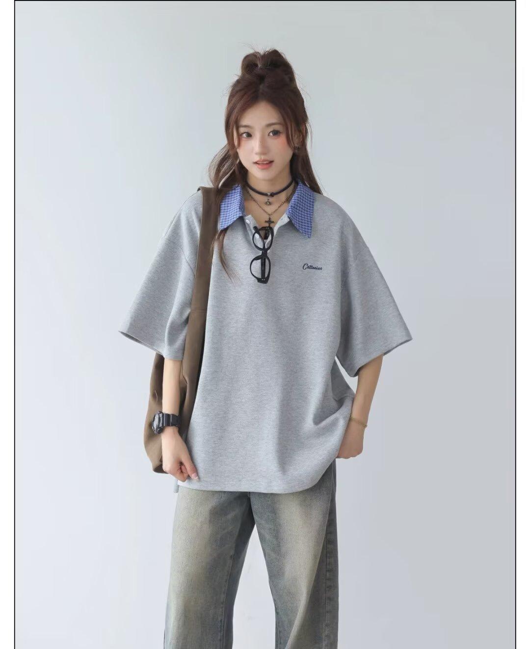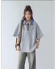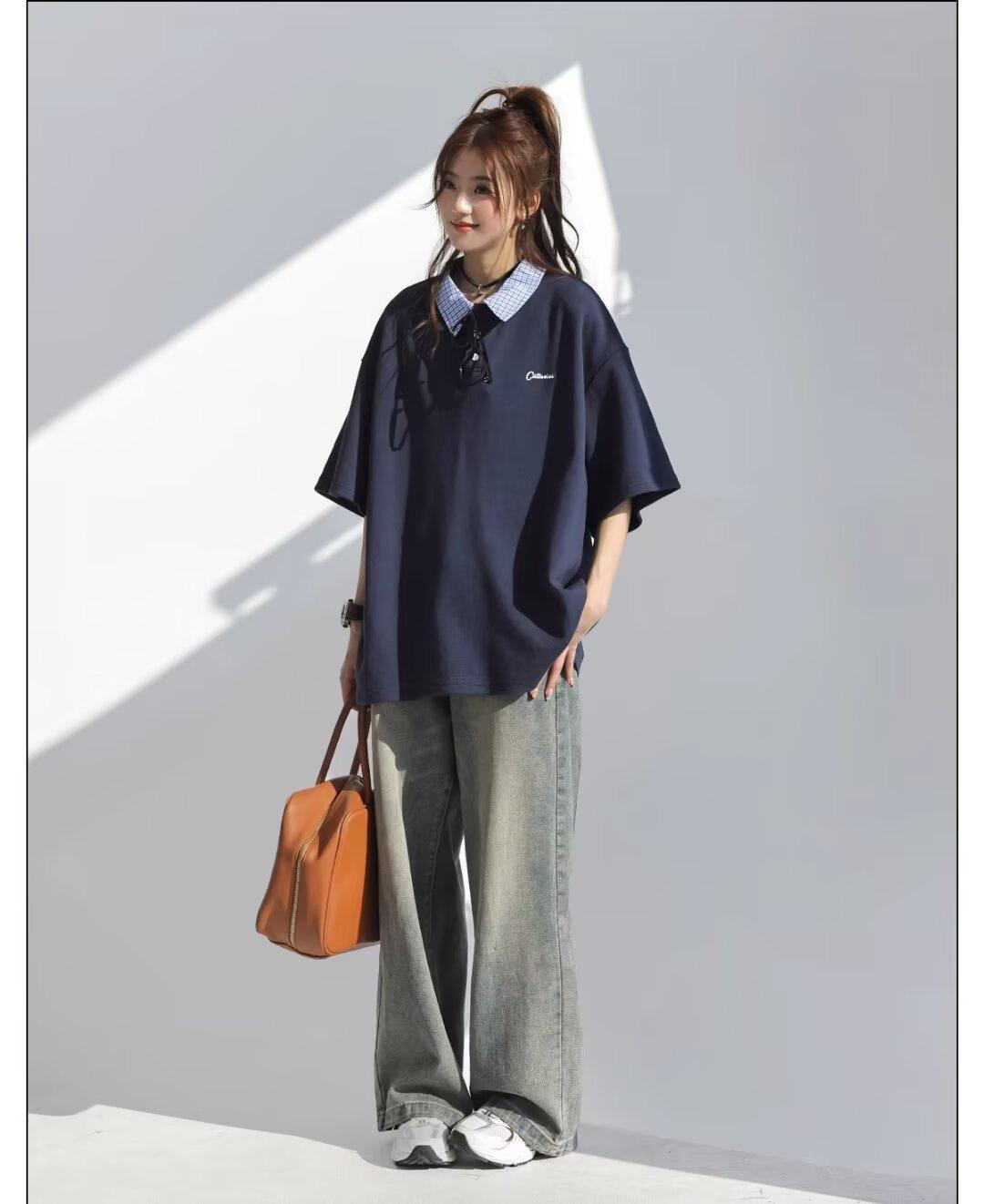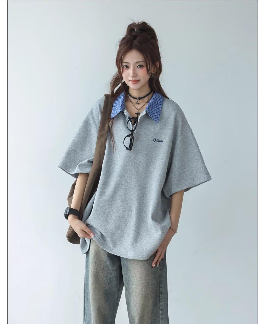 Camisa POLO de Manga Curta Falsa de Duas Peças Estilo Coreano para Menina Bordada Azul Marinho Top Atmosfera Roupa Limpa Camiseta Marca da Moda