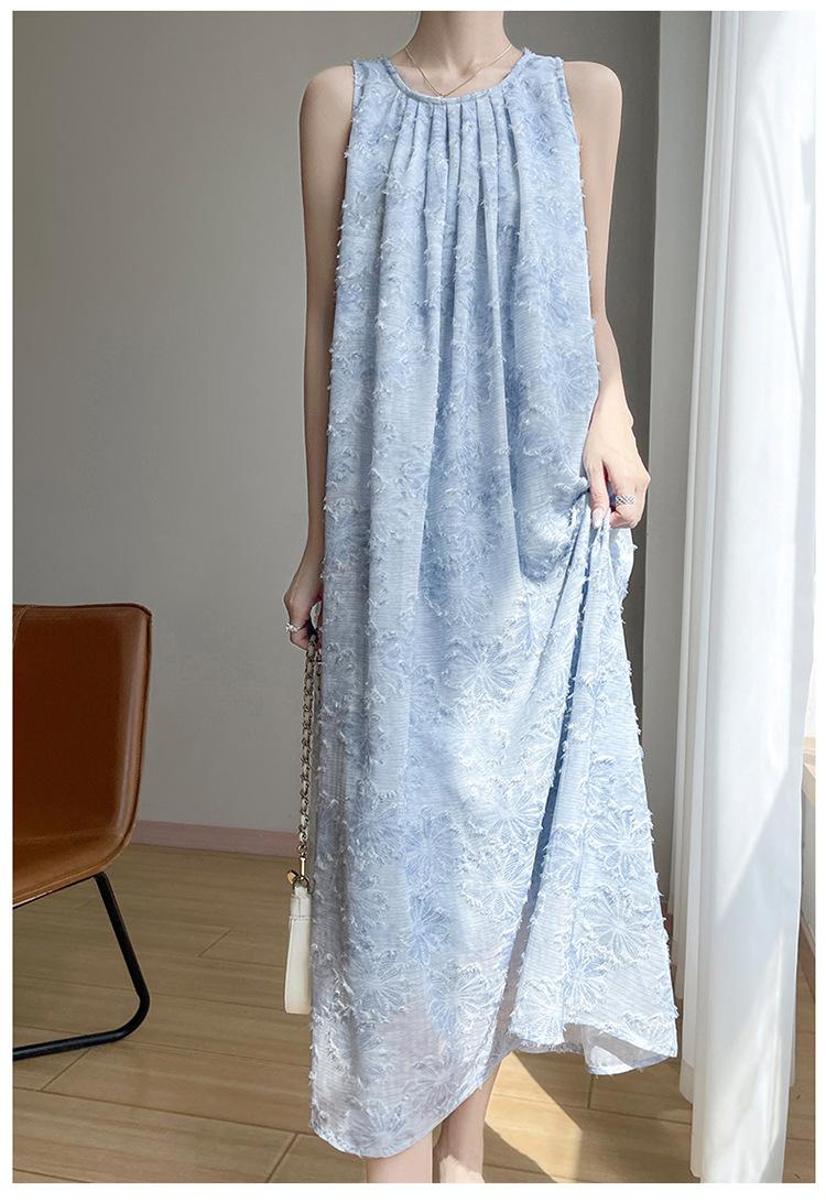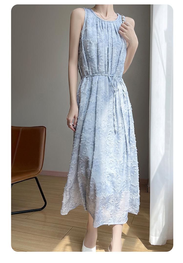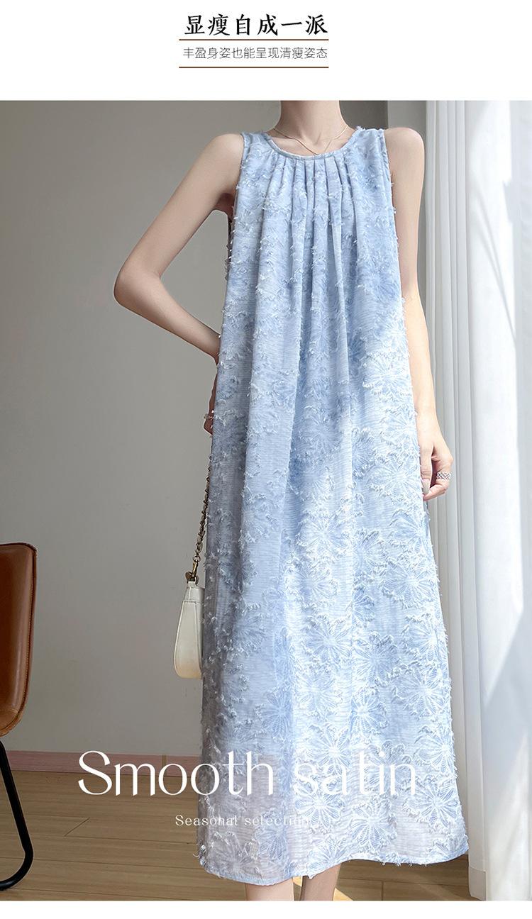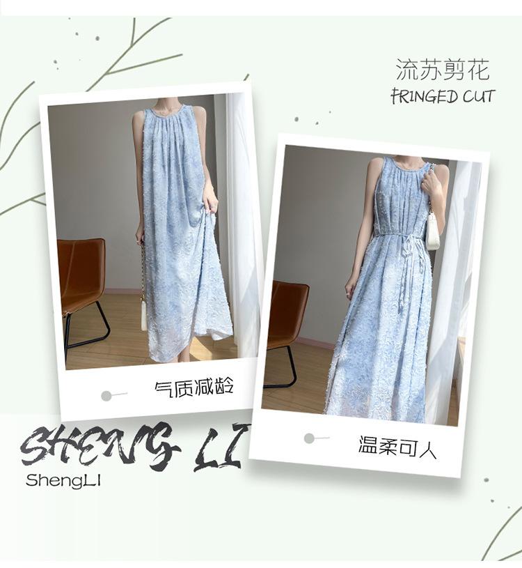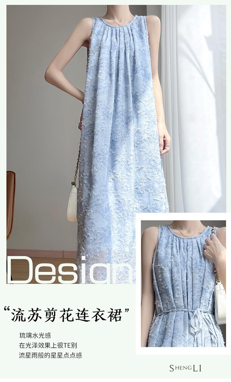 Vestido Novo de Verão 2025 Cetim Gola Careca Sem Mangas Feminino Cadarço Tassel Recorte Flor Solto Azul Vestido Longo