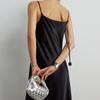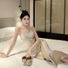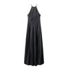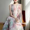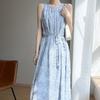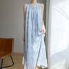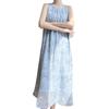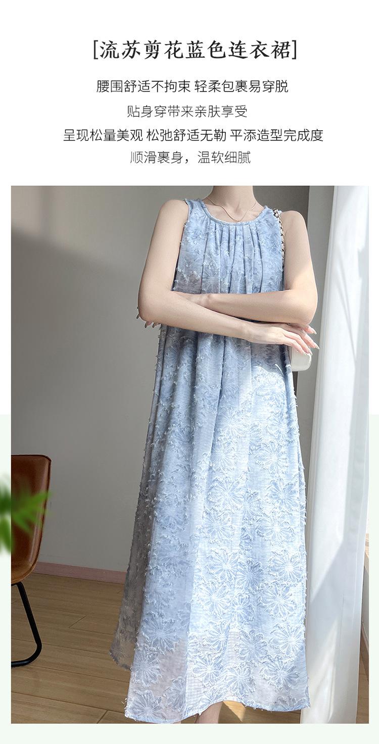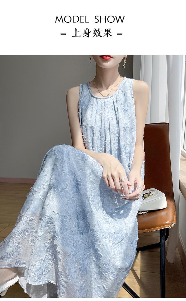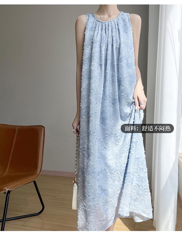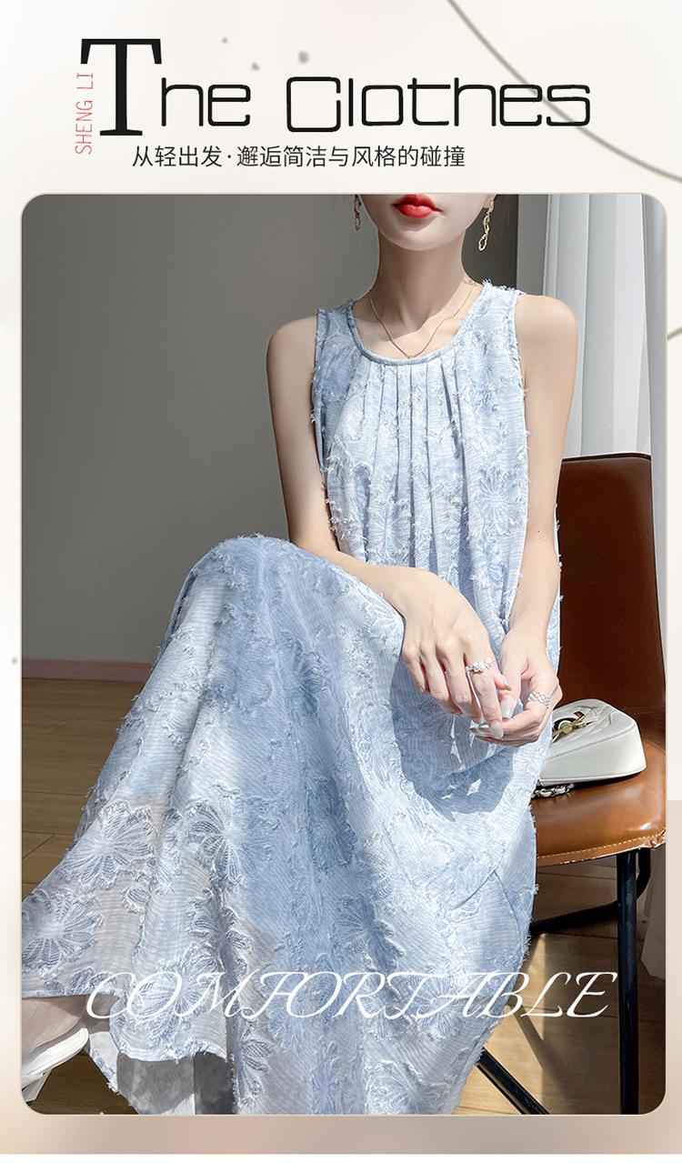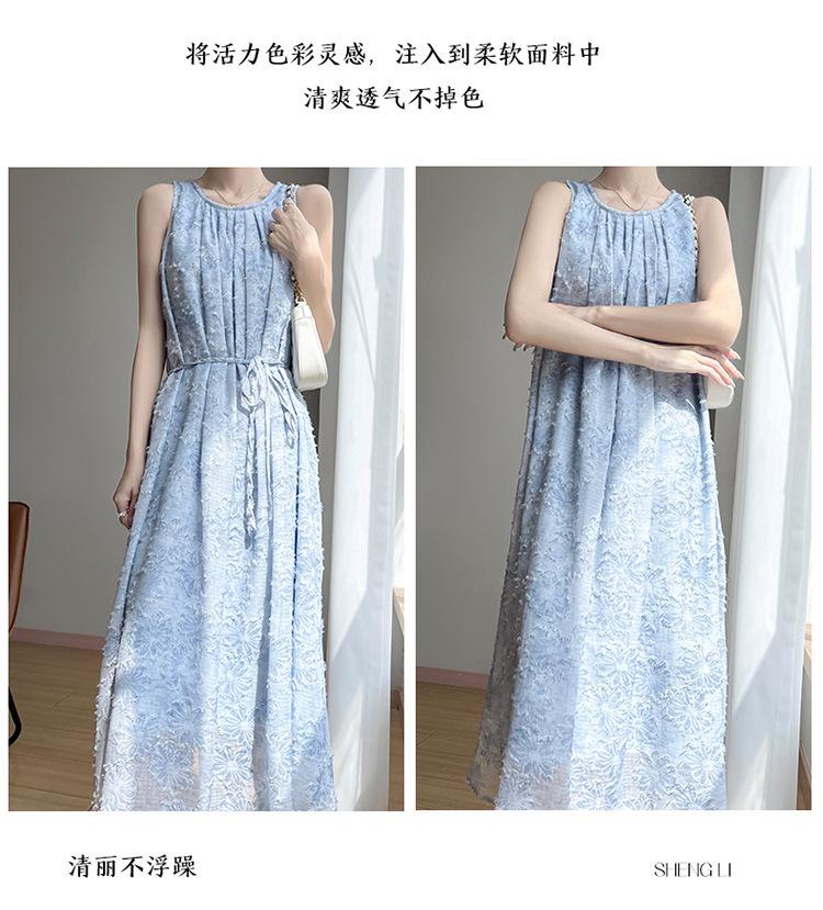 Vestido Novo de Verão 2025 Cetim Gola Careca Sem Mangas Feminino Cadarço Tassel Recorte Flor Solto Azul Vestido Longo