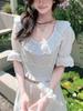 Blusa de Renda Manga Bufante Top Feminino Verão Conjunto Saia Renda Francesa Vazada Top Curto