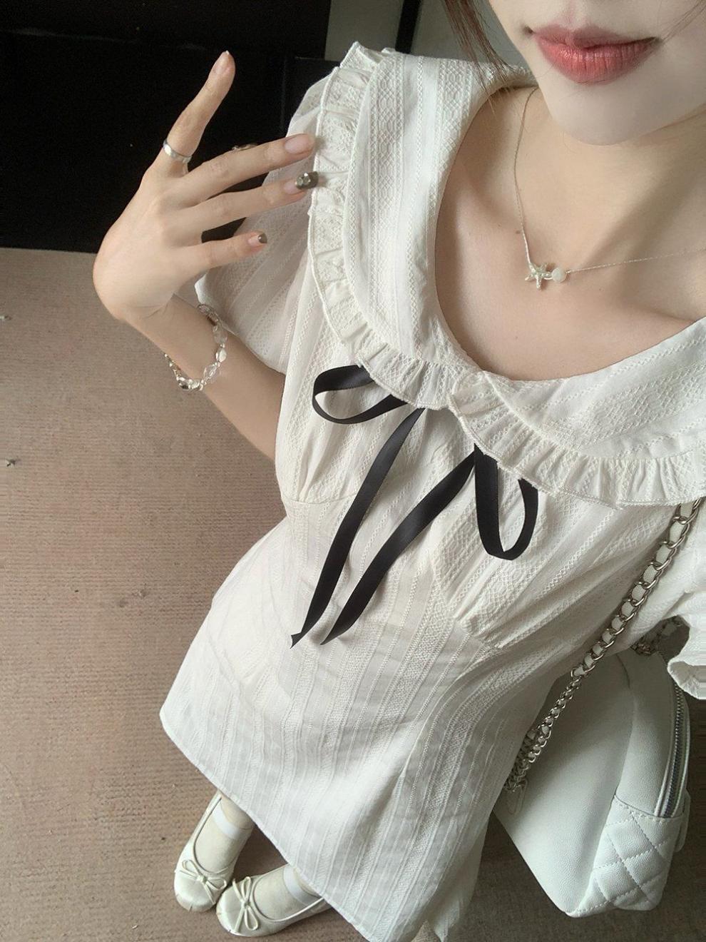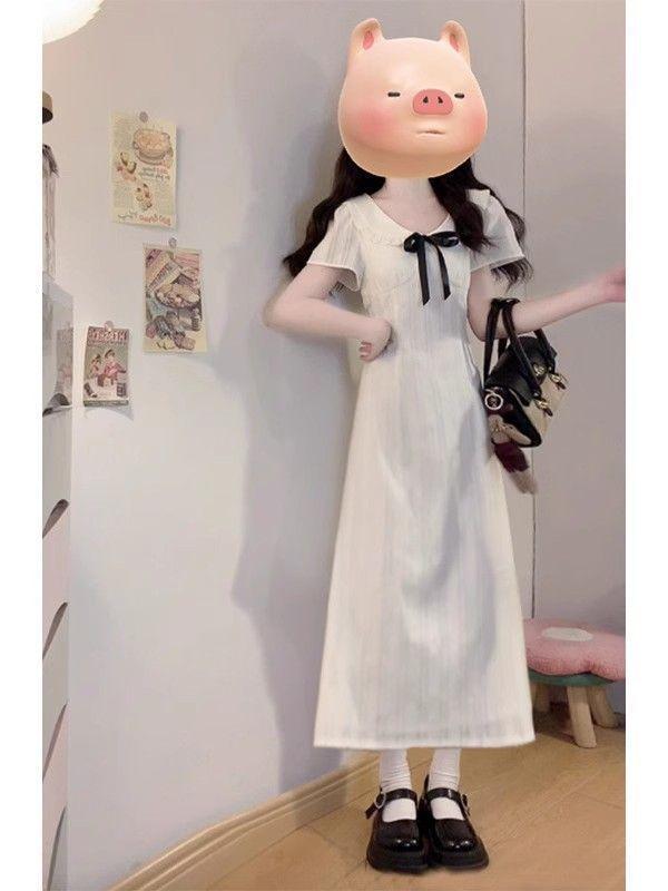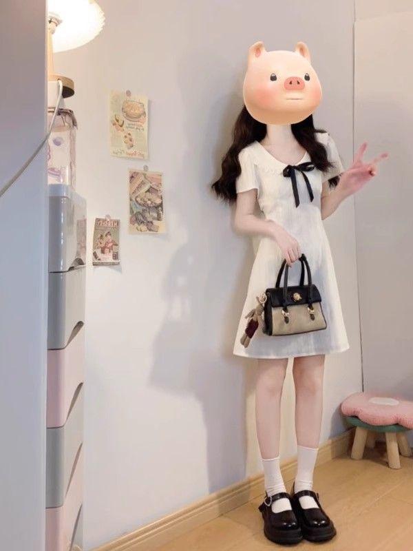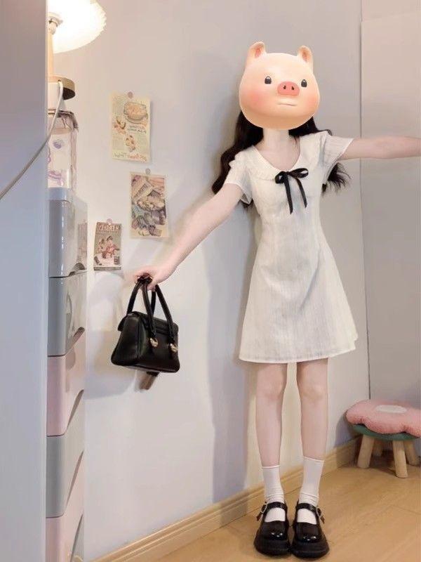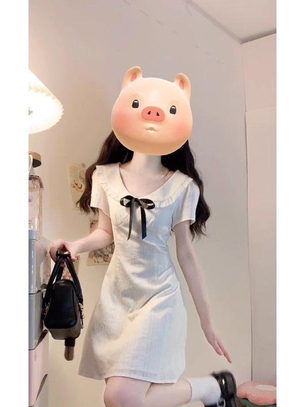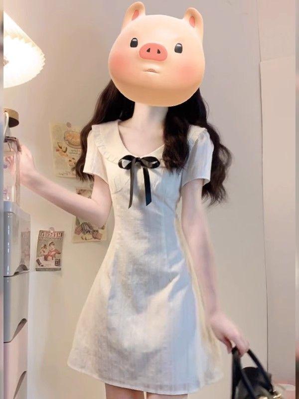 Vestido de manga curta com gola de boneca de renda estilo francês suave, verão 2025, novo estilo, cintura fina, visual elegante, saia curta para mulheres