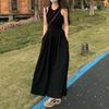 [Saia Hepburn] Vestido longo preto minimalista em linho sem mangas que afina a silhueta, moda casual de verão