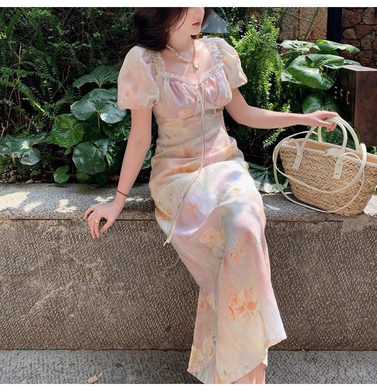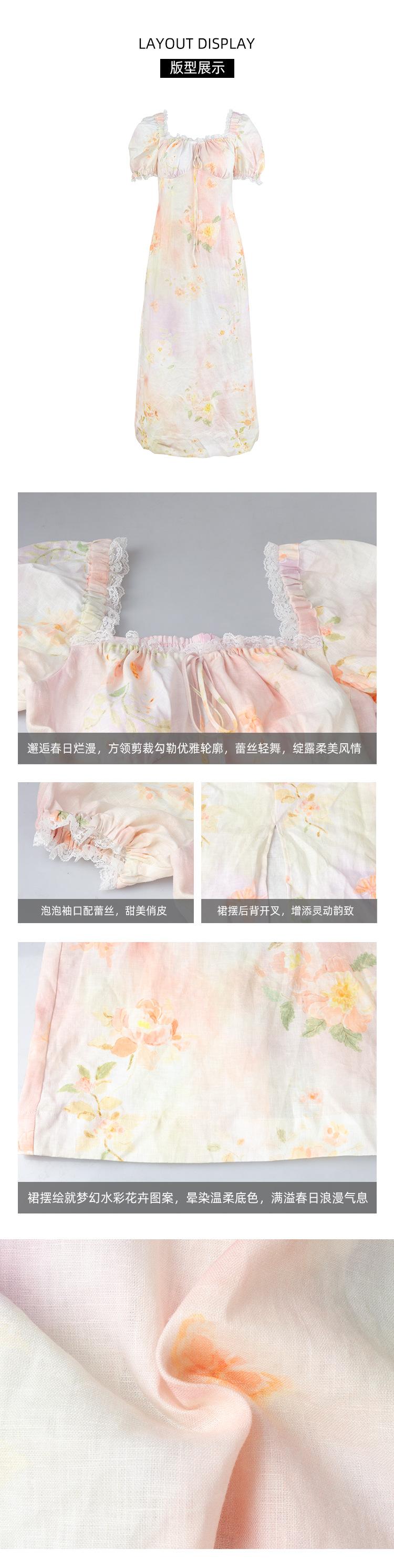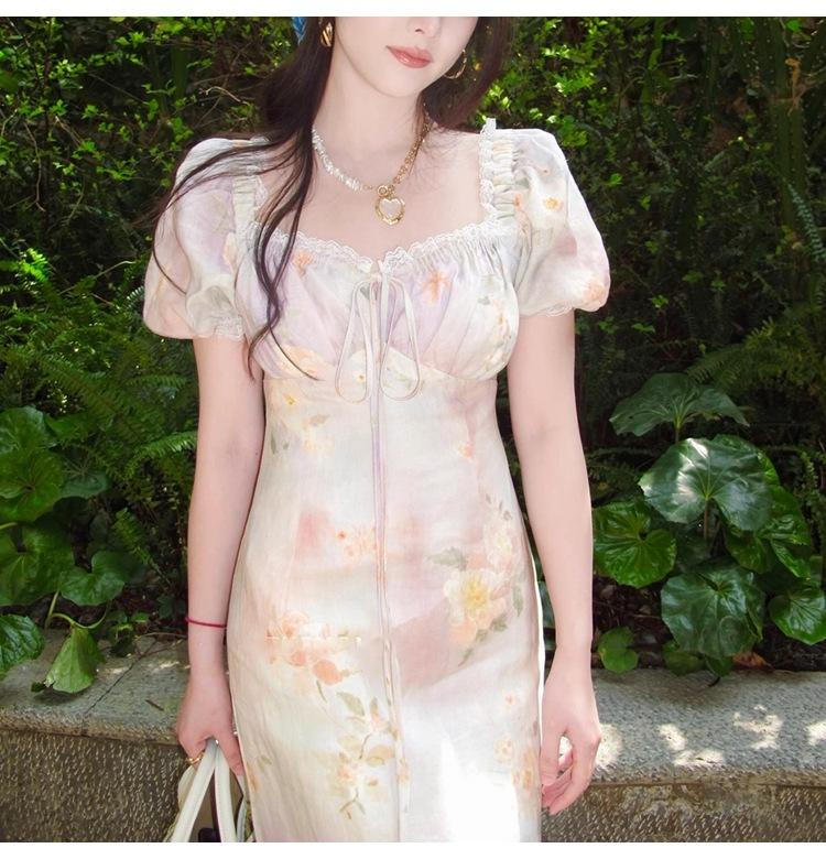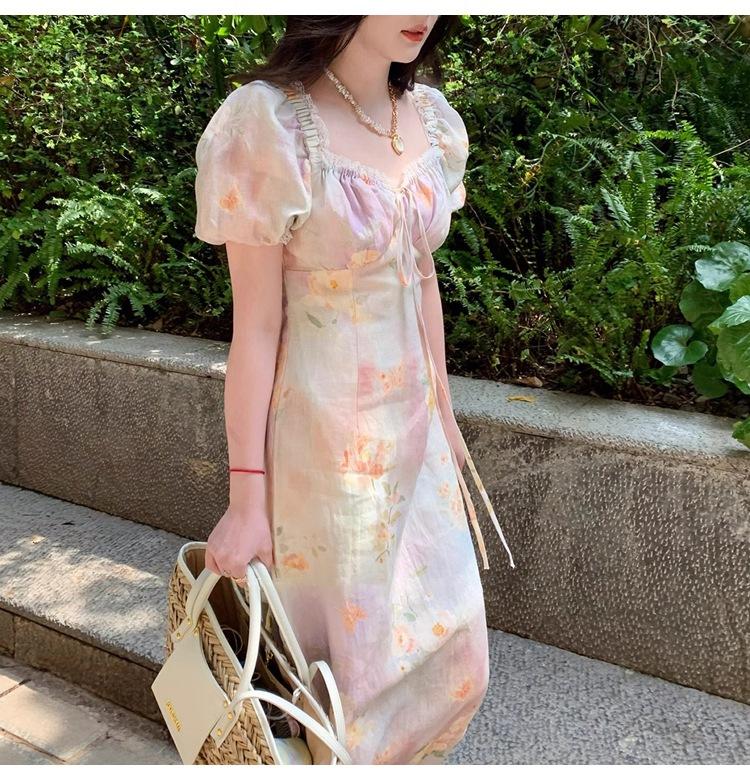 Senna Qimeng Vestido de Linho Estampado Slim Look Feito à Mão Estilo Francês Estilo Nacional Estampado Manga Bufante Vestido Cintura Justa