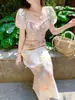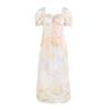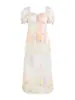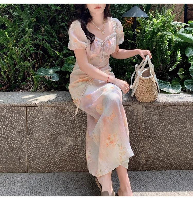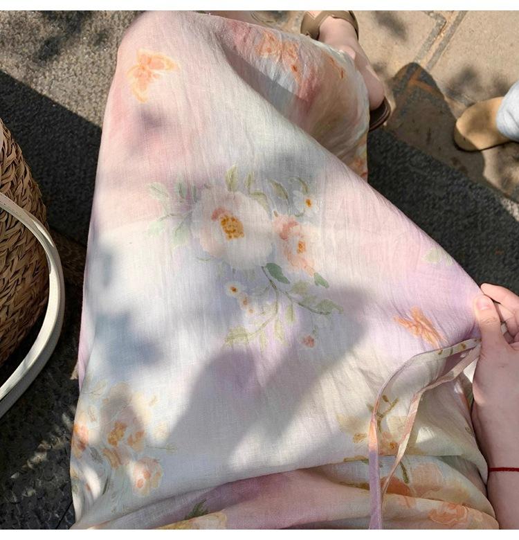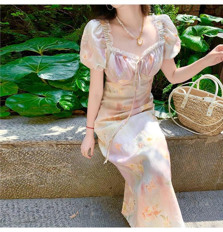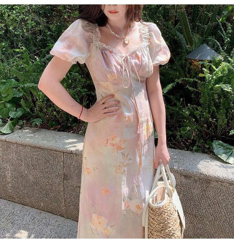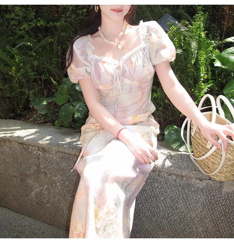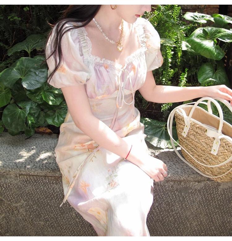 Senna Qimeng Vestido de Linho Estampado Slim Look Feito à Mão Estilo Francês Estilo Nacional Estampado Manga Bufante Vestido Cintura Justa