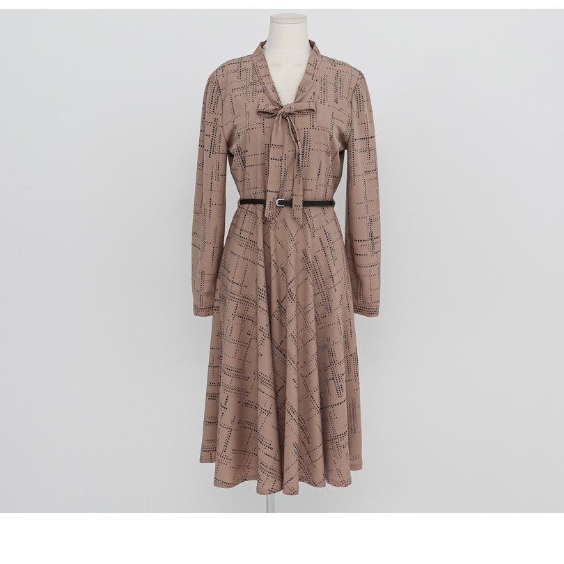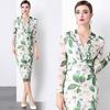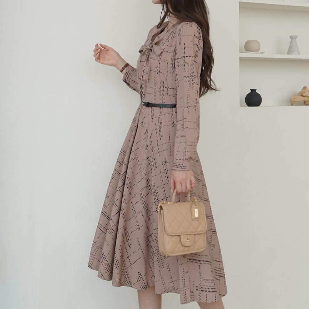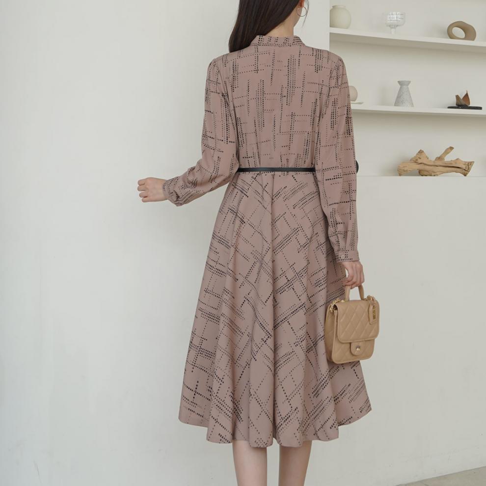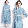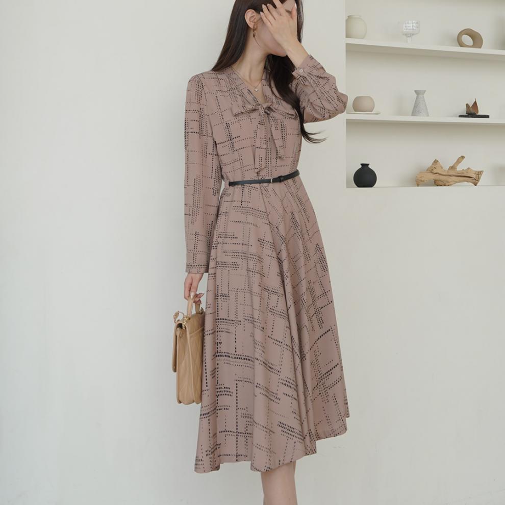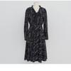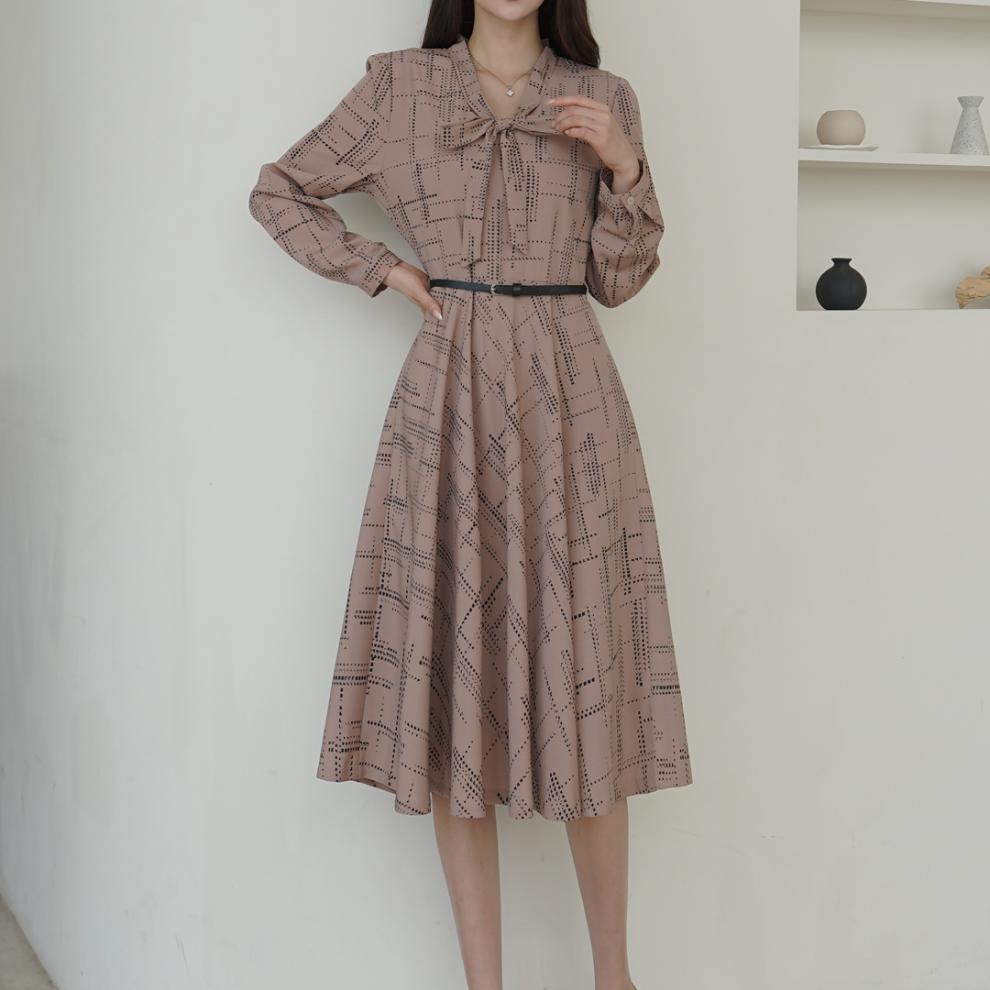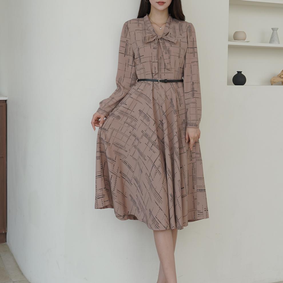 2024 Novo Vestido Feminino Plus Size de Manga Comprida com Colarinho de Fita em V, Estampa Abstrata, Slim, Saia Longa com Cinto