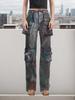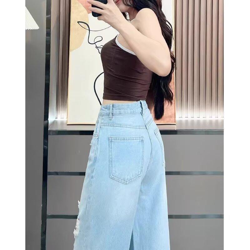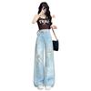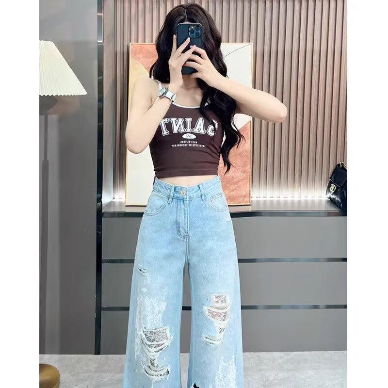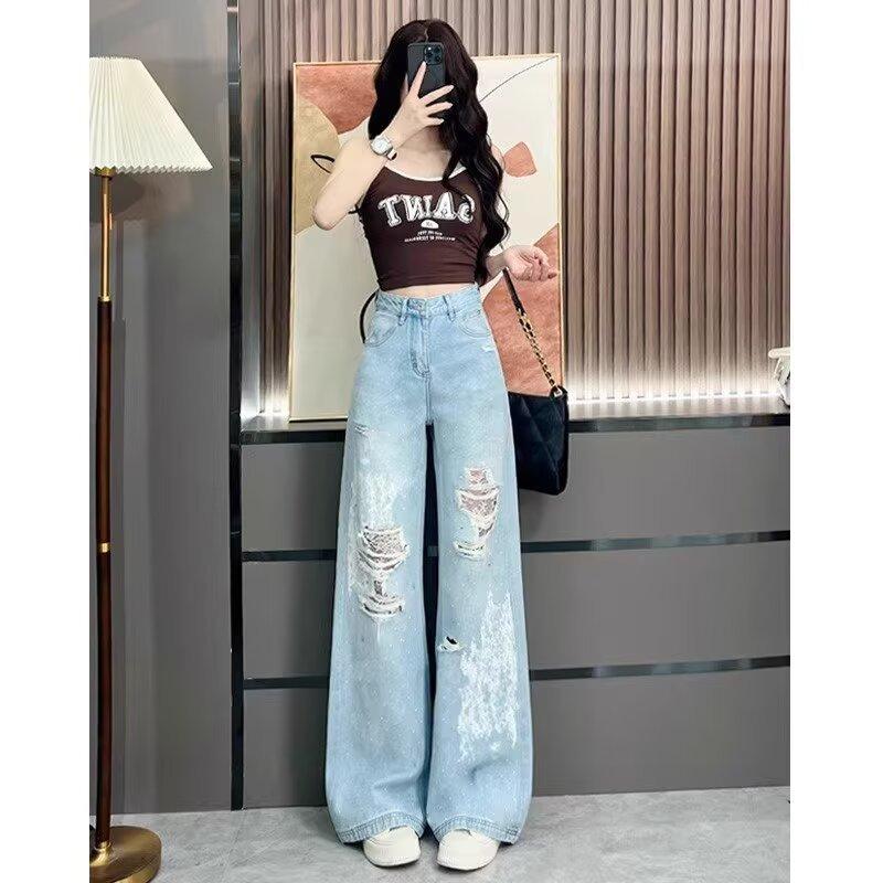 Calça Jeans Reta de Cintura Alta com Strass Pesado de Luxo Estilo Europeu 2025 Primavera Nicho Comprimento Total Rasgada para Mulheres Tendência