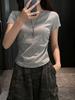 Camiseta de Ombro com Decote V Estilo Americano Feminina Manga Curta Design de Alto Nível Stretch Amassado Ajuste Slim Top de Verão Roupa Feminina Estilo Coreano