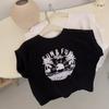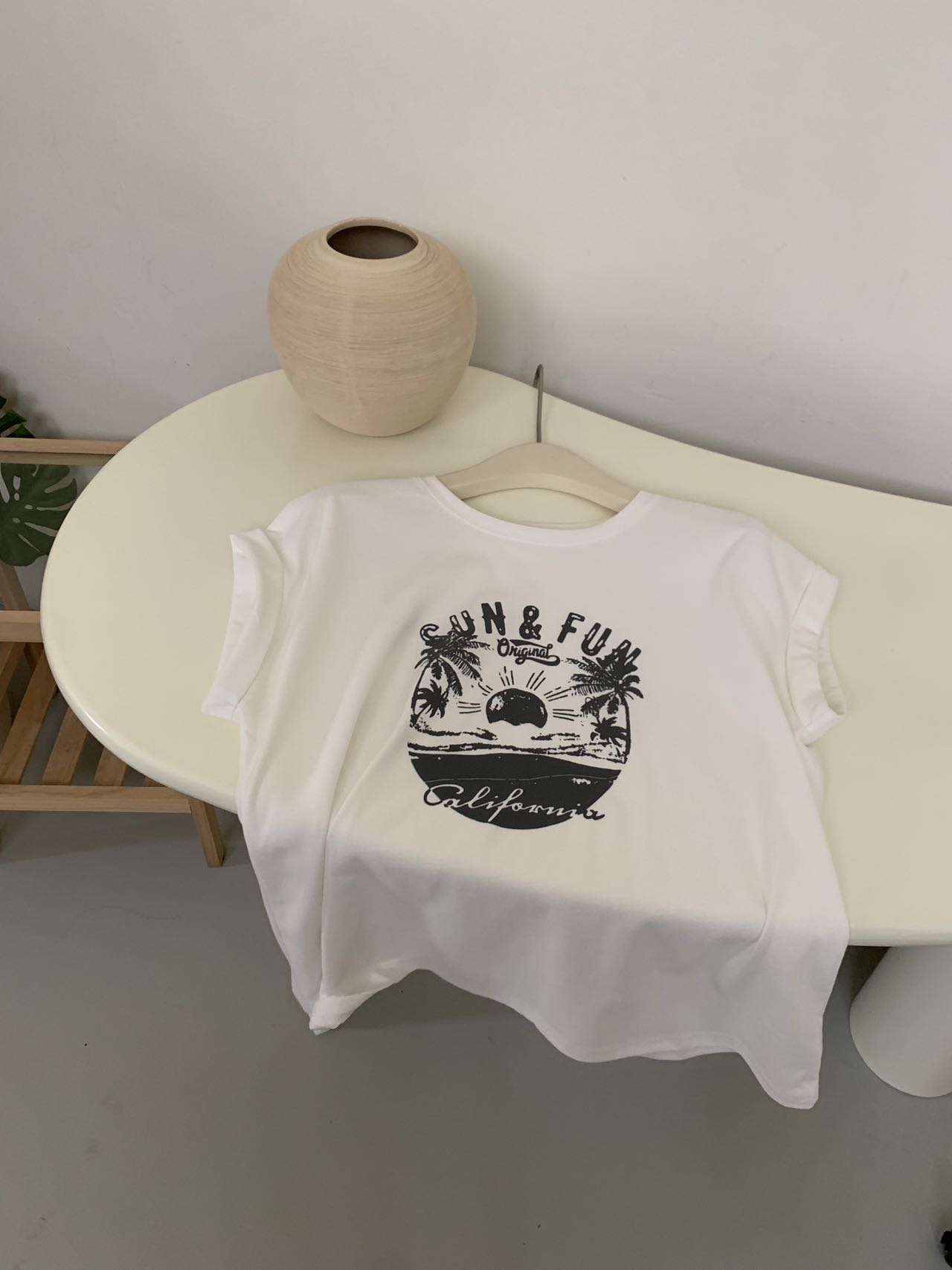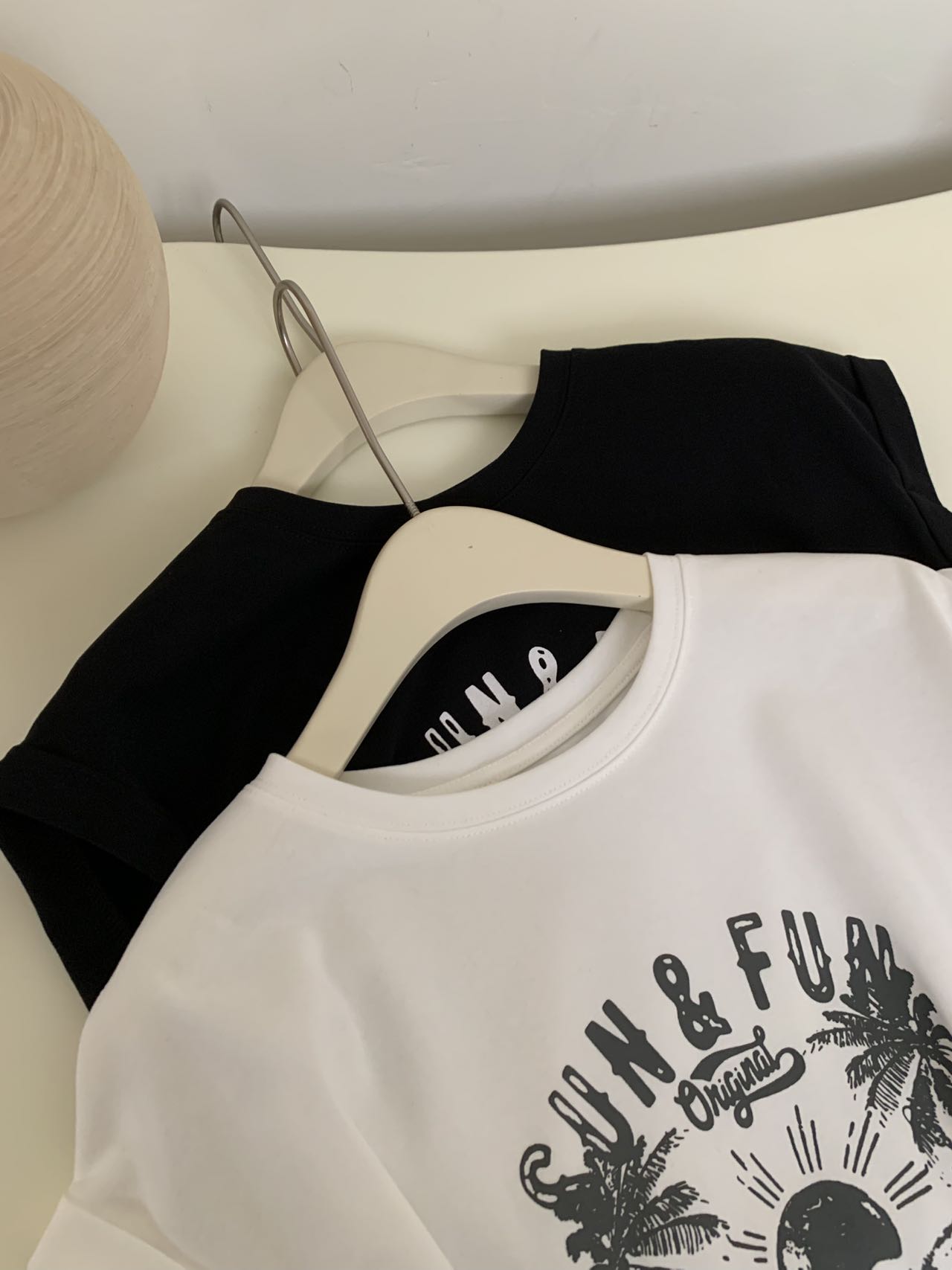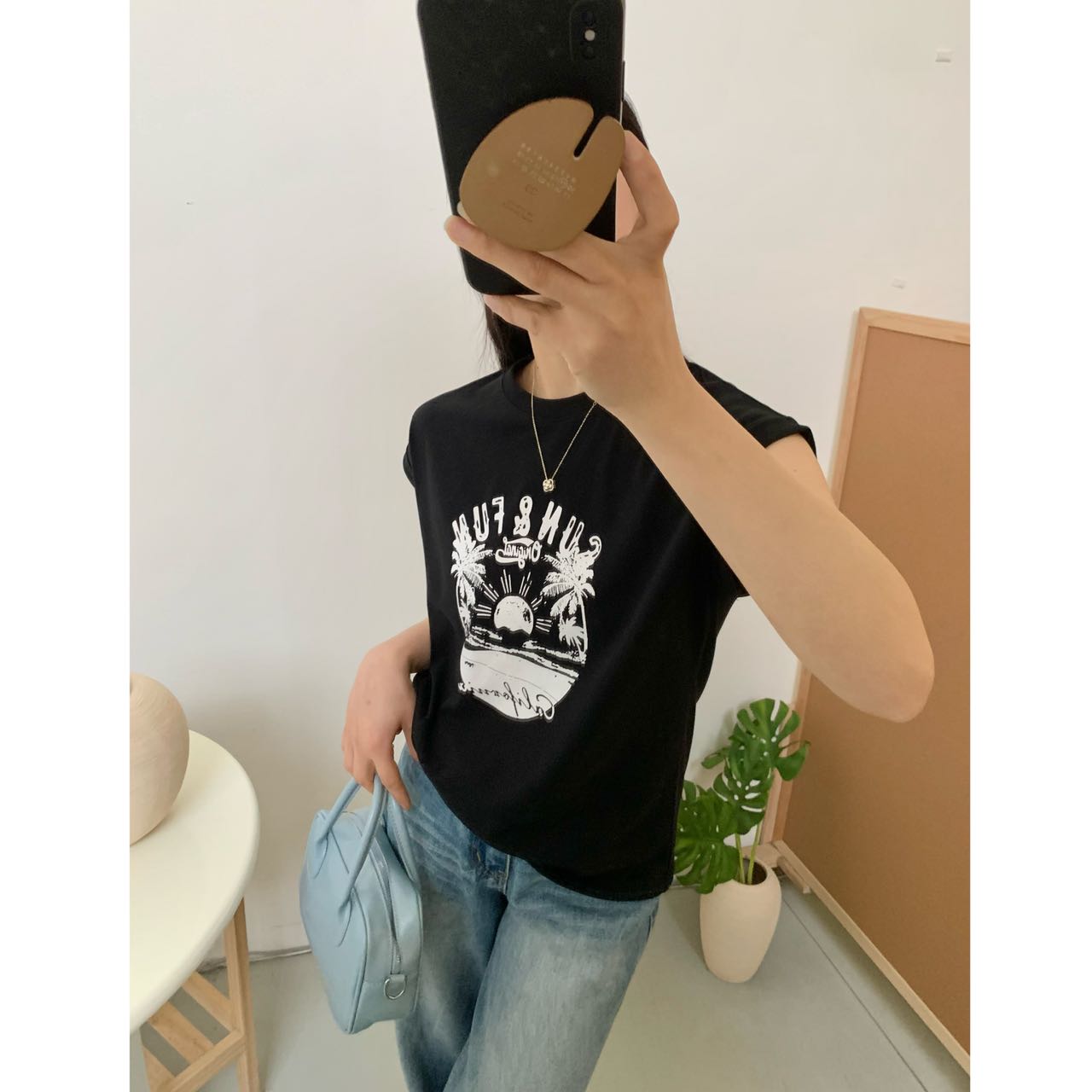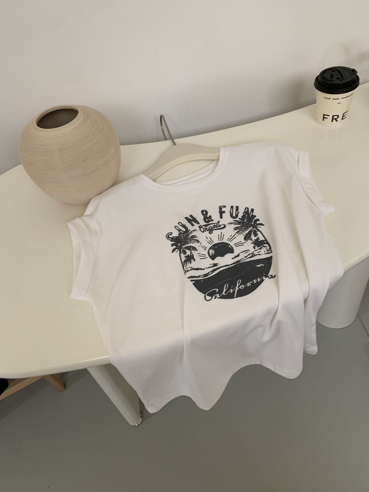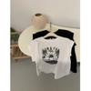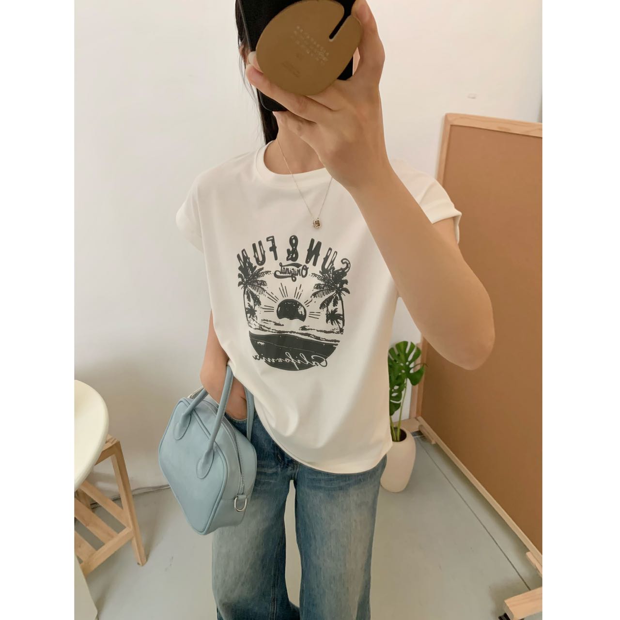 2025 Verão Nova Camiseta Estampada Retrô Americana de Manga Babado para Mulheres, Top Casual Simples e Versátil, Camiseta Básica Americana da Moda