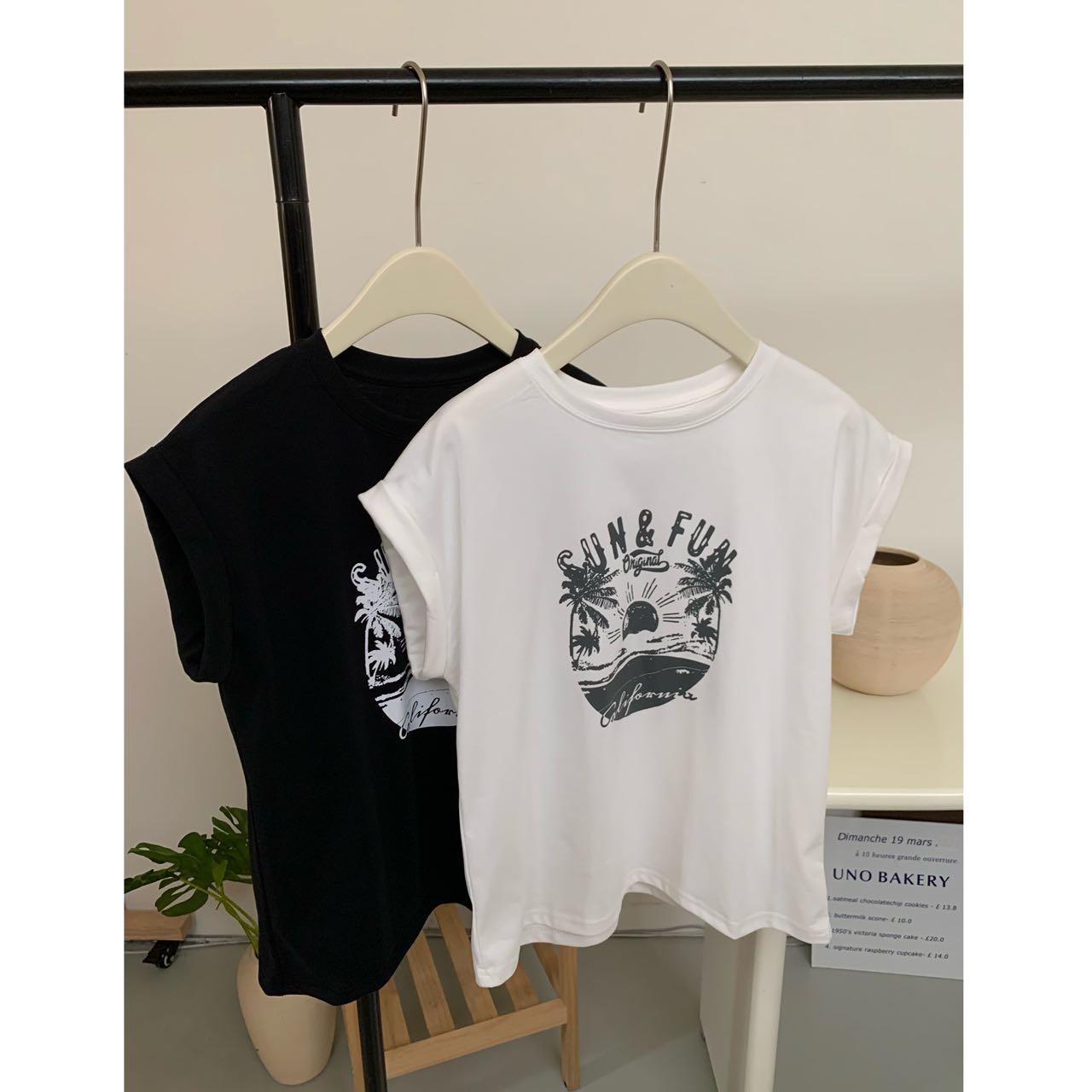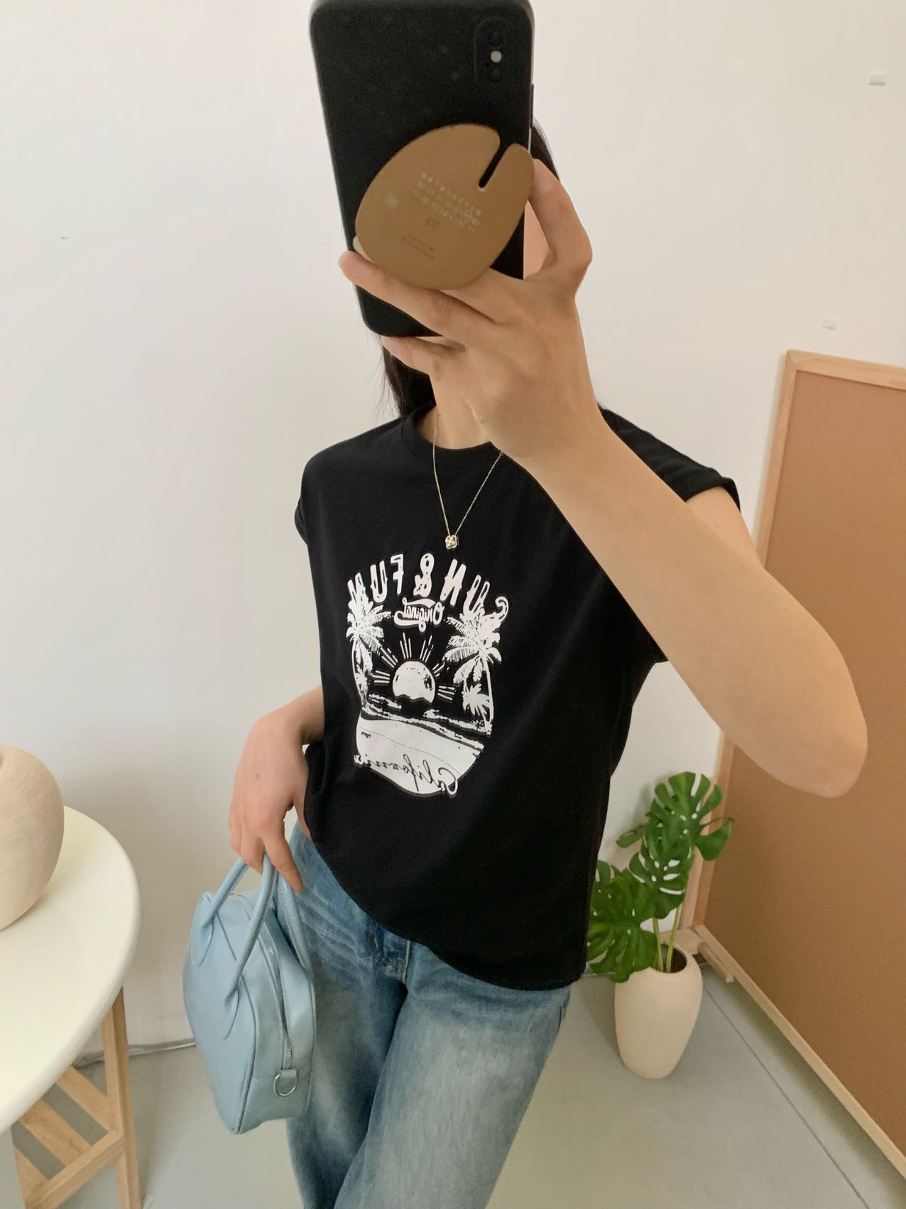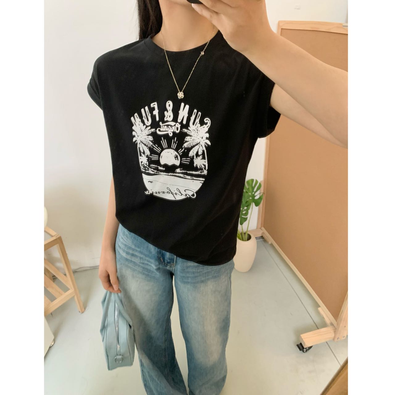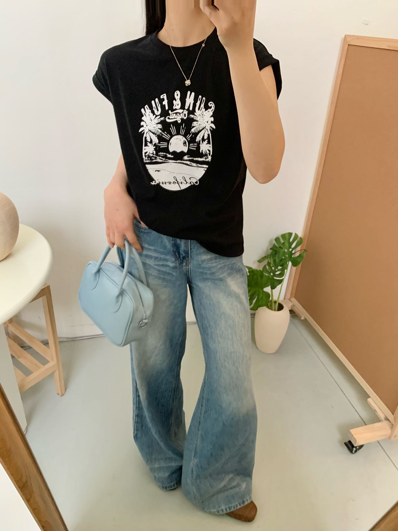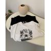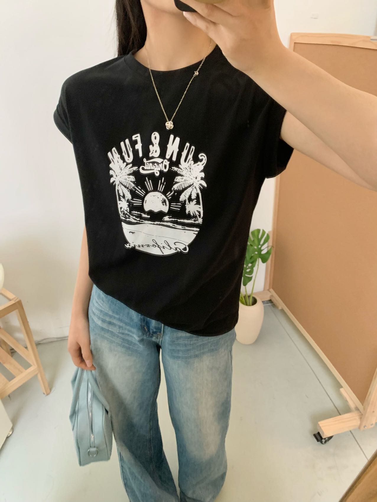 2025 Verão Nova Camiseta Estampada Retrô Americana de Manga Babado para Mulheres, Top Casual Simples e Versátil, Camiseta Básica Americana da Moda