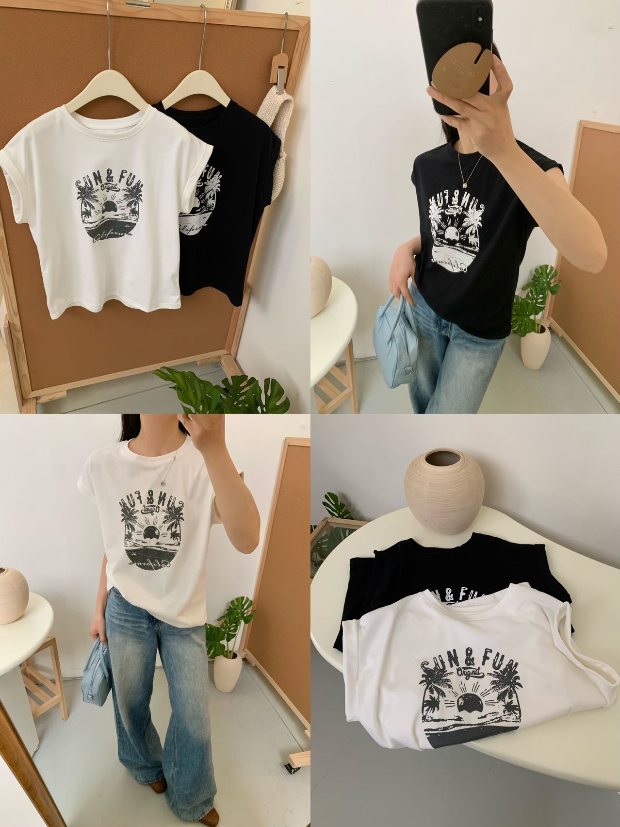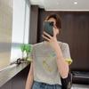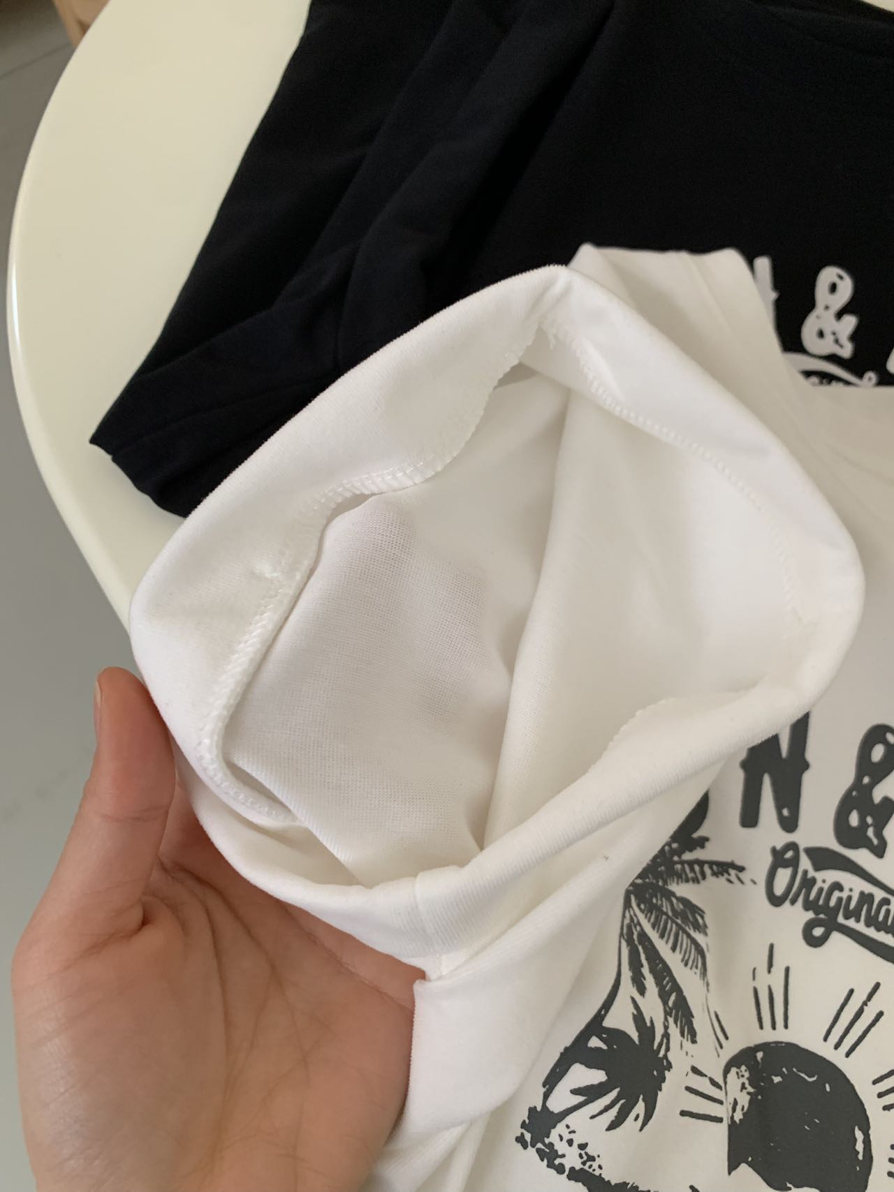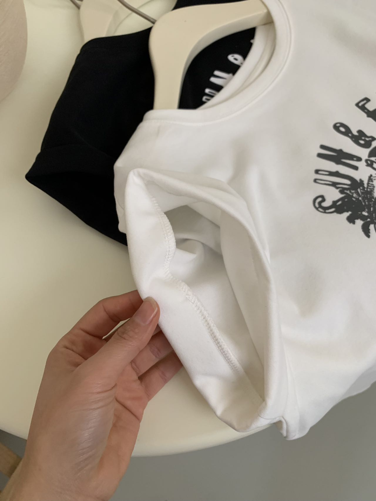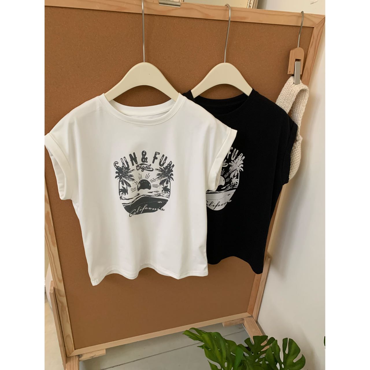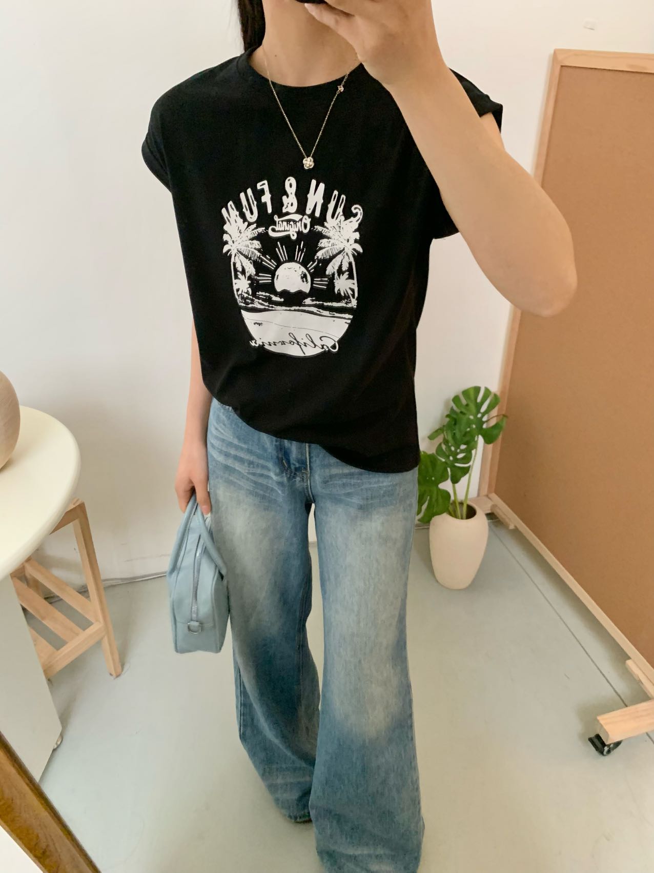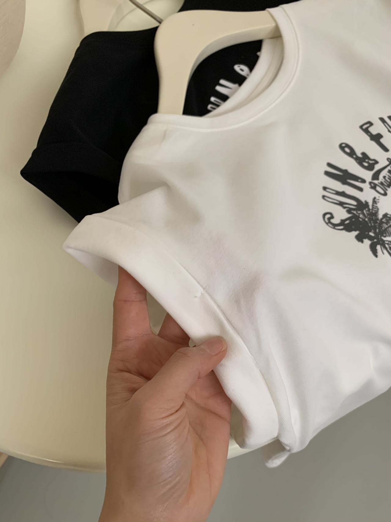 2025 Verão Nova Camiseta Estampada Retrô Americana de Manga Babado para Mulheres, Top Casual Simples e Versátil, Camiseta Básica Americana da Moda
