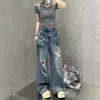 Jeans Plus Size Rasgados com Barra Desfiada para Mulheres 2025 Novo Fat mm Solto Cintura Alta Slim Calça Reta Nove Pontos Perna Larga