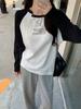 Camiseta Feminina de Manga Longa Raglan de Algodão Puro com Costura Contrastante Preto e Branco Nicho 2025 Primavera Outono Inverno Europeu Top para Usar por Baixo