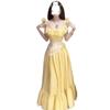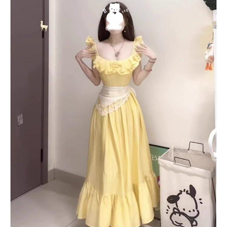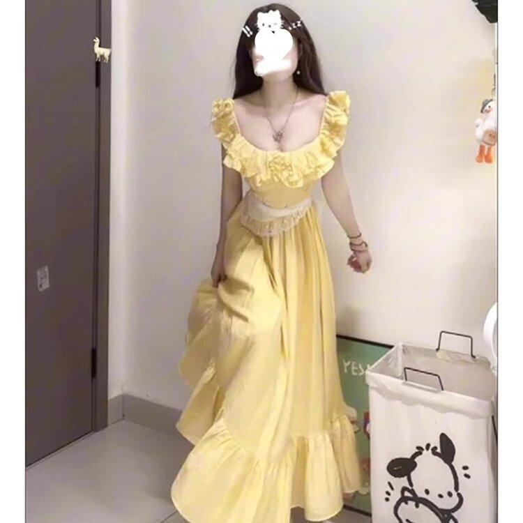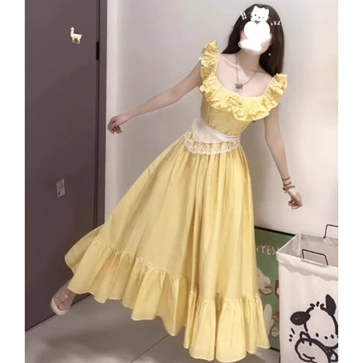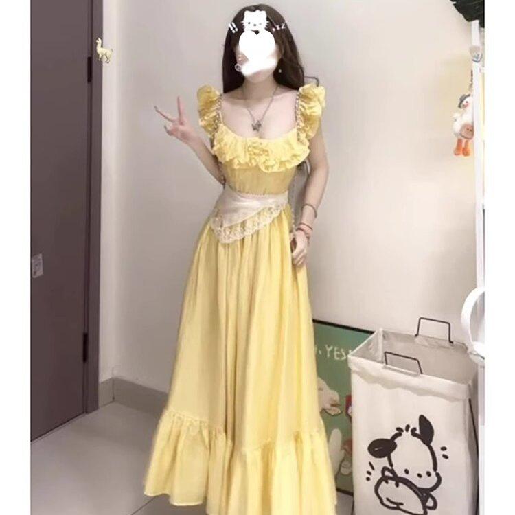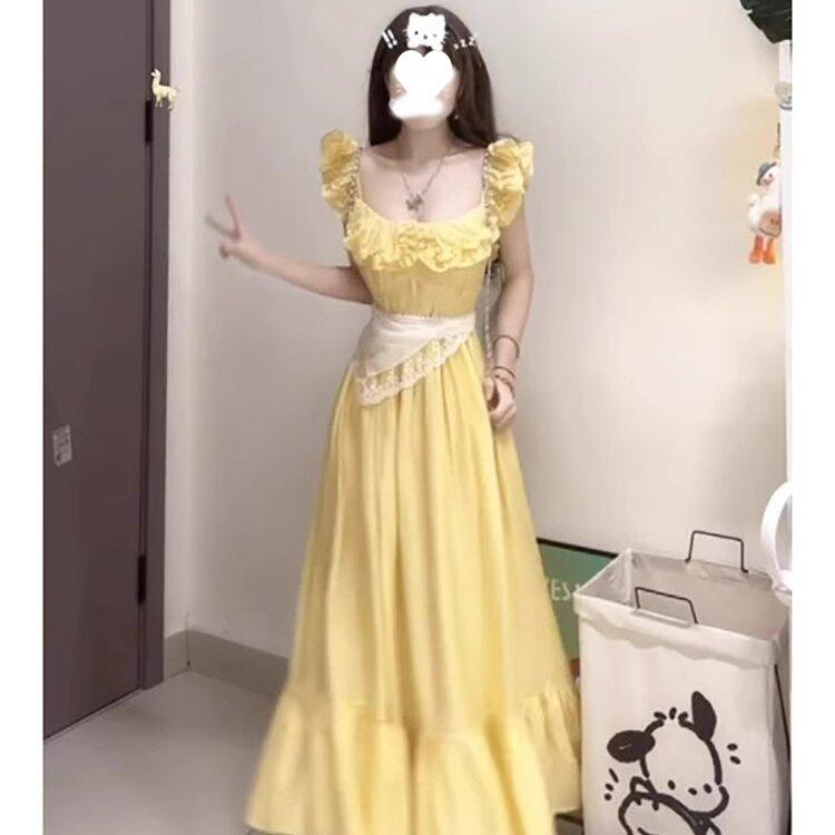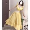 [com Lenço de Seda] Saia com Cintura e Elegante Vestido Francês Doce Amarelo de Manga Pequena Voadora para Mulheres