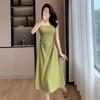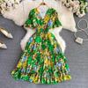 2025 Novo Temperamento Vento Suave Vestido Estampado Feminino Verão Sensação Onda de Água Azul Decote Quadrado Cintura Saia
